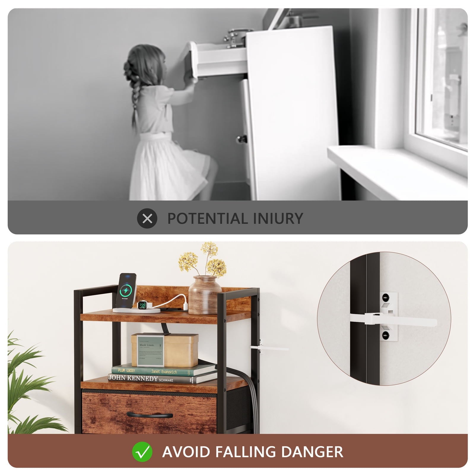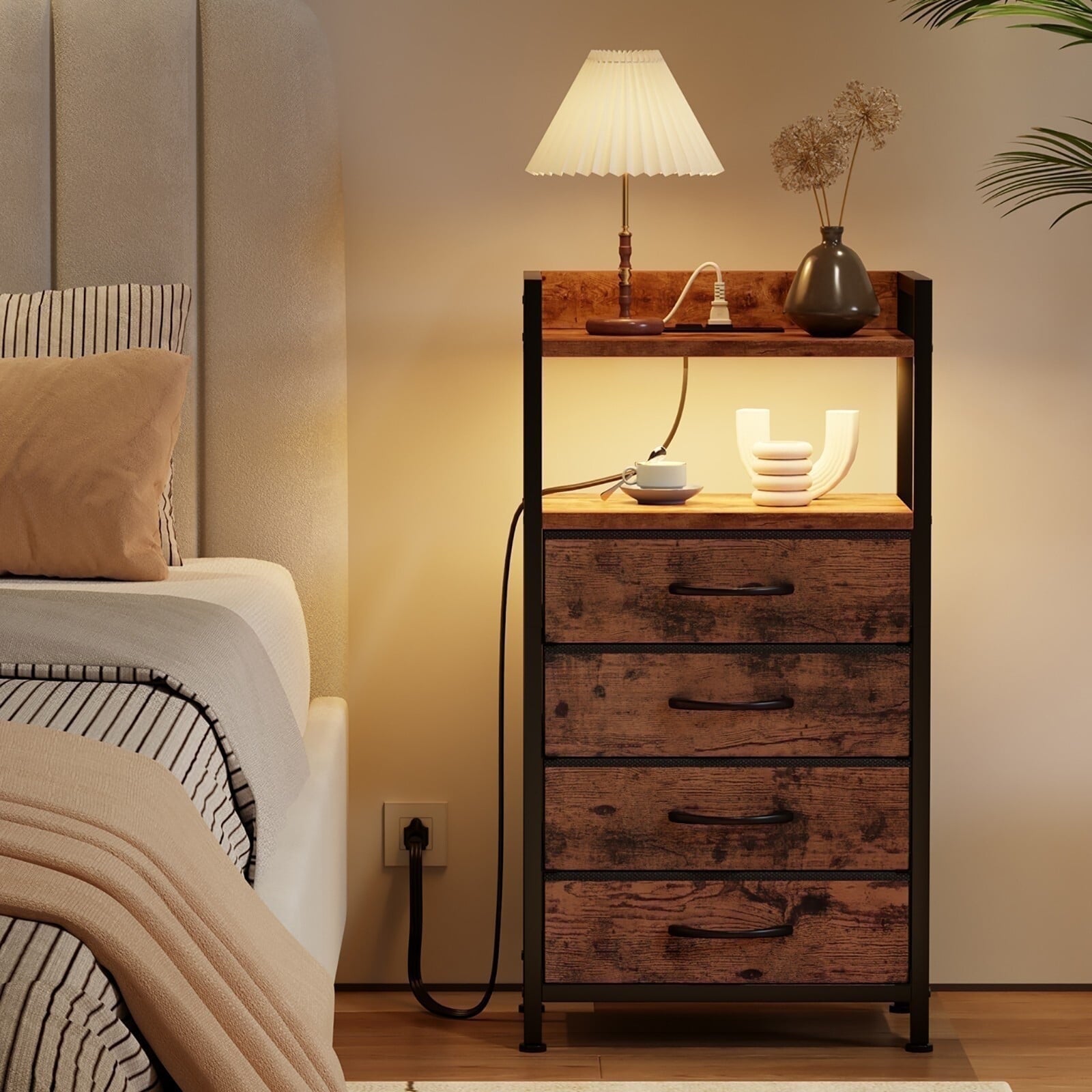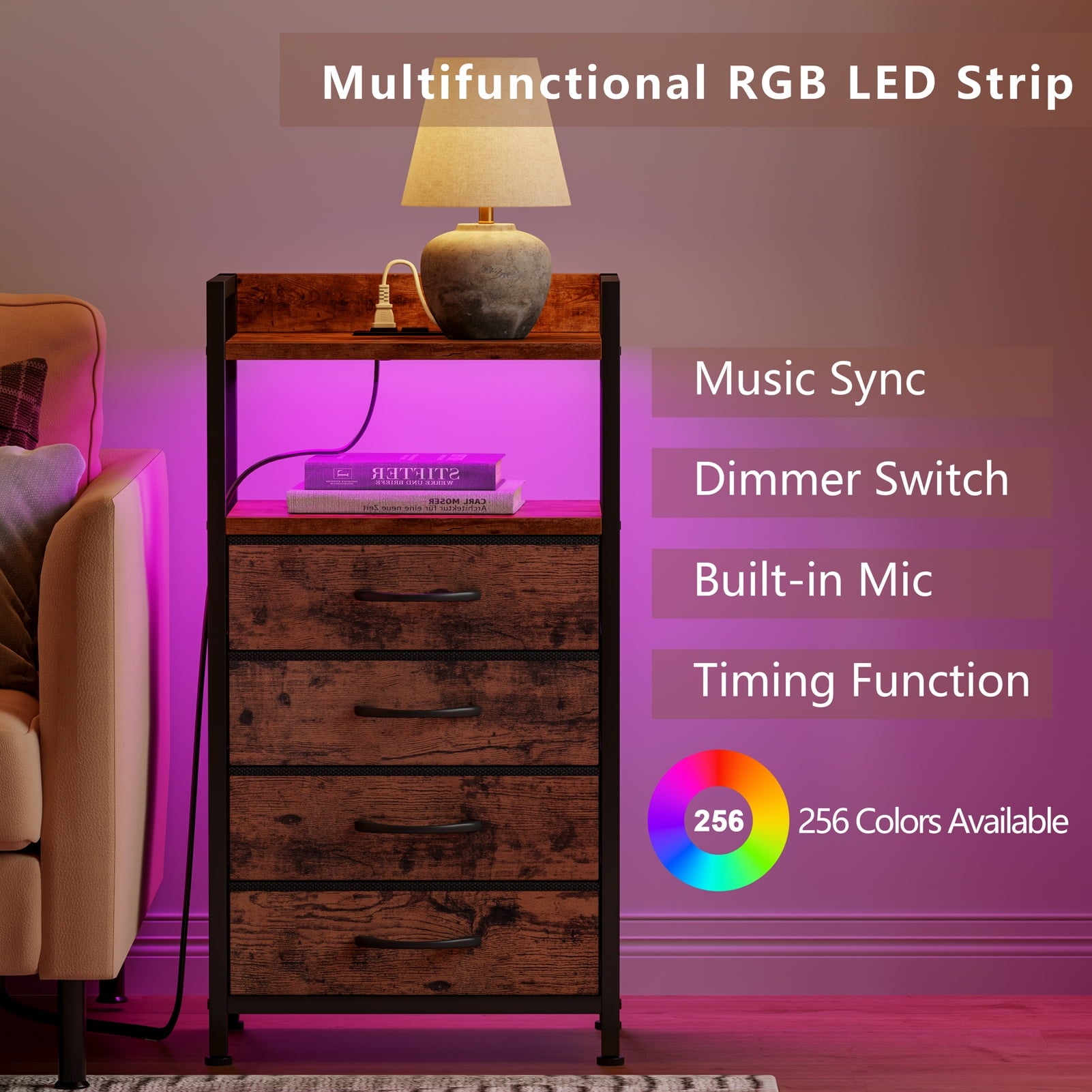 This stylish dresser features 2 AC outlets and 2 USB ports for easy device charging, along with RGB LED lights that sync with your music for a dynamic touch. Ideal for adults, it includes 4 spacious fabric drawers for organizing items like remote controls, keys, and small clothing, with a top wooden shelf for lamps and decorations. Made with a sturdy frame, wood board, and non-woven fabric, the drawers can hold up to 10 lbs, and the top can support 50 lbs. Adjustable feet enhance stability, and an anti-toppling device ensures safety.