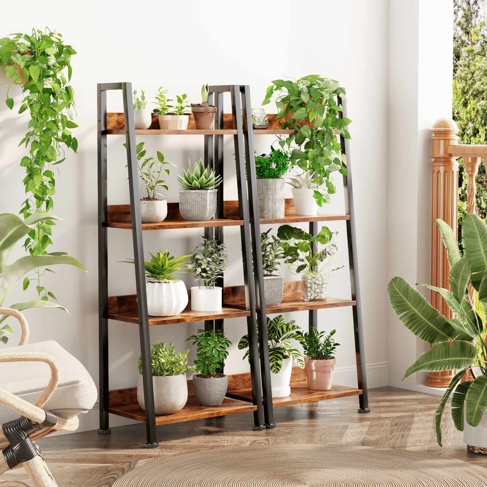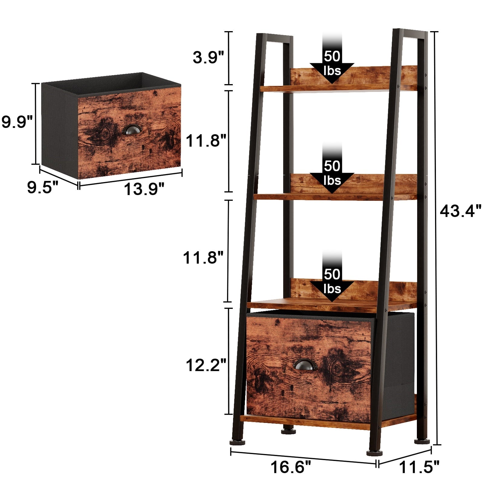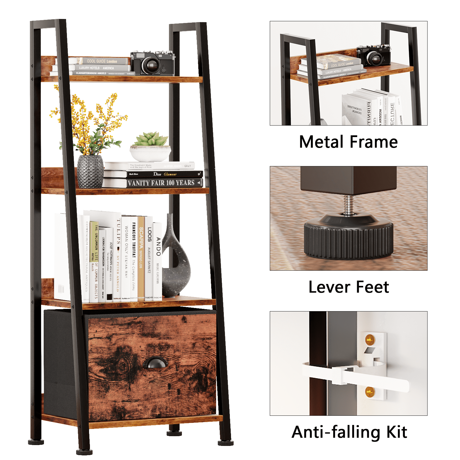 This versatile ladder bookshelf features a detachable fabric drawer for flexible storage. Crafted from high-quality particle board and a durable metal frame, it includes adjustable feet and an anti-tip kit for stability and safety. Each shelf supports up to 50 lbs, making it perfect for use as a plant stand, bookshelf, or storage organizer in various spaces. Its vintage minimalist design fits seamlessly into living rooms, kitchens, bedrooms, and more. Suitable for adults, and the elderly, it's easy to assemble in just 18 minutes with included instructions and tools. Enjoy 24/7 quality customer service for any issues.