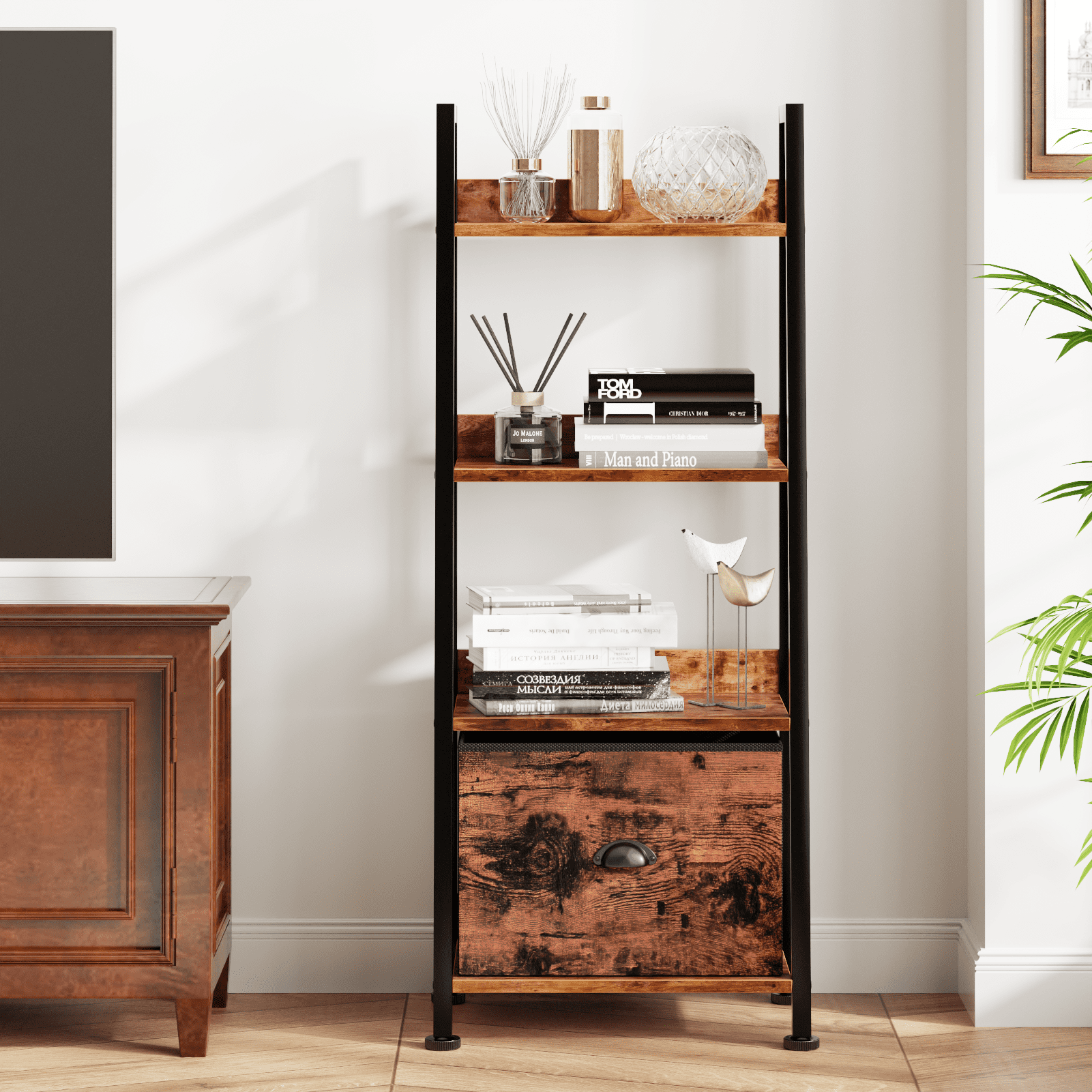 Tydimor 4-Tier Ladder Bookshelf With Drawer, Leaning Bookcase Storage Display Shelf,Rustic Brown