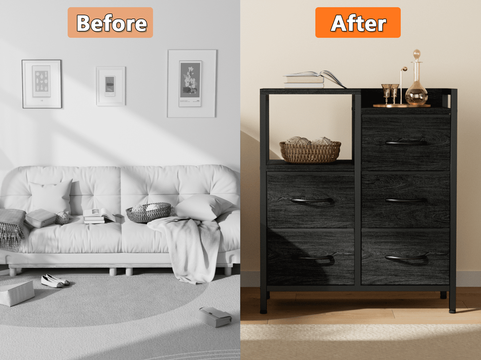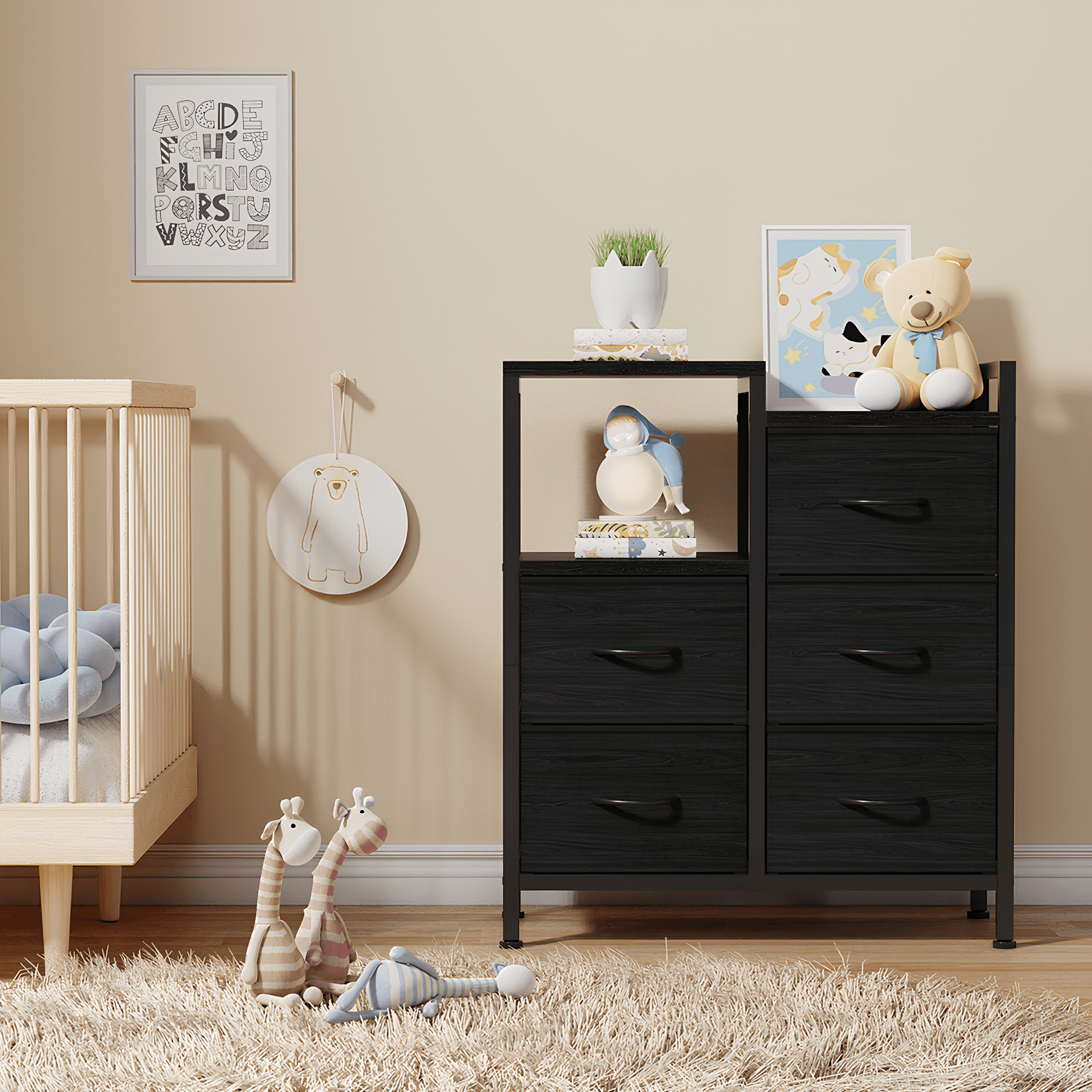 This lightweight dresser is perfect for bedrooms, dorms, living rooms, offices, and more. It serves as a dresser, end table, or toy organizer, ideal for adults. The dresser offers spacious storage with durable, waterproof wooden tops for essentials. Its strong steel frame and fabric drawers ensure durability, featuring easy-pull handles and adjustable feet. An anti-toppling device adds safety. Easy to assemble with 24/7 customer service support.