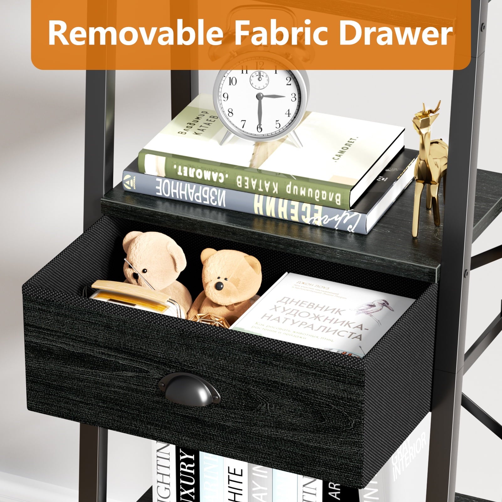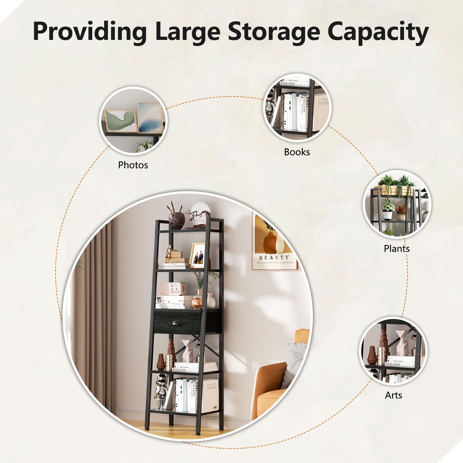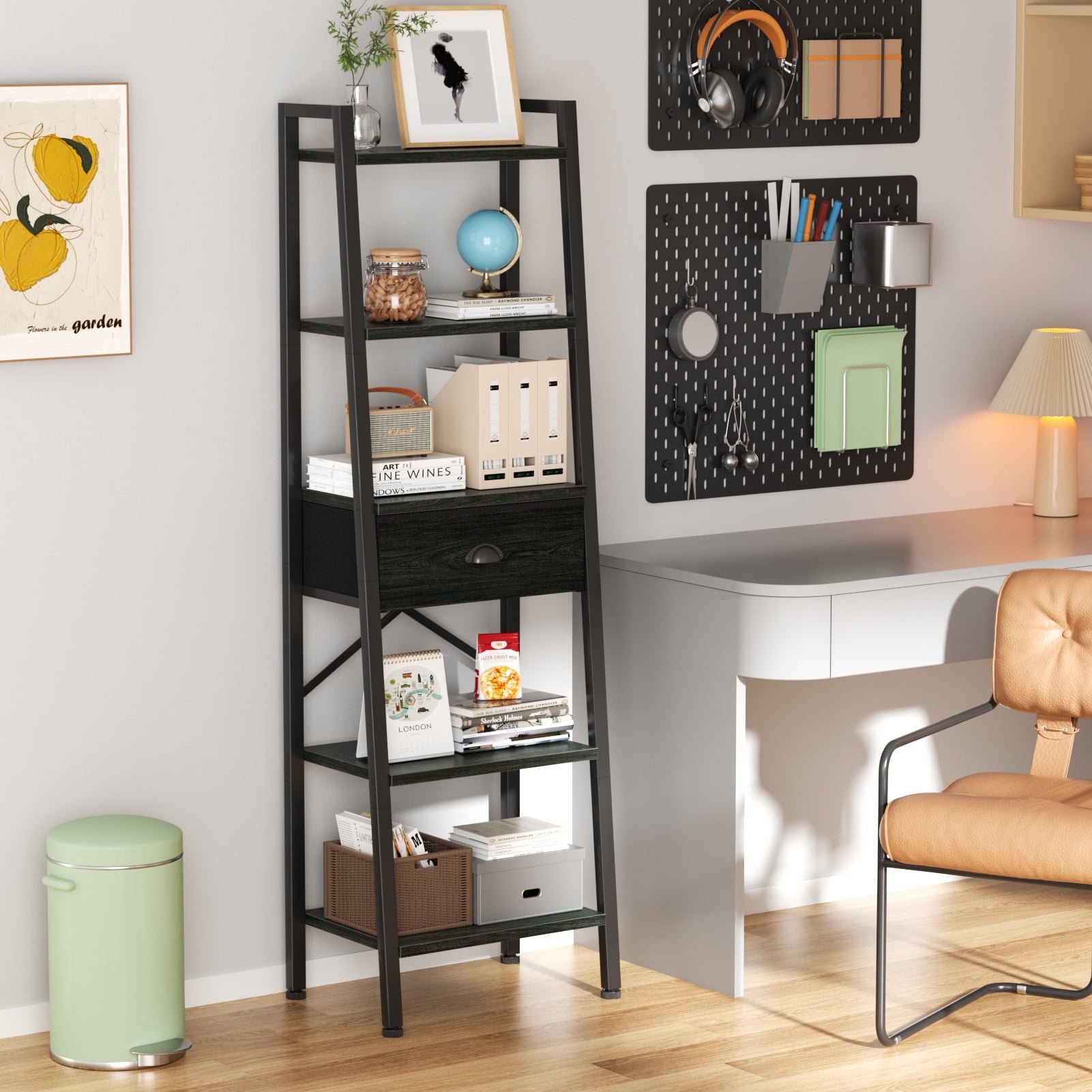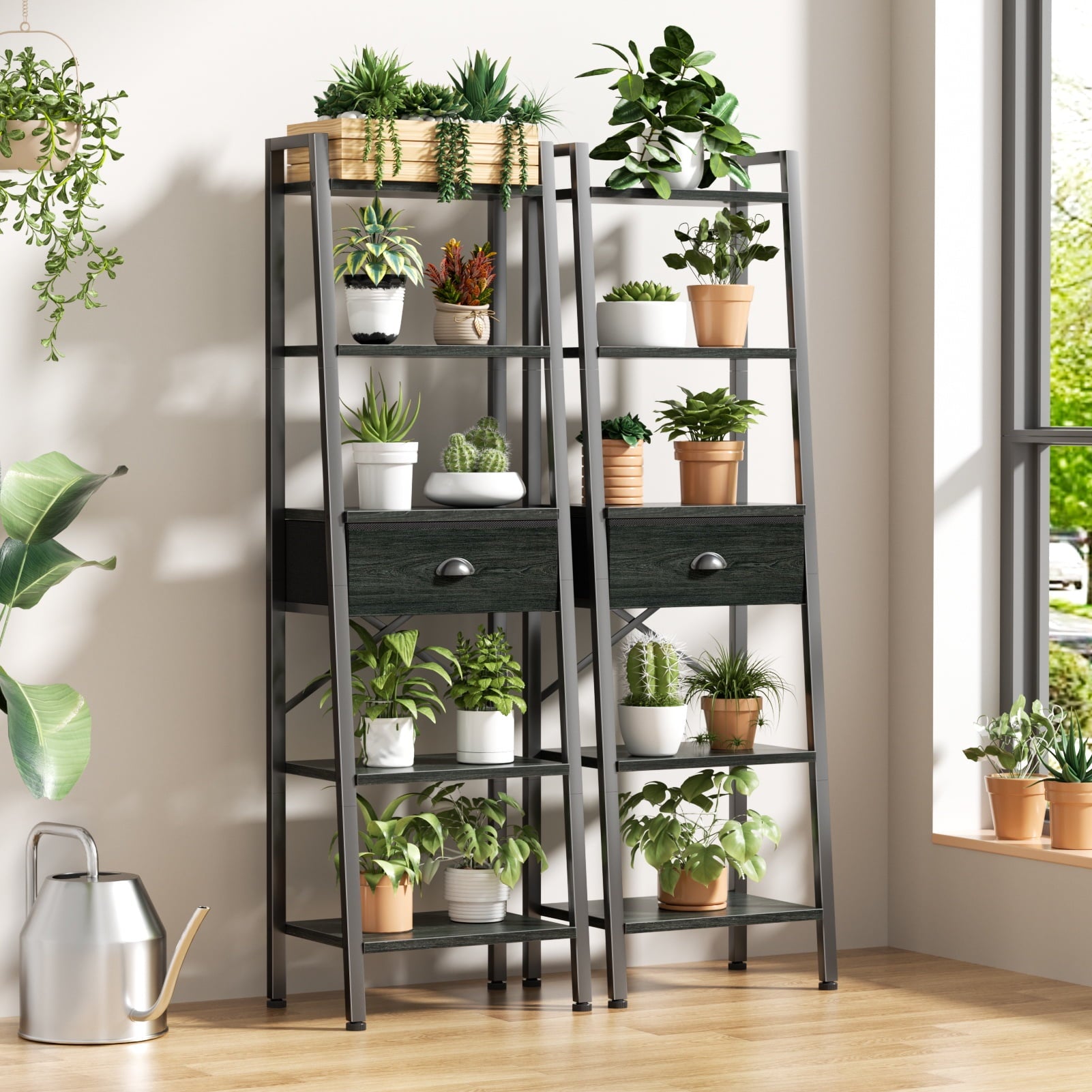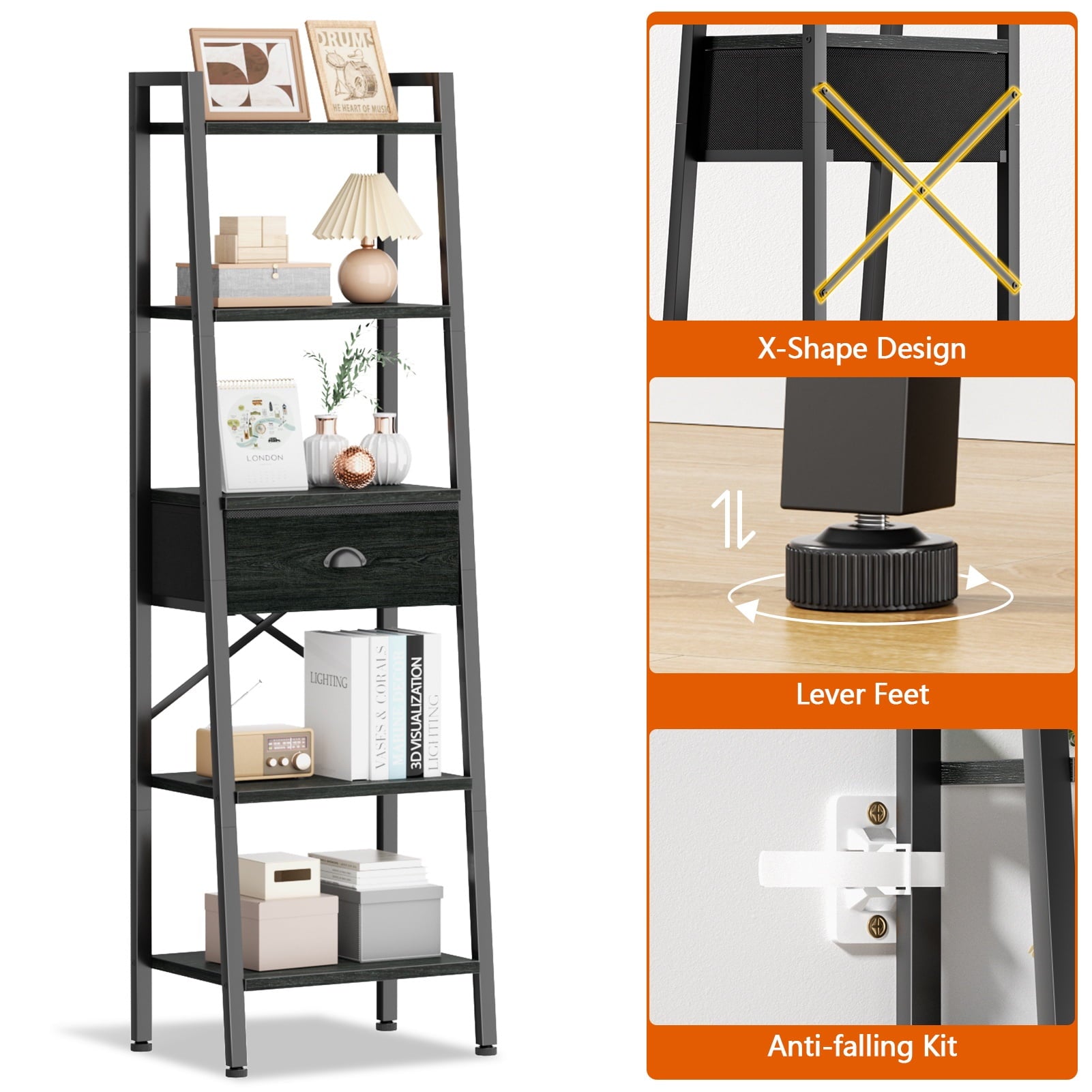 This versatile ladder bookshelf now features a large-capacity, detachable drawer for flexible storage. Crafted from high-quality particle board and a durable metal frame, it includes adjustable feet and an anti-tip kit for stability and safety. Each shelf supports up to 50 lbs, making it perfect for use as a plant stand, bookshelf, or storage organizer in various spaces. Its vintage minimalist design fits seamlessly into living rooms, kitchens, bedrooms, and more. Suitable for adults, and the elderly, it's easy to assemble in just 20 minutes with included instructions and tools. Enjoy 24/7 quality customer service for any issues.