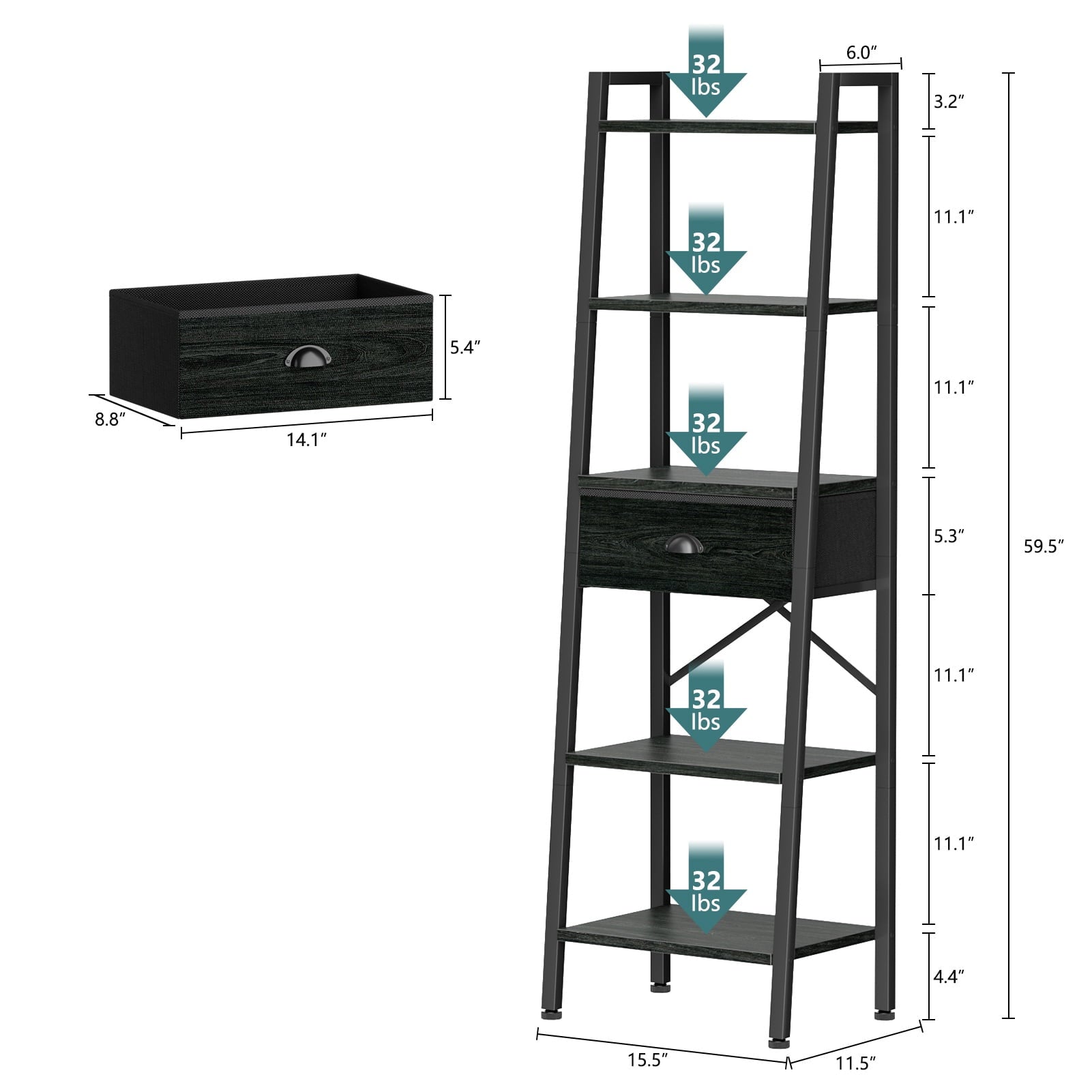 Tydimor 5-Tier 59.5" Ladder Bookshelf with Removable Drawers Narrow Bookcase for Living Room,Black Oak