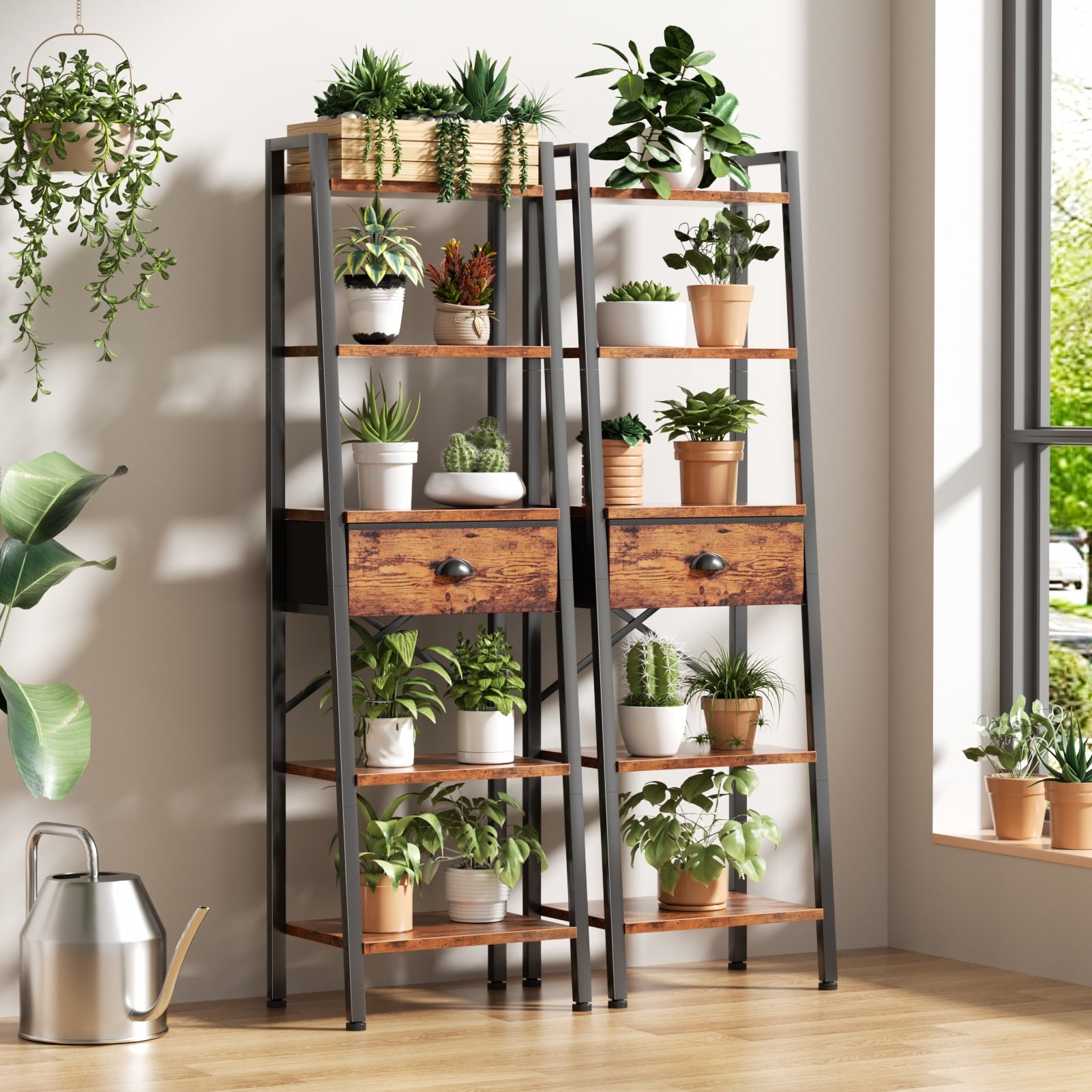 This versatile ladder bookshelf now features a large-capacity, detachable drawer for flexible storage. Crafted from high-quality particle board and a durable metal frame, it includes adjustable feet and an anti-tip kit for stability and safety. Each shelf supports up to 50 lbs, making it perfect for use as a plant stand, bookshelf, or storage organizer in various spaces. Its vintage minimalist design fits seamlessly into living rooms, kitchens, bedrooms, and more. Suitable for adults, and the elderly, it's easy to assemble in just 20 minutes with included instructions and tools. Enjoy 24/7 quality customer service for any issues.