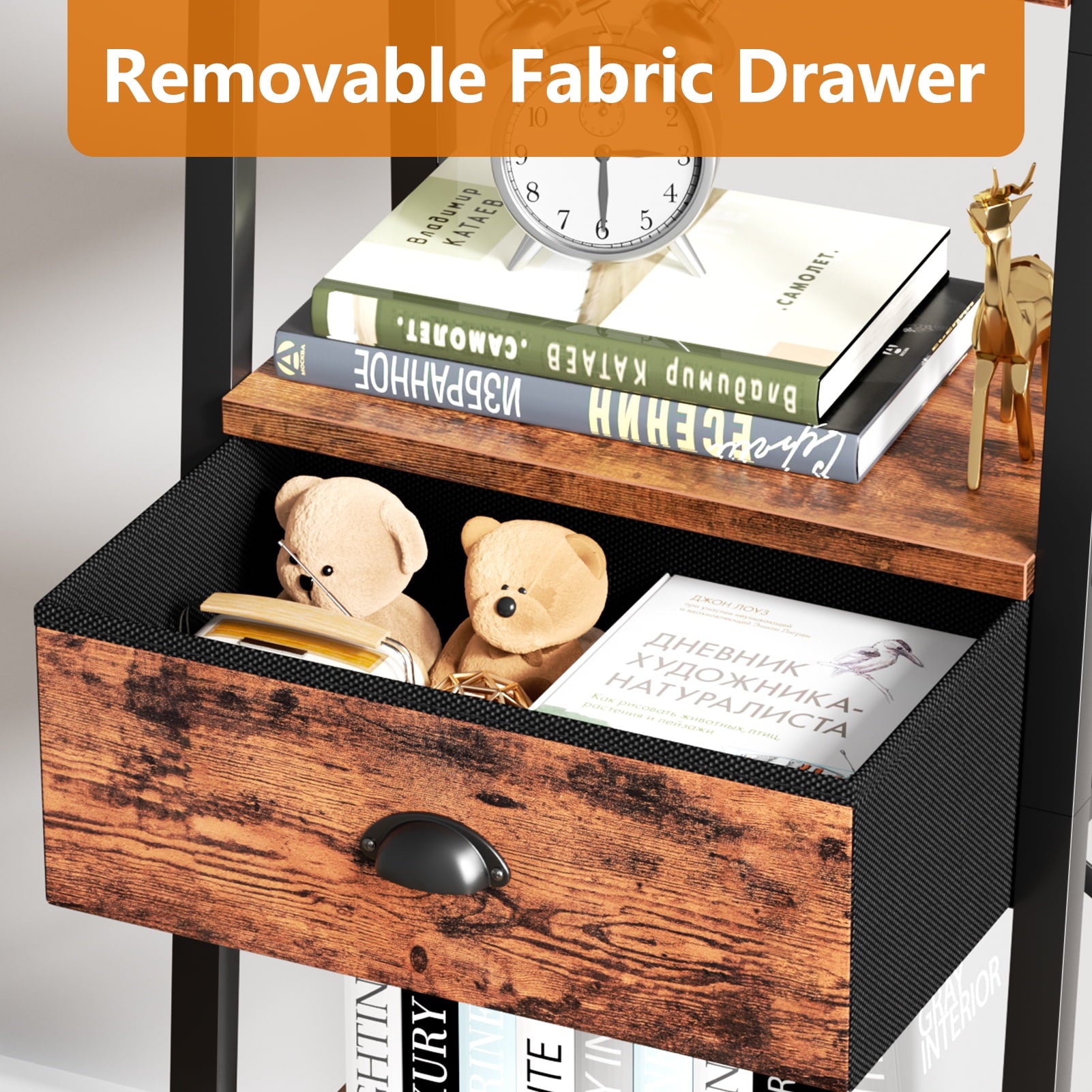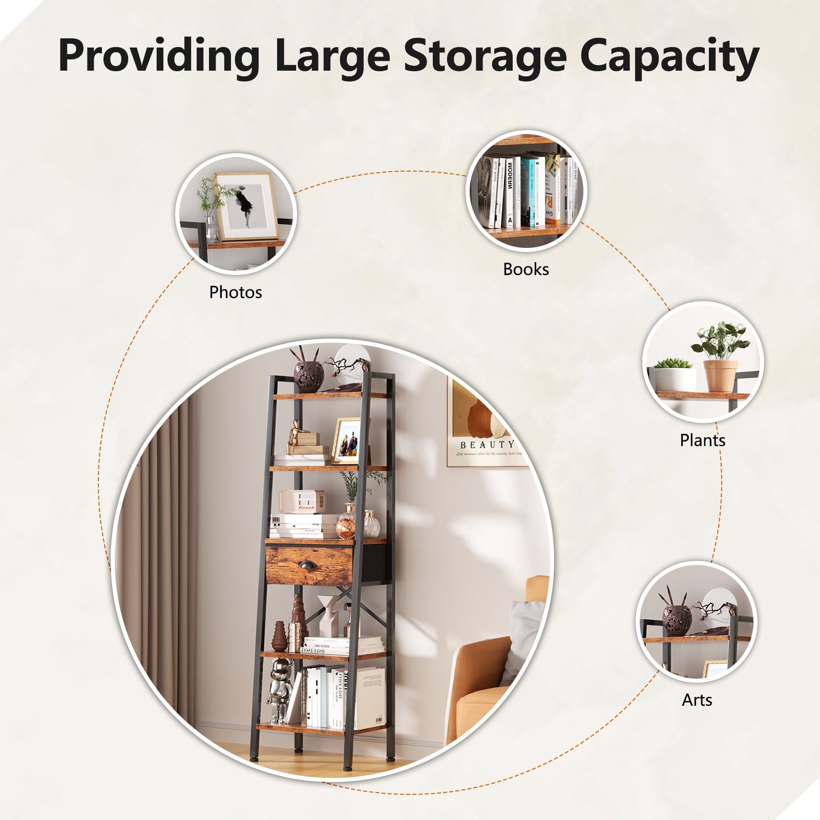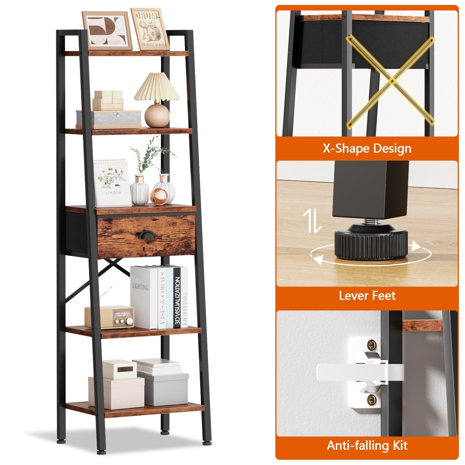 Tydimor 5-Tier 59.5" Ladder Bookshelf with Removable Drawers Narrow Bookcase for Living Room,Rustic Brown