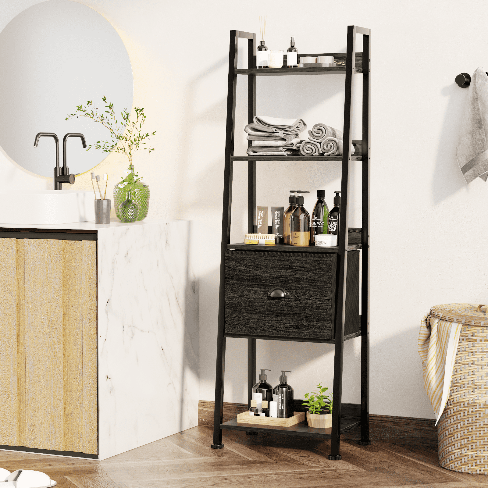 This black ladder-style storage shelf with a drawer is perfect for maximizing limited storage areas. Made from high-quality MDF, it is not only elegant and stylish but also easy to clean and adaptable to any part of your home. Featuring four adjustable feet, it ensures stability even on uneven surfaces. This versatile organizer can be utilized for storage in the bathroom, living room, bedroom, entryway, hallway, balcony, office, or study. Additionally, it can serve as a towel rack, bathroom storage unit, bookshelf, kitchen shelf, or plant stand.