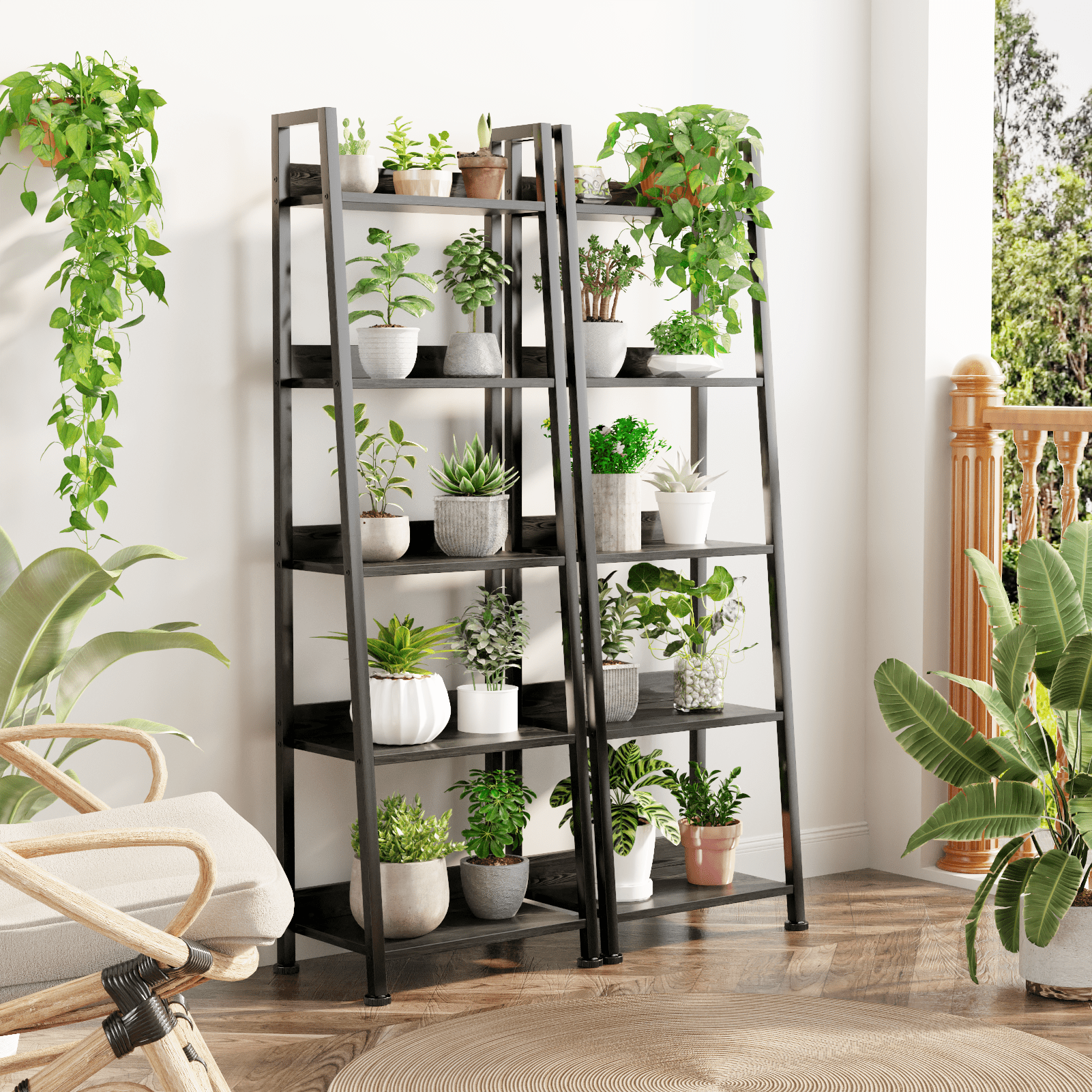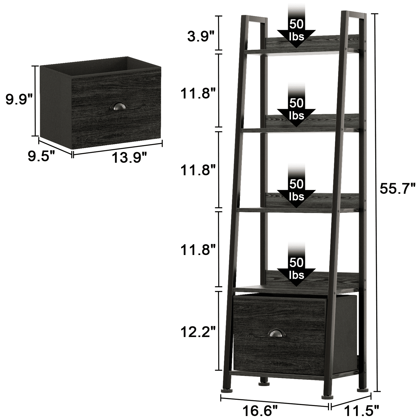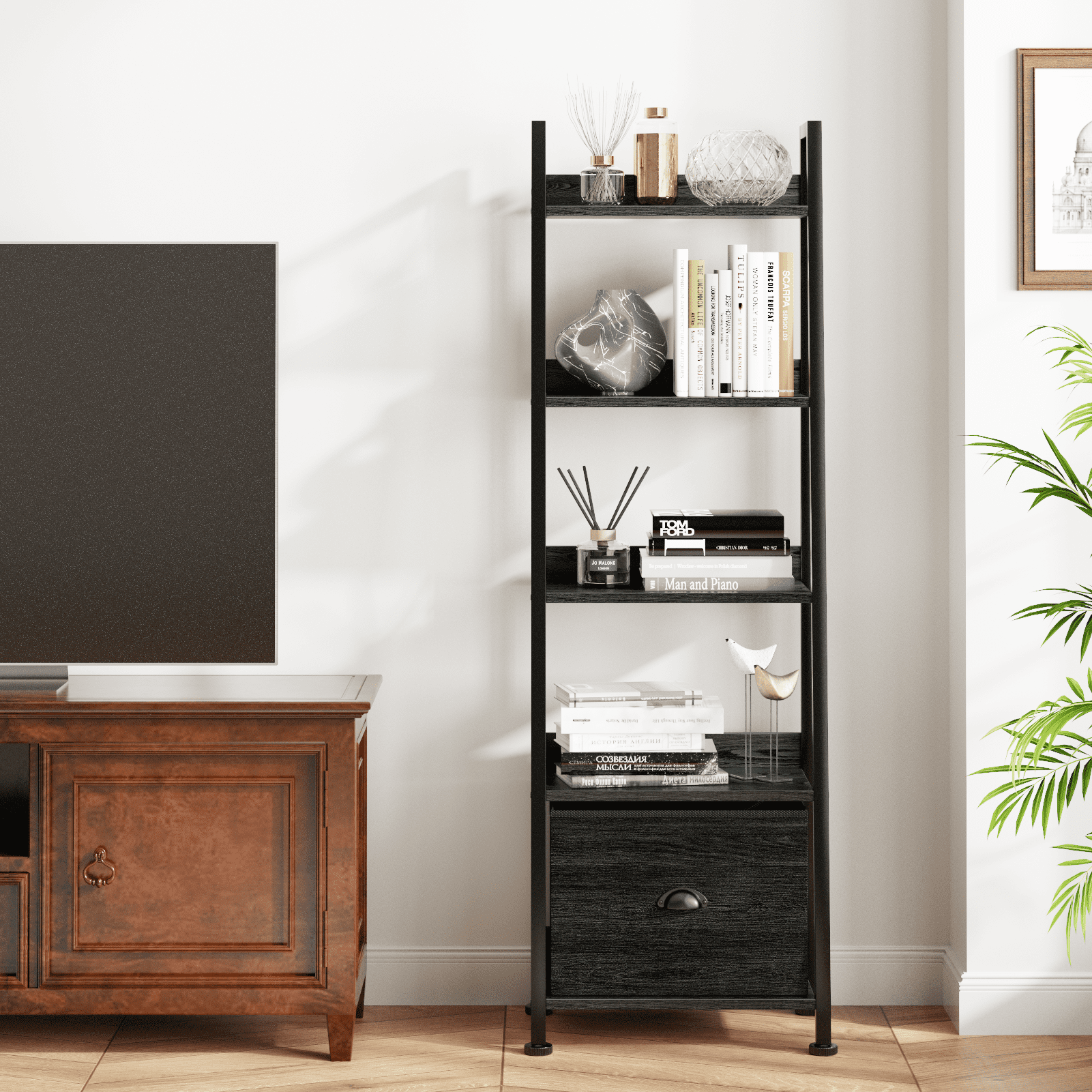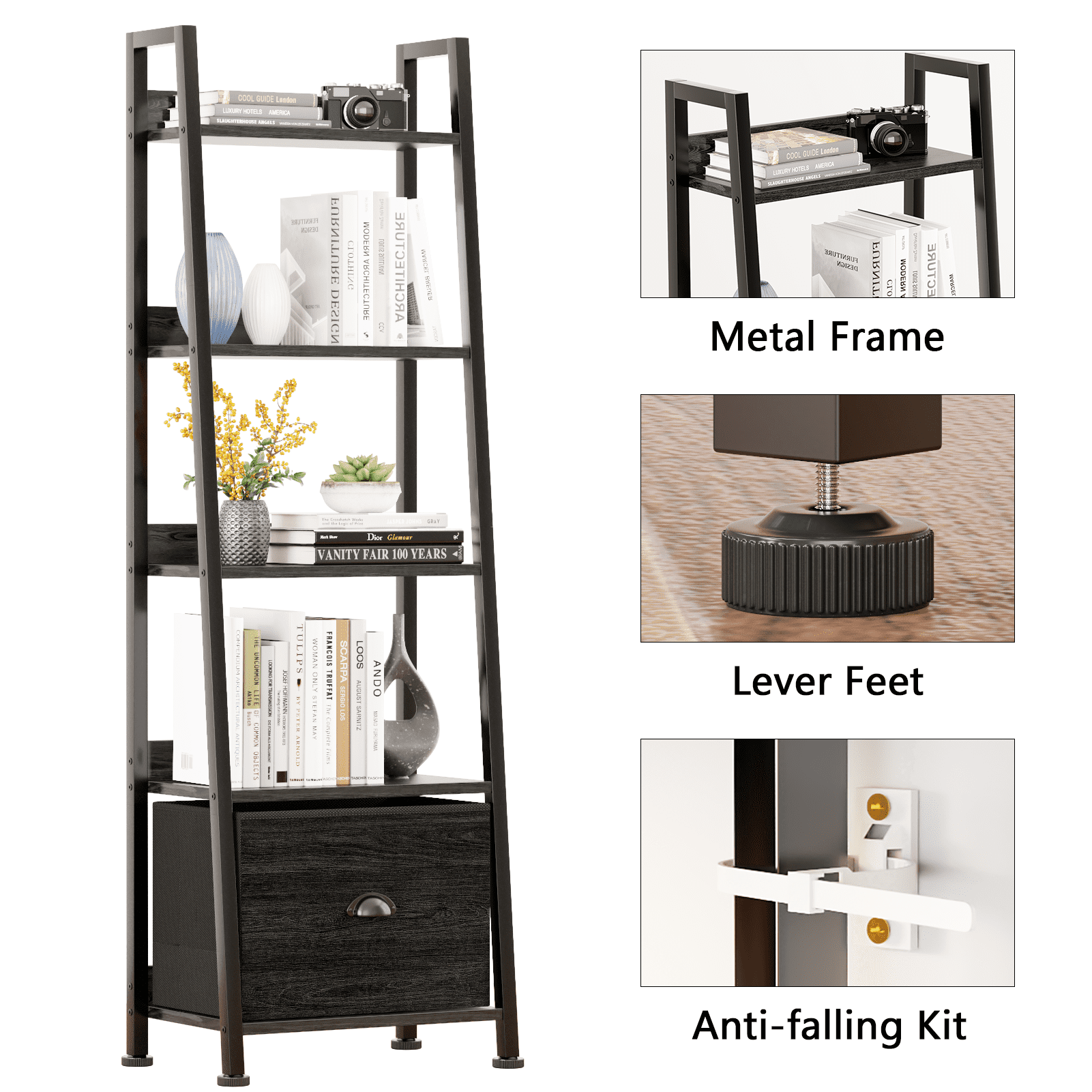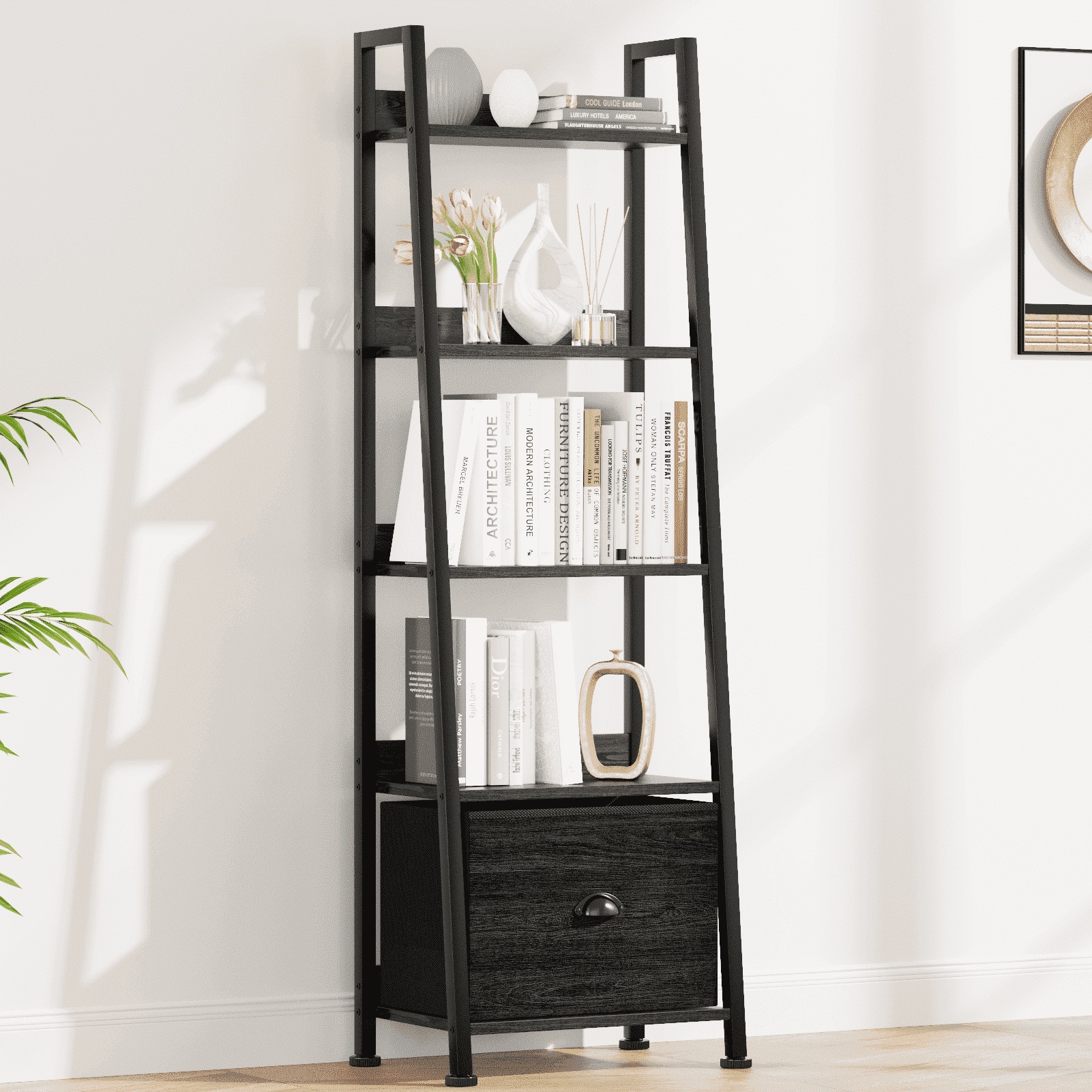 Tydimor 5-Tier Ladder Bookshelf With Drawer, Leaning Bookcase Storage Display Shelf, Black Oak