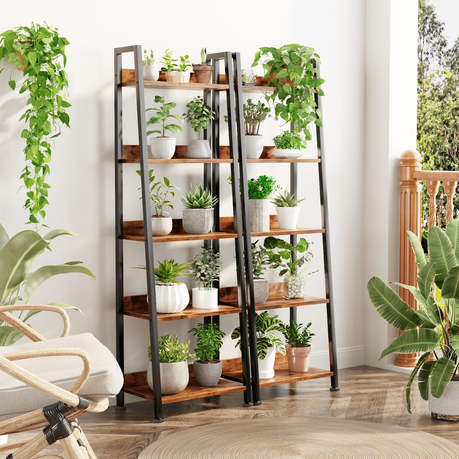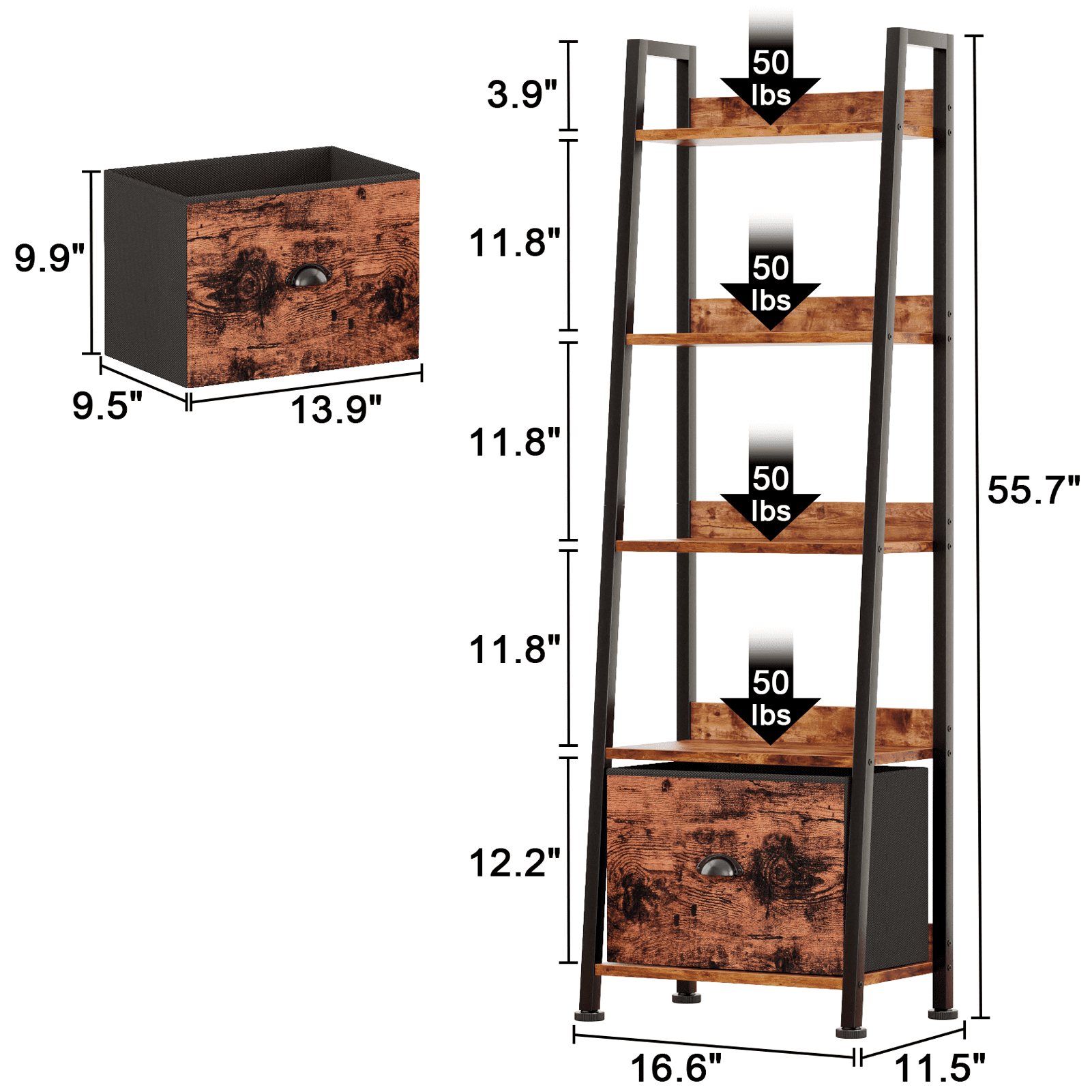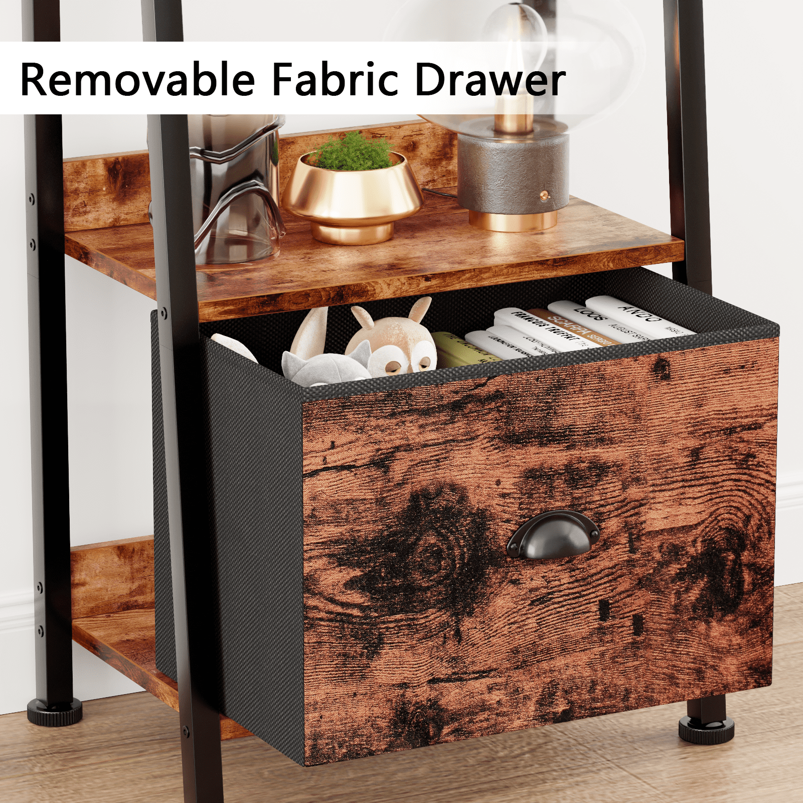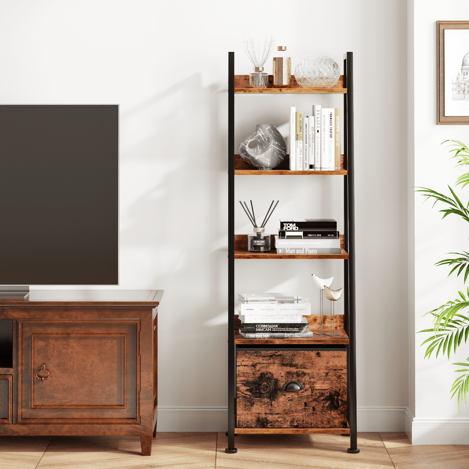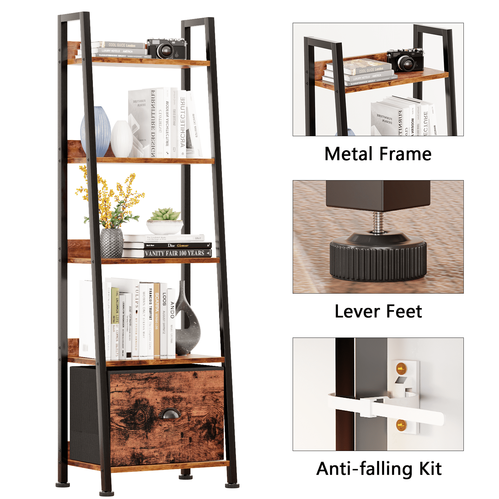 Tydimor 5-Tier Ladder Bookshelf With Drawer, Leaning Bookcase Storage Display Shelf,Rustic Brown