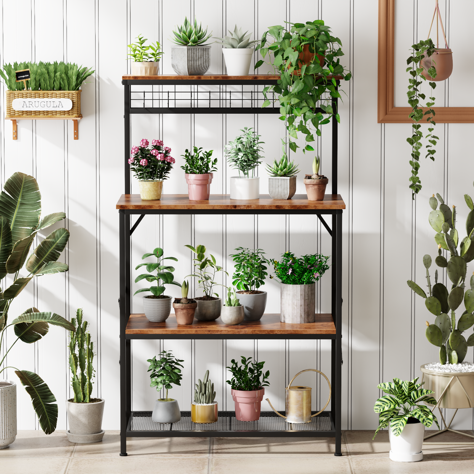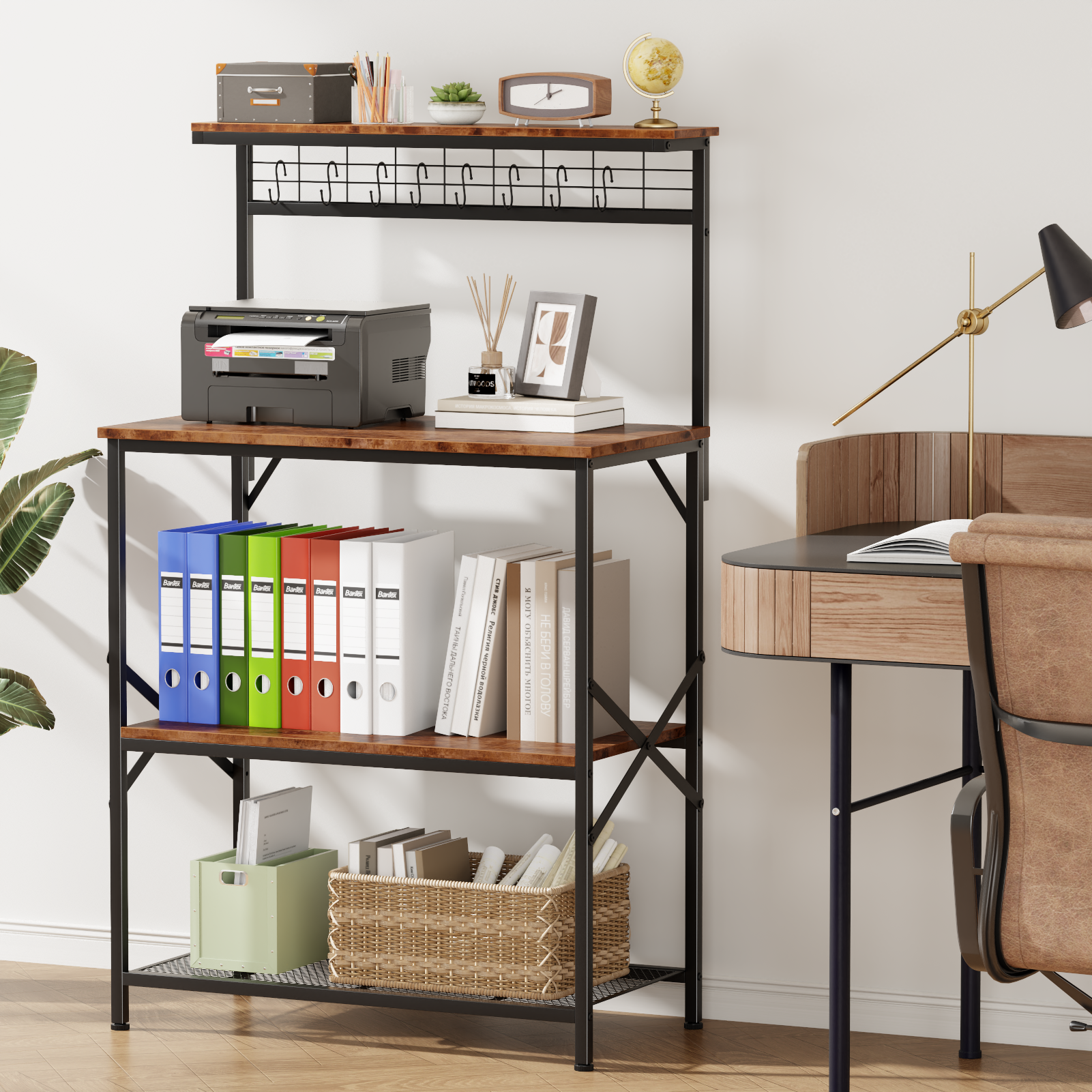 Tydimor Bakers Rack with 8 Hooks, Kitchen Microwave Stand, 4-Tier Coffee Bar Table, Space-Saving Kitchen Storage Shelf, Rustic Brown
