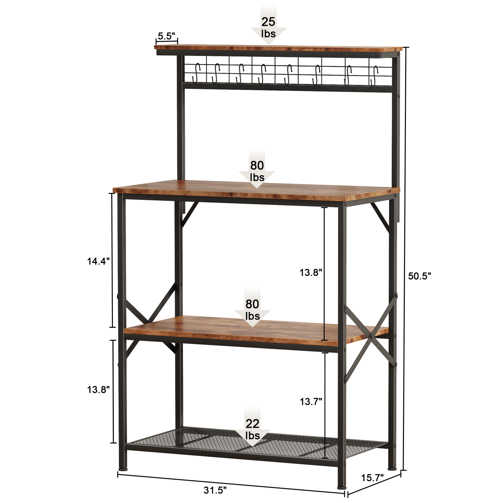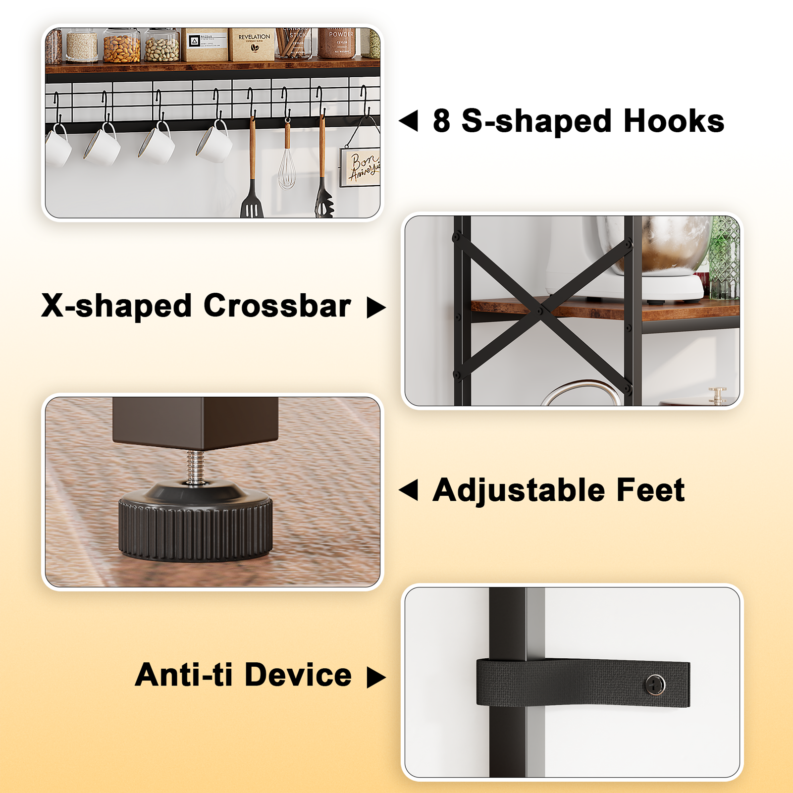 Maximize Space: With a 31.5-inch wide 4-tier structure + top hook rack, it can hold appliances like microwaves and toasters, while also storing tableware and ingredients; 8 S-shaped hooks can hang mugs and spatulas, keeping kitchen tools within easy reach—even small spaces can “fit” all your needs