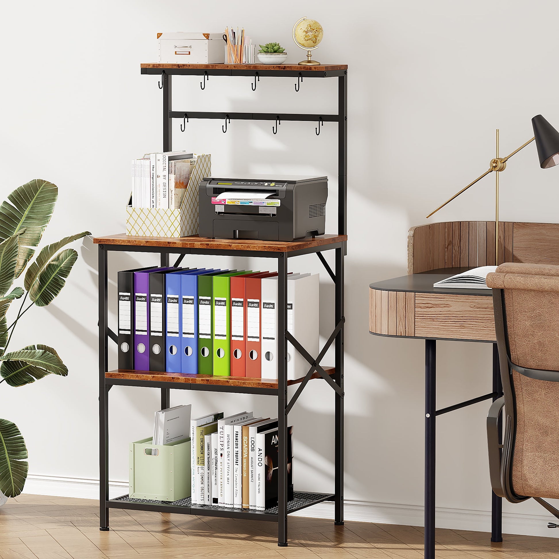 This versatile kitchen storage rack features a 4-tier design: a top shelf for spices, a middle shelf for appliances, and two lower shelves for essentials, plus six metal hooks. Made with a sturdy steel frame and P2 particleboard, each shelf supports up to 70 pounds. Ideal for various uses, it fits well in any room. Suitable for adults. Easy to assemble in 20 minutes, with 24/7 customer support.