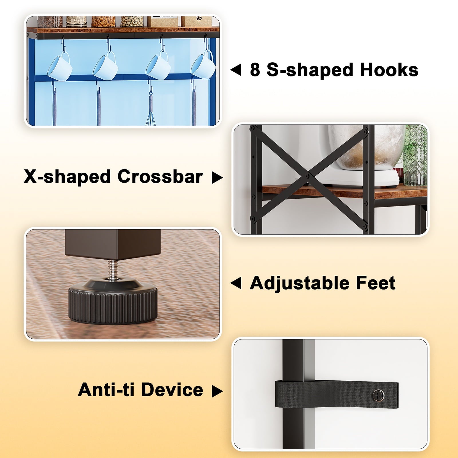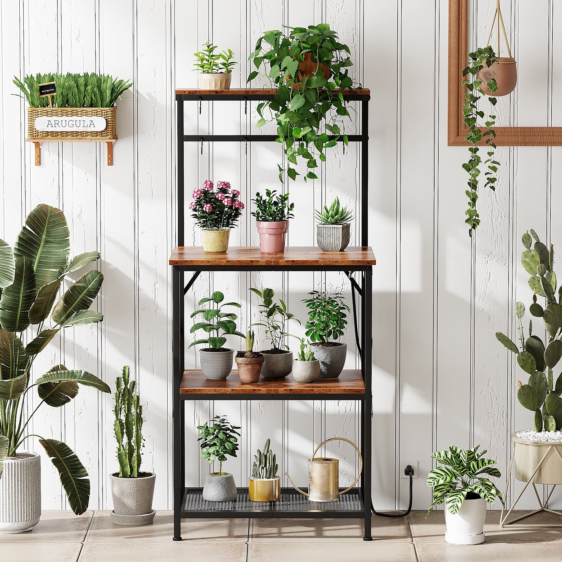 This versatile kitchen storage rack features a 4-tier design: a top shelf for spices, a middle shelf for appliances, and two lower shelves for essentials, plus six metal hooks. Made with a sturdy steel frame and P2 particleboard, each shelf supports up to 70 pounds. Ideal for various uses, it fits well in any room. Suitable for adults. Easy to assemble in 20 minutes, with 24/7 customer support.
