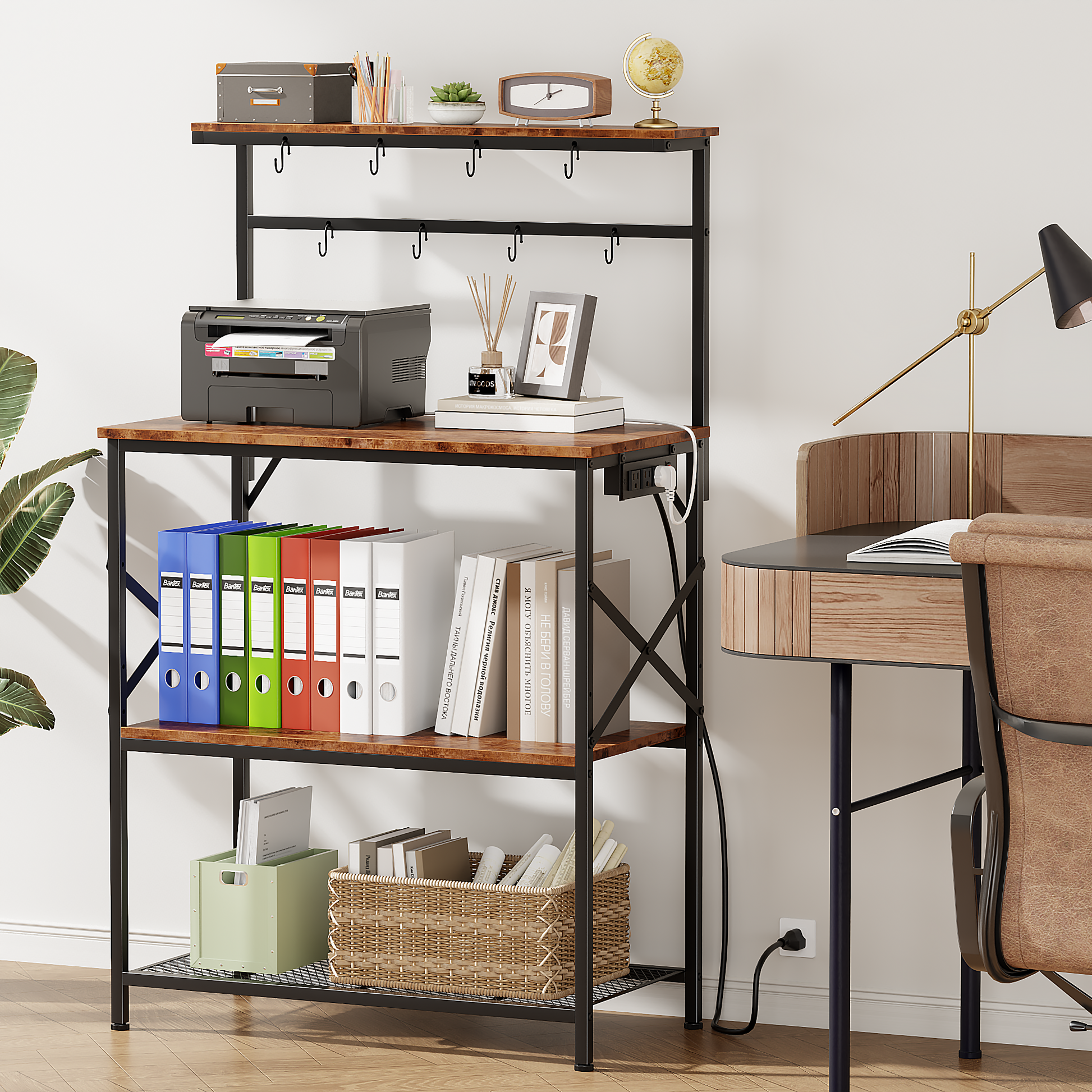 Tydimor Bakers Rack with Power Outlet, Kitchen Microwave Stand, 4-Tier Coffee Bar Table, Space-Saving Kitchen Storage Shelf, Rustic Brown