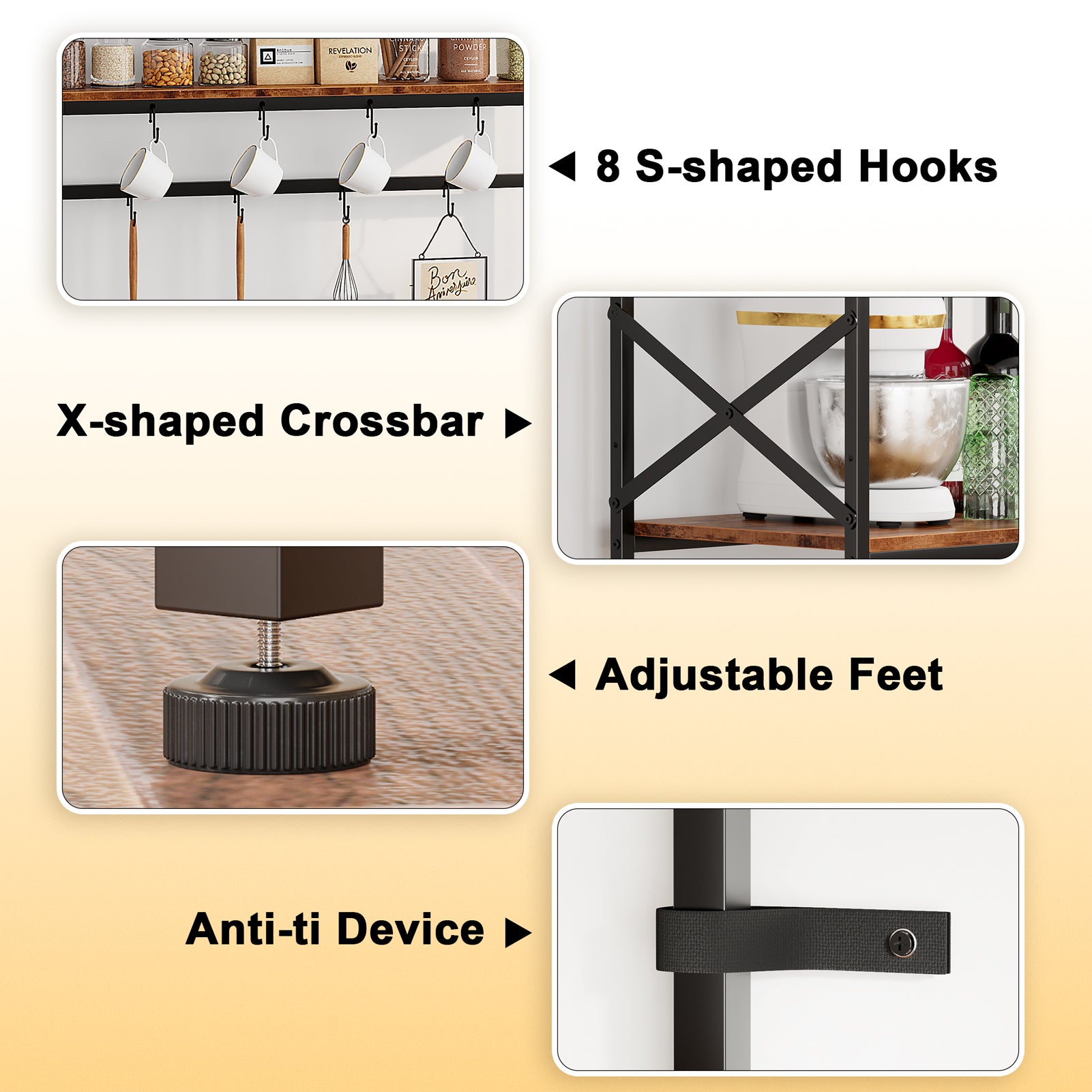 Maximize Space: With a 31.5-inch wide 4-tier structure + top hook rack, it can hold appliances like microwaves and toasters, while also storing tableware and ingredients; 8 S-shaped hooks can hang mugs and spatulas, keeping kitchen tools within easy reach—even small spaces can “fit” all your needs