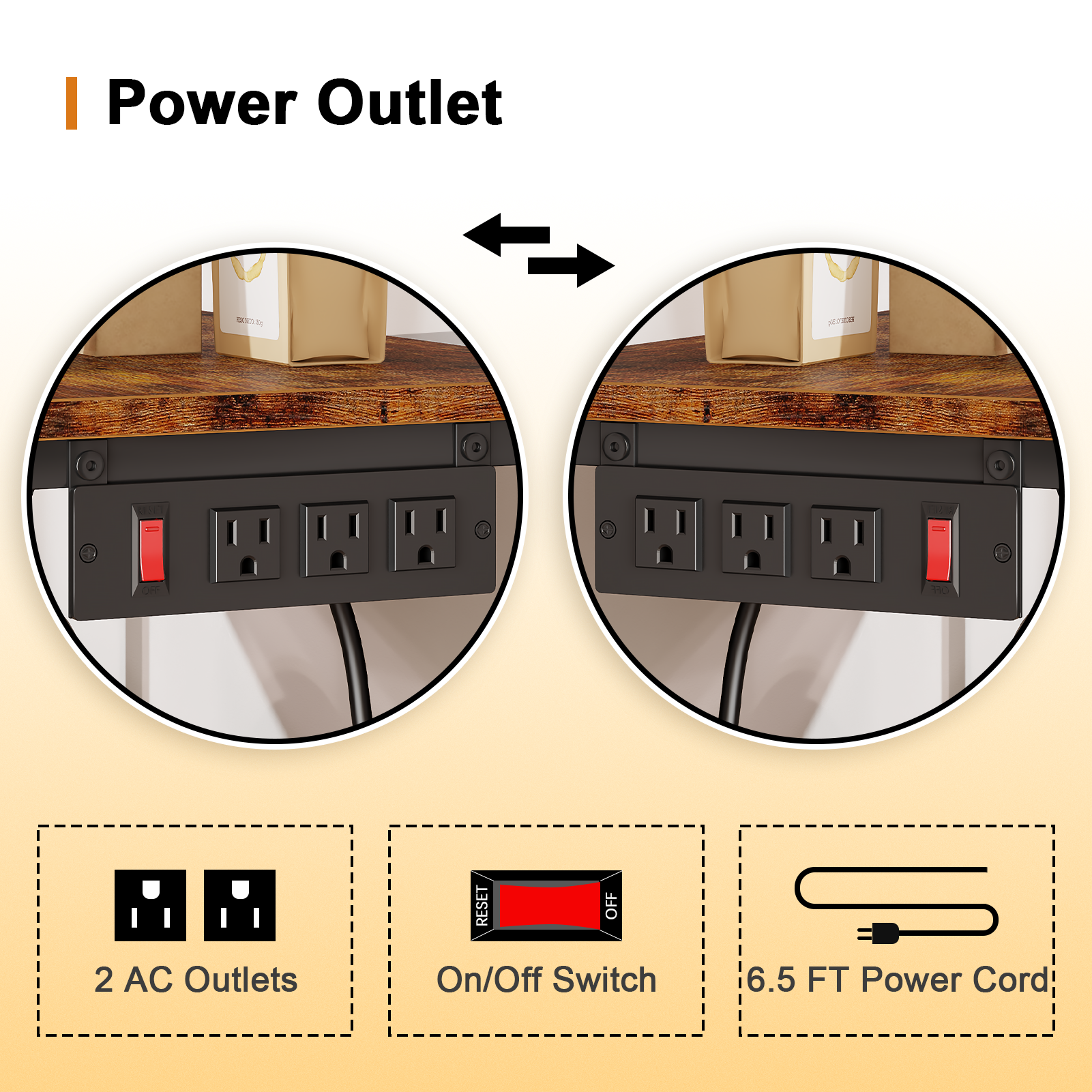 Built-in Power Outlets: Equipped with 2 AC power outlets + a 6.5-foot power cord + a safety switch, you don’t have to bend over to plug/unplug—power your coffee maker or microwave directly; the one-click switch controls power on/off, making it convenient, energy-saving (no standby power waste), safe, and worry-free