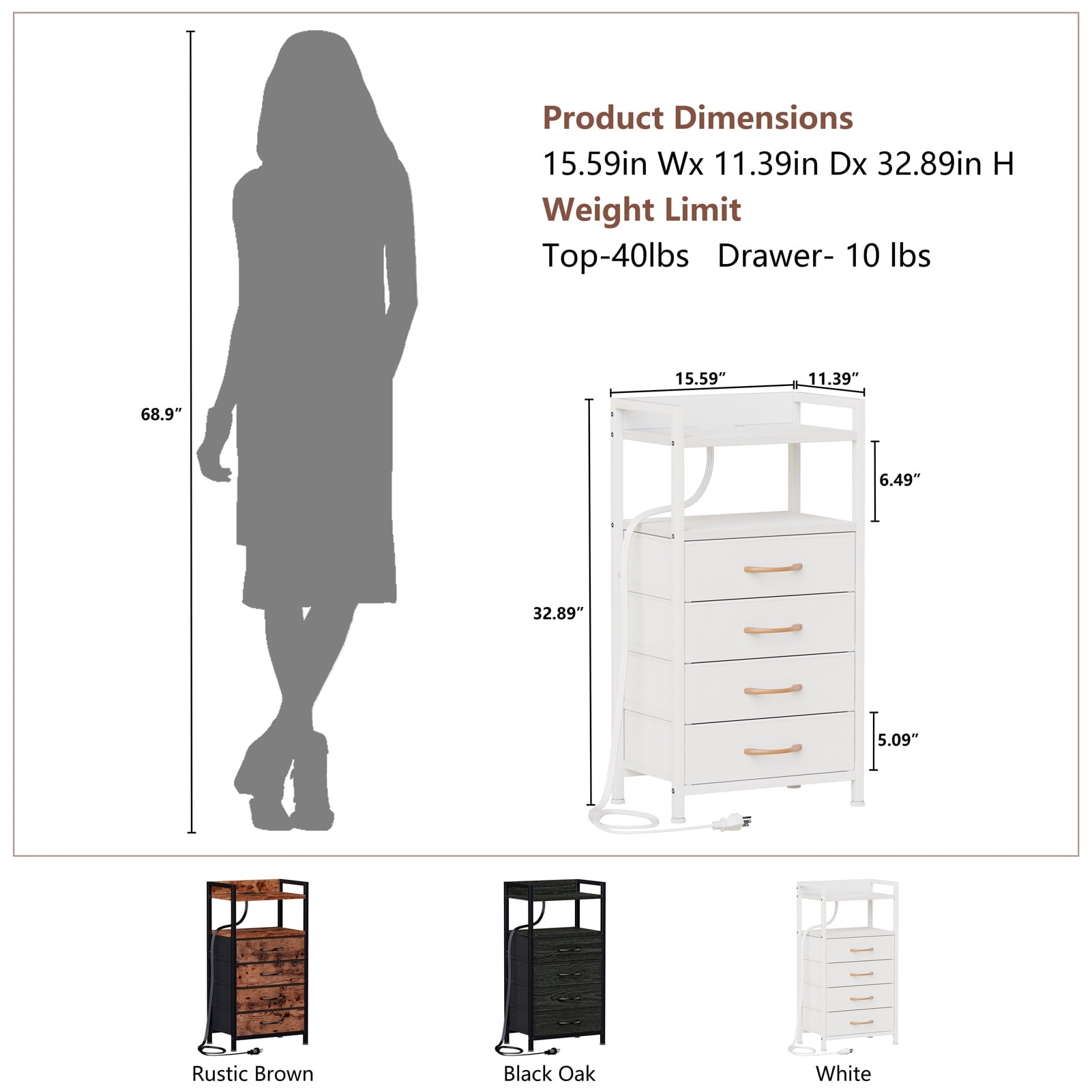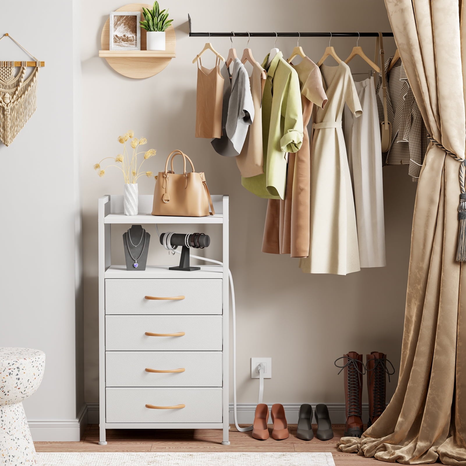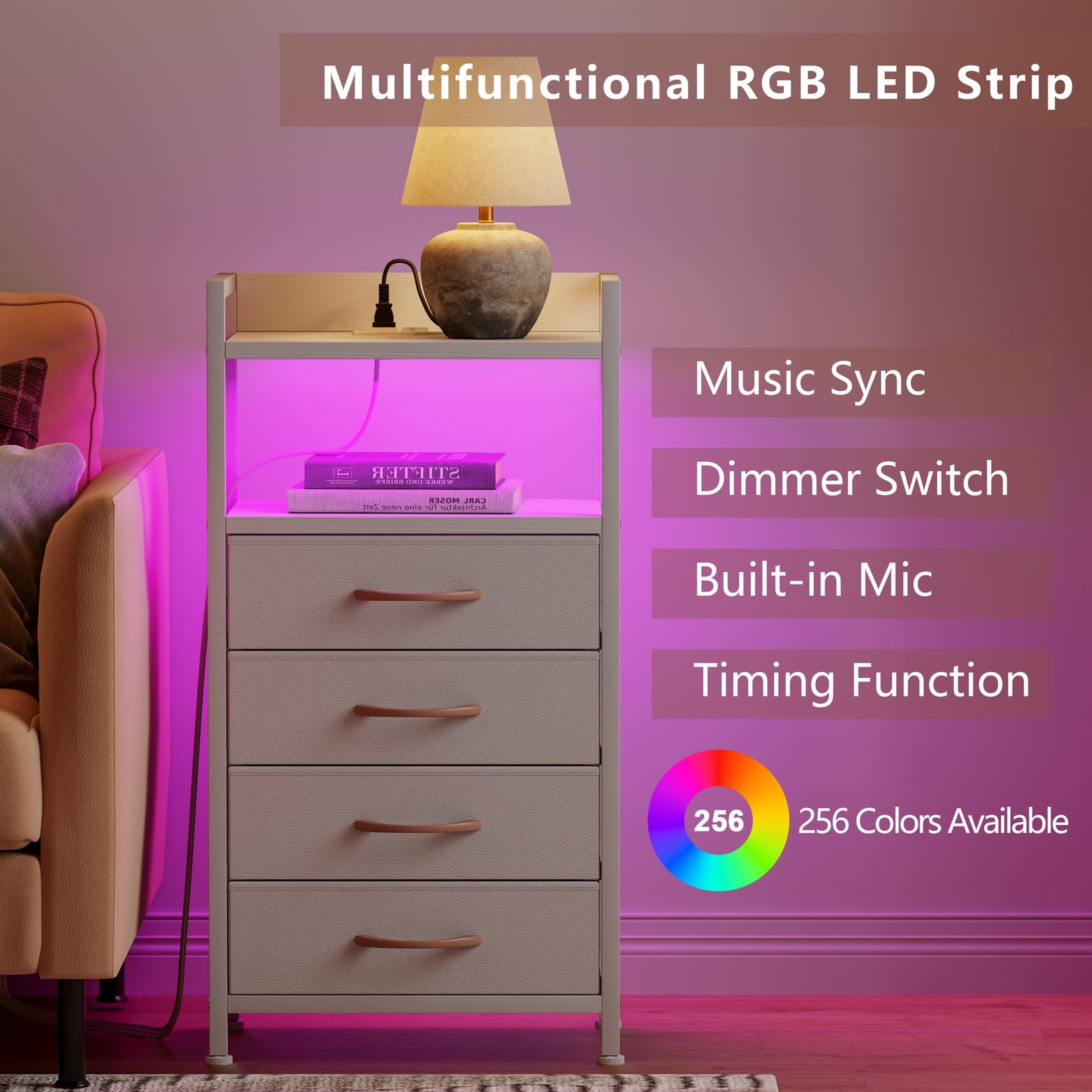 This stylish dresser features 2 AC outlets and 2 USB ports for easy device charging, along with RGB LED lights that sync with your music for a dynamic touch. Ideal for adults, it includes 4 spacious fabric drawers for organizing items like remote controls, keys, and small clothing, with a top wooden shelf for lamps and decorations. Made with a sturdy frame, wood board, and non-woven fabric, the drawers can hold up to 10 lbs, and the top can support 50 lbs. Adjustable feet enhance stability, and an anti-toppling device ensures safety.