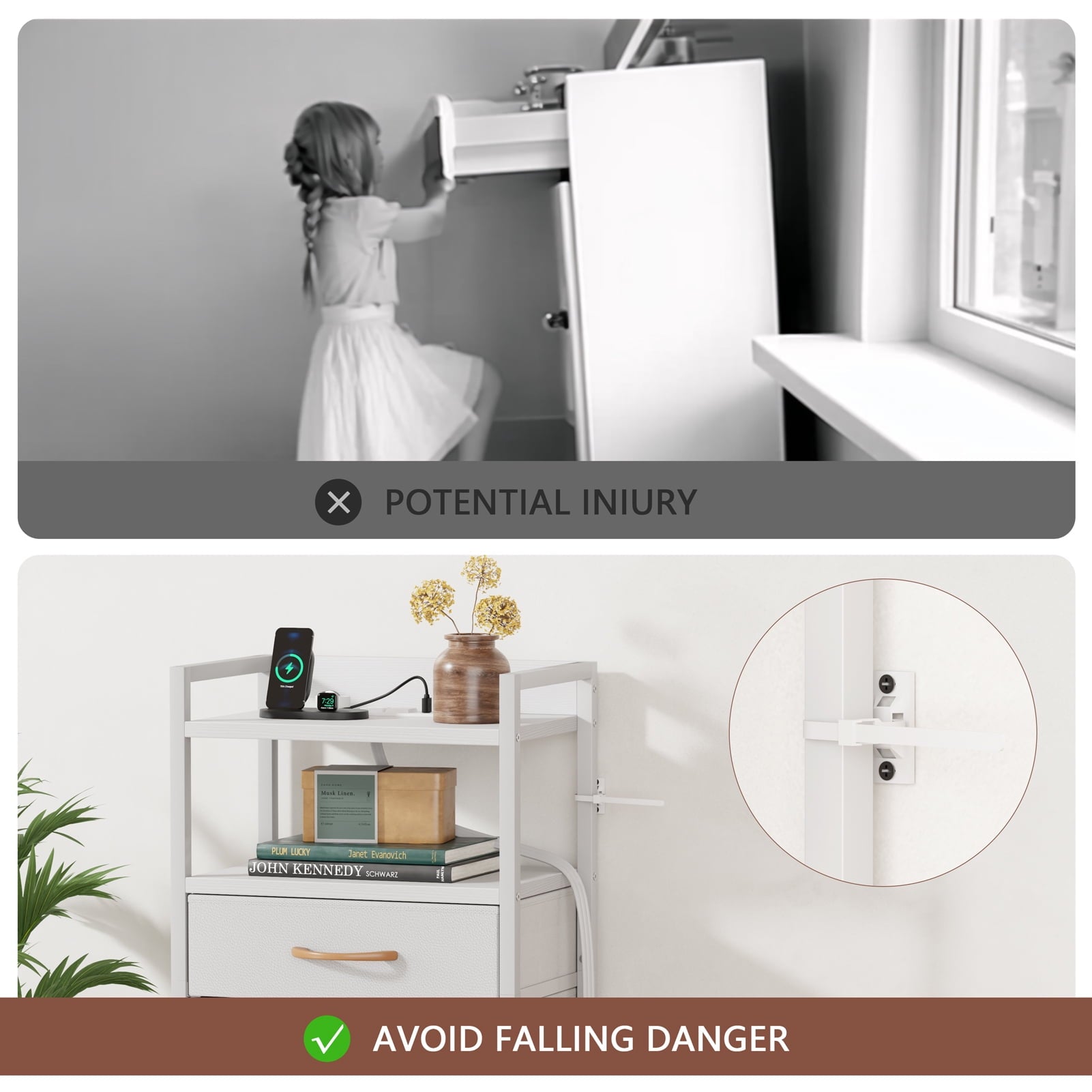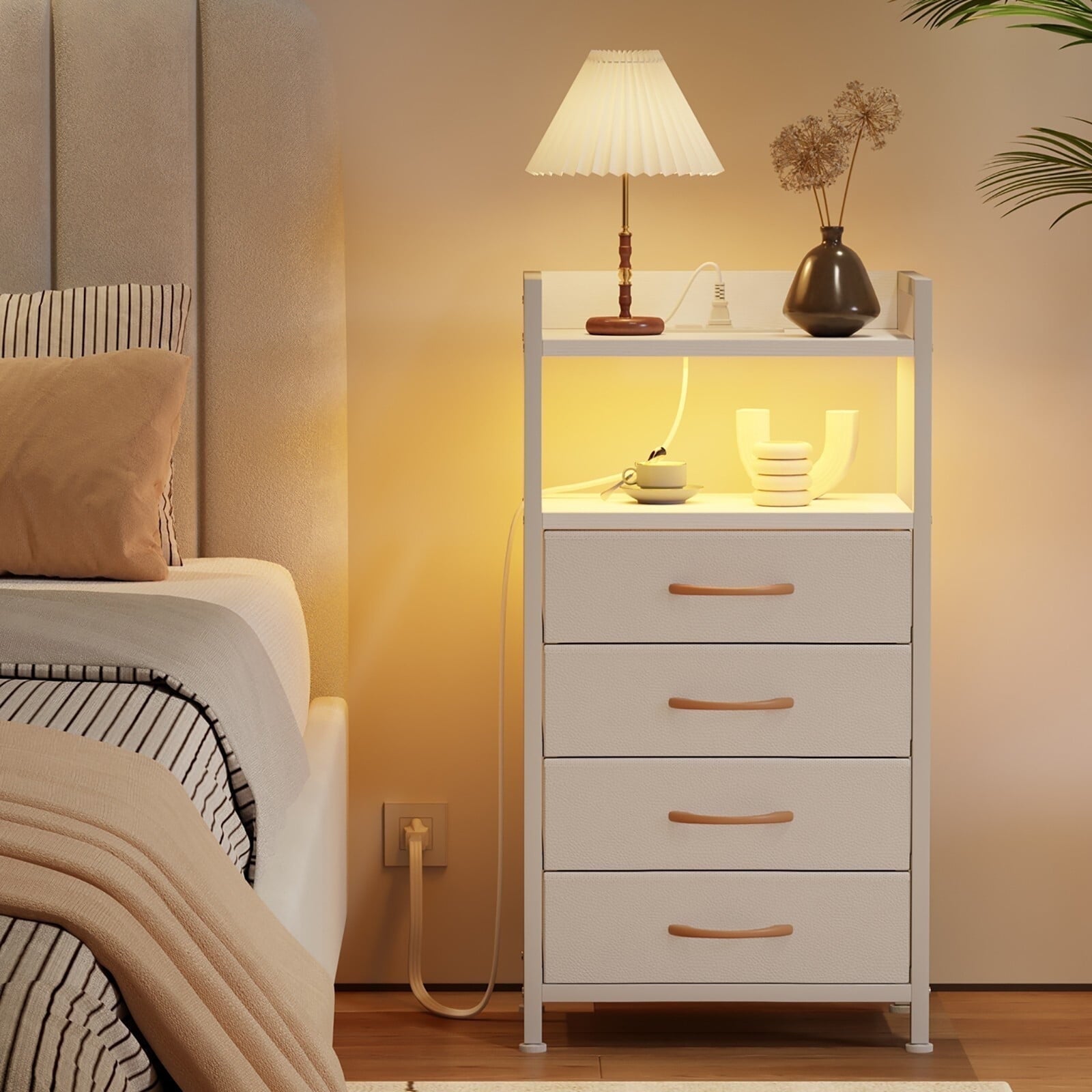 TYDIMOR Dresser Bedside Table with Charging Station, 4 Drawer Nightstand for Bedroom Furniture, White, Modern Style, Adults