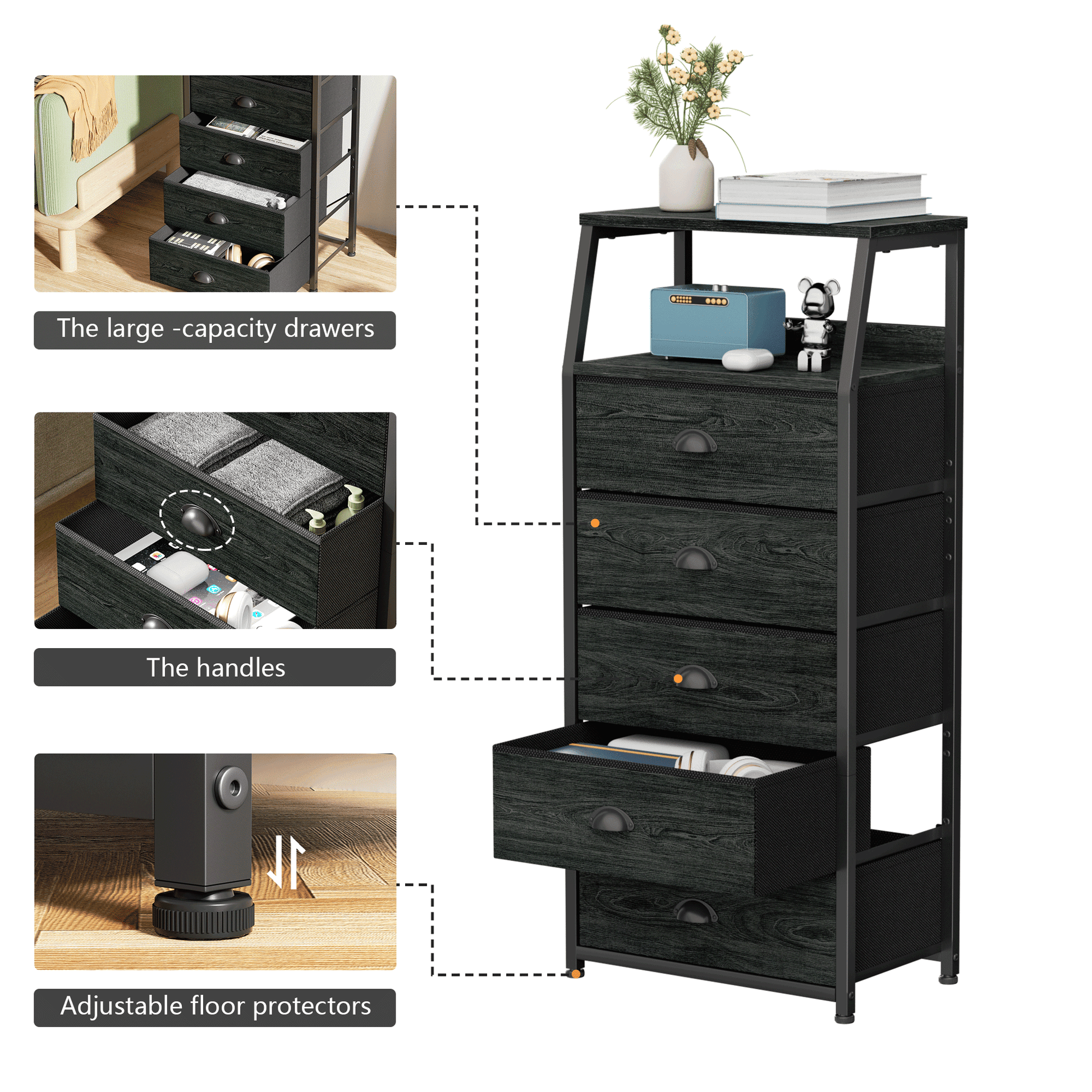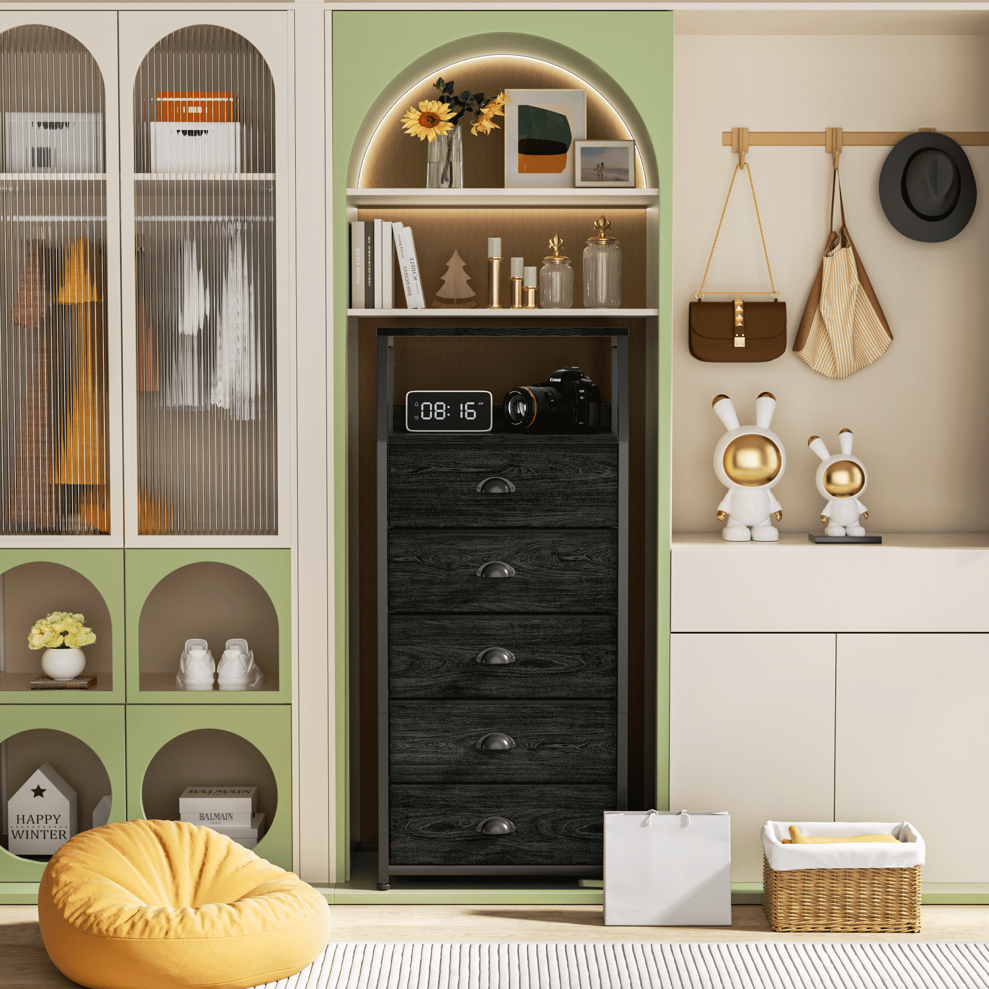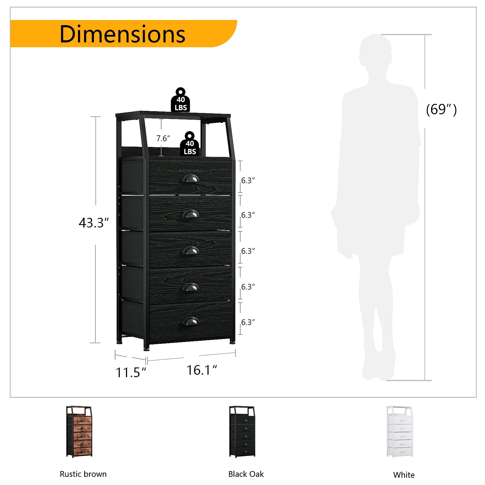 This lightweight dresser is versatile for use in bedrooms, dorms, living rooms, and offices. Suitable for all ages,It features five spacious fabric drawers for storage and a sturdy, water-resistant wooden top for essentials. The steel frame ensures durability, with adjustable feet to protect floors and an anti-toppling device for safety. Each fabric drawer supports up to 10 lbs, and the tabletop can hold 50 lbs. Suitable for all ages, assembly takes just 10 minutes, with 24/7 customer support available. Ideal for adults.