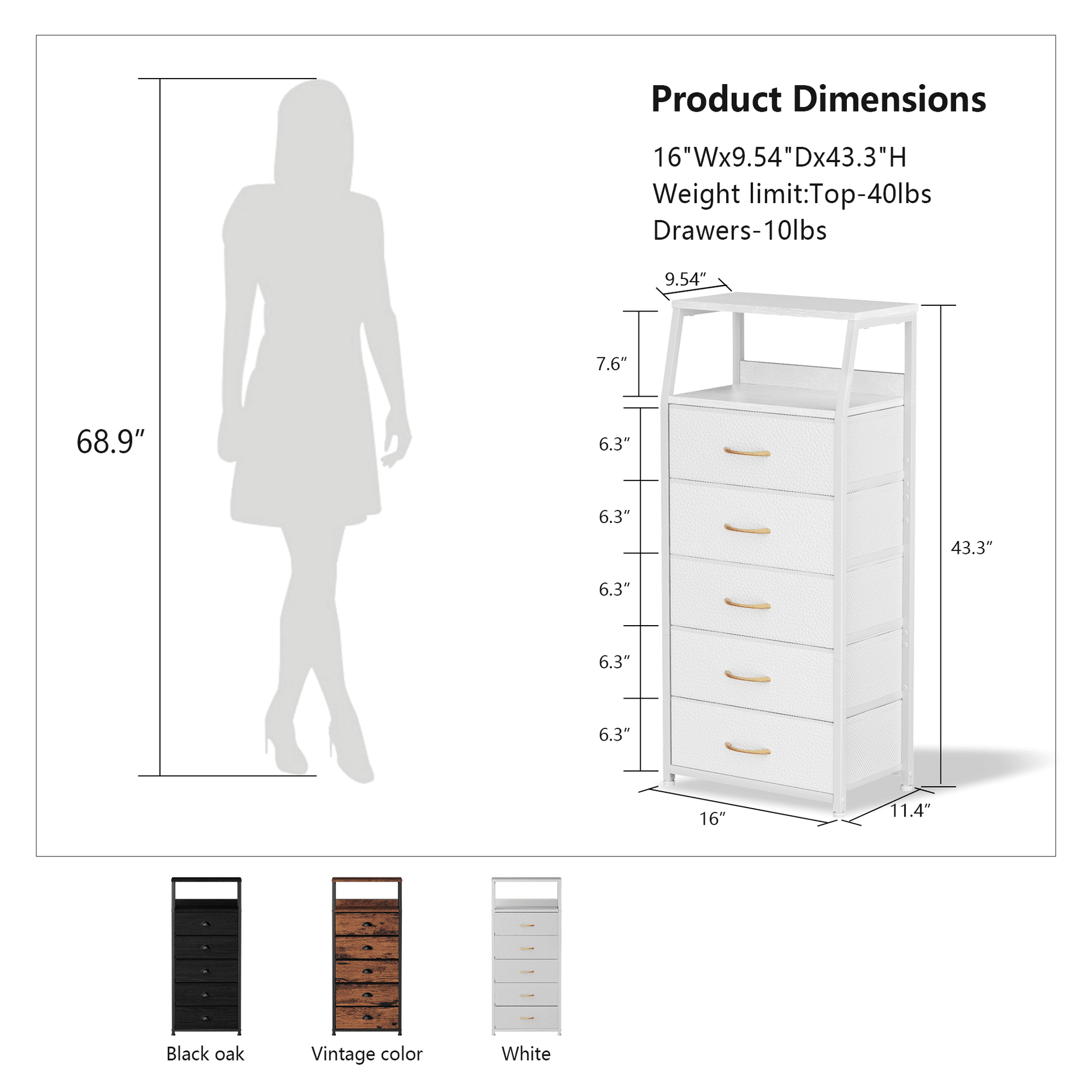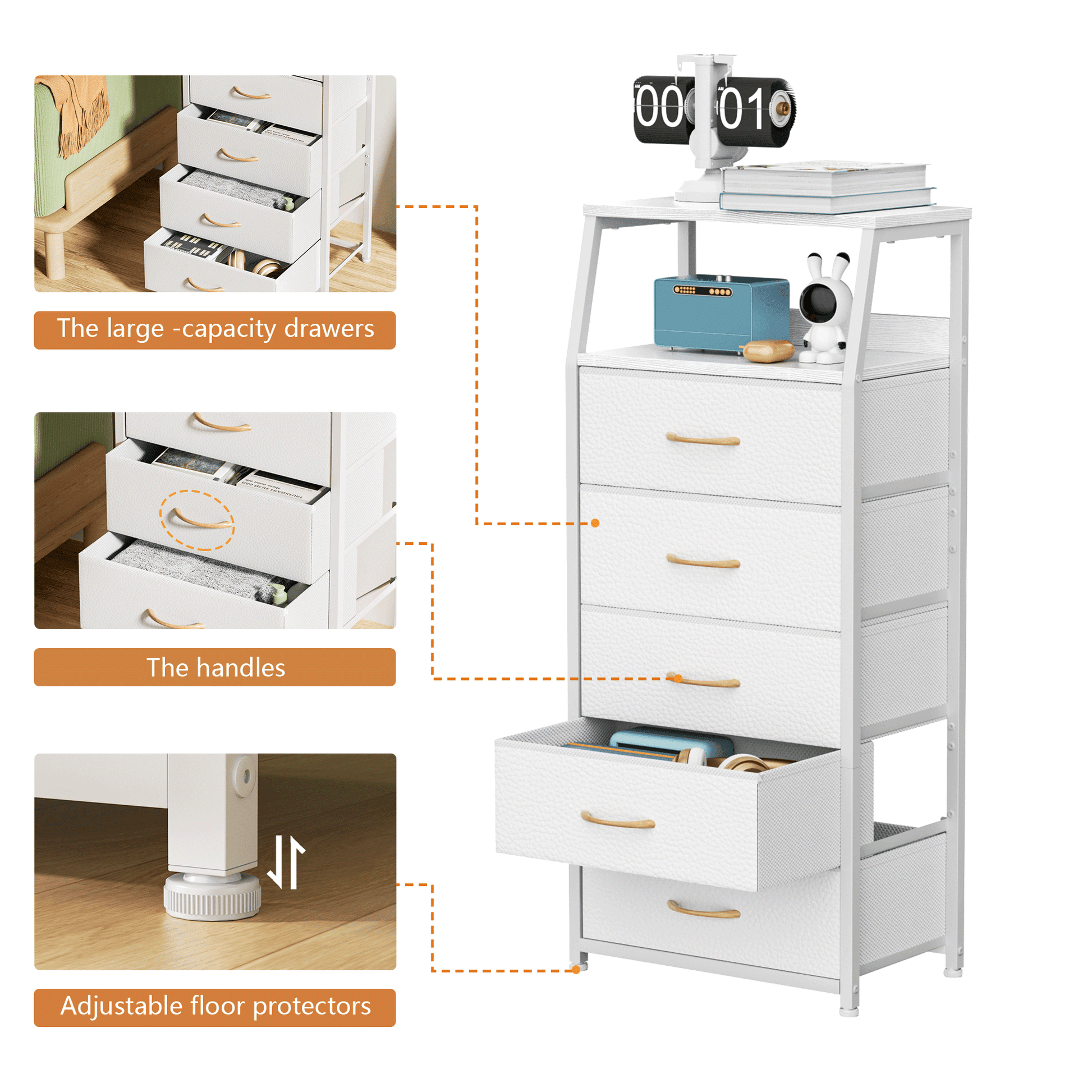 This lightweight dresser is versatile for use in bedrooms, dorms, living rooms, and offices. Suitable for all ages,It features five spacious fabric drawers for storage and a sturdy, water-resistant wooden top for essentials. The steel frame ensures durability, with adjustable feet to protect floors and an anti-toppling device for safety. Each fabric drawer supports up to 10 lbs, and the tabletop can hold 50 lbs. Suitable for all ages, assembly takes just 10 minutes, with 24/7 customer support available. Ideal for adults.