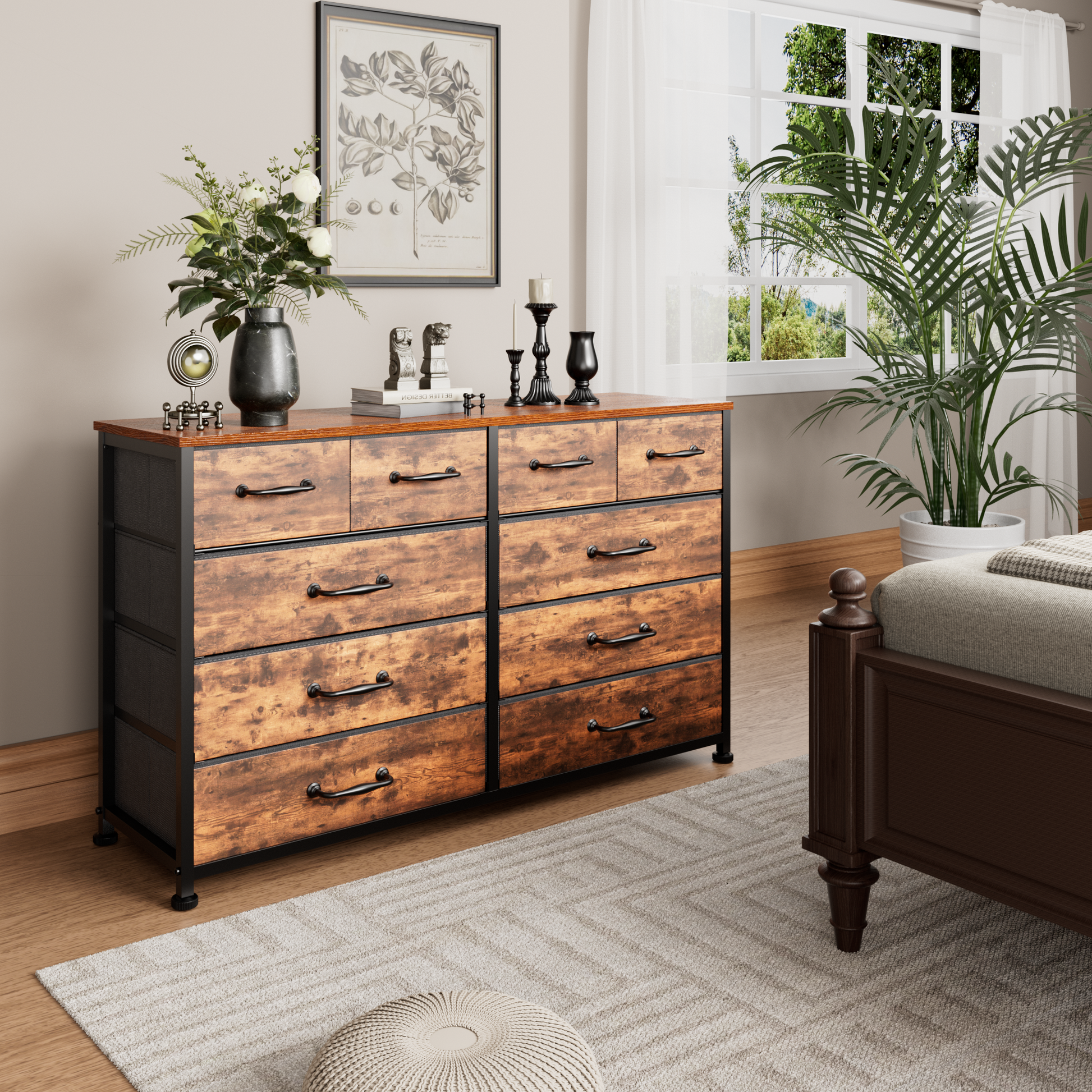 Tydimor Fabric Storage Dresser with 10 Drawers for Bedroom, Modern Wide Chest for Living Room, Rustic Brown