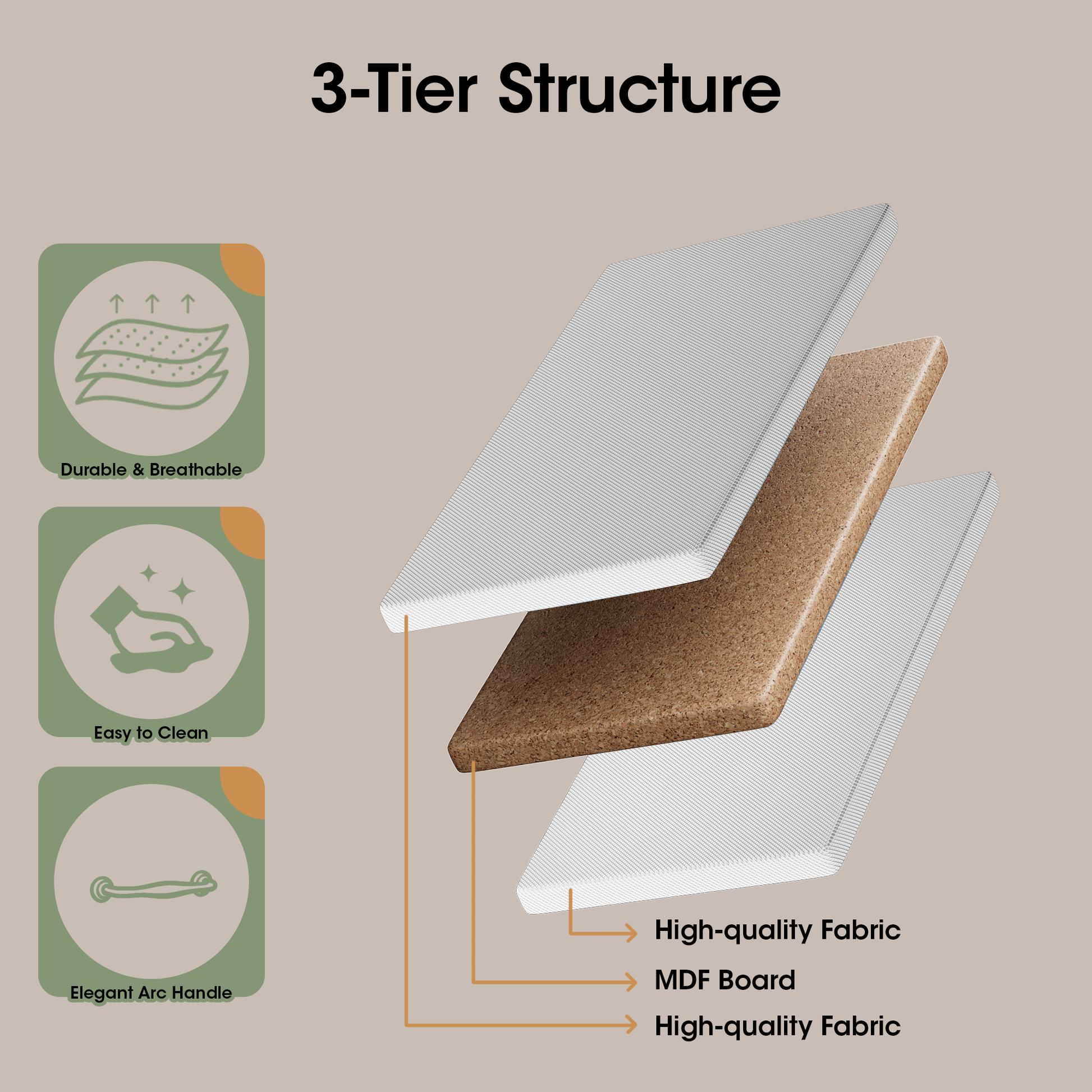Practical Drawer Structure: Each drawer is made of a 3-layer material (polyester fabric + MDF board + non-woven fabric) and equipped with a smooth metal handle. No need to distinguish left/right drawers, making assembly easier and opening/closing smoother