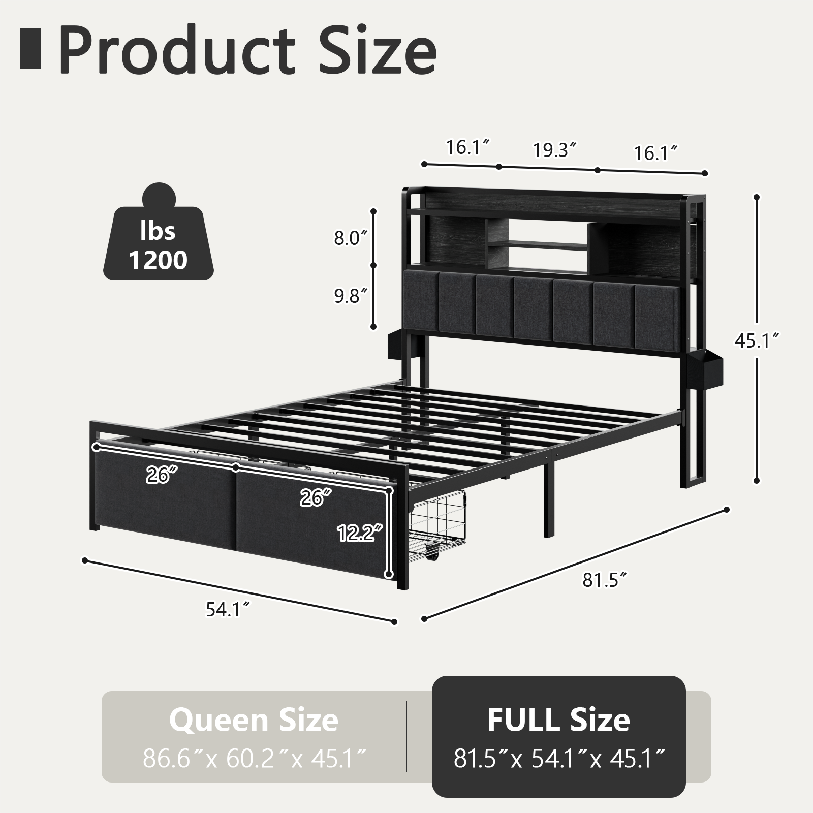 Tydimor Fabric Upholstered Smart Gaming Bed Frames Full Size with Storage Drawers, USB Ports and Outlets, No Box Spring Needed