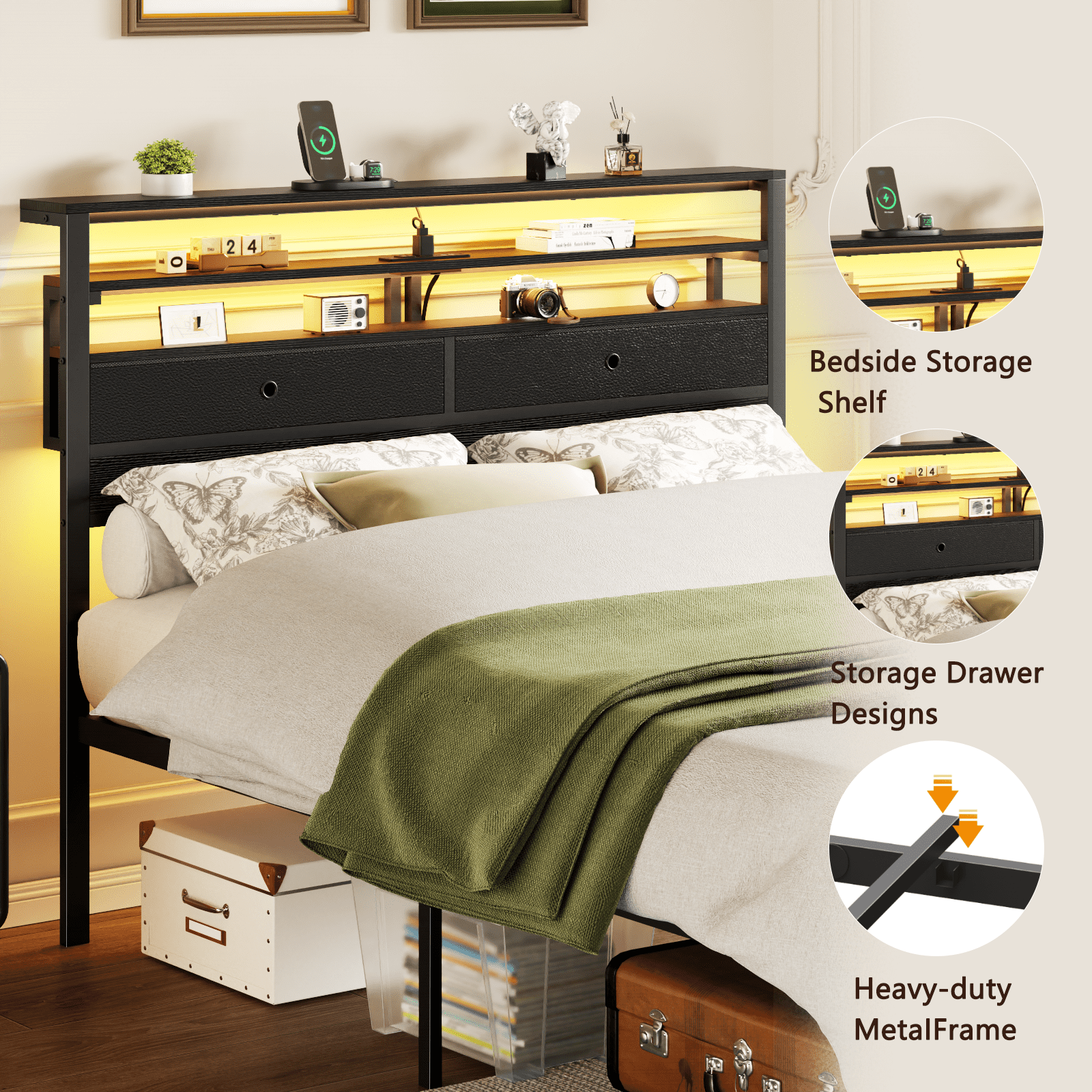 Tydimor Full Size Bed Frame with 2 Storage Drawers Headboard, LED & Charging Station, Black oack