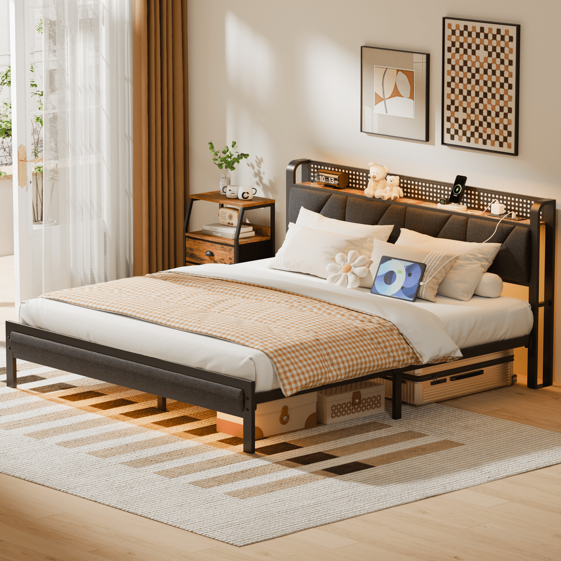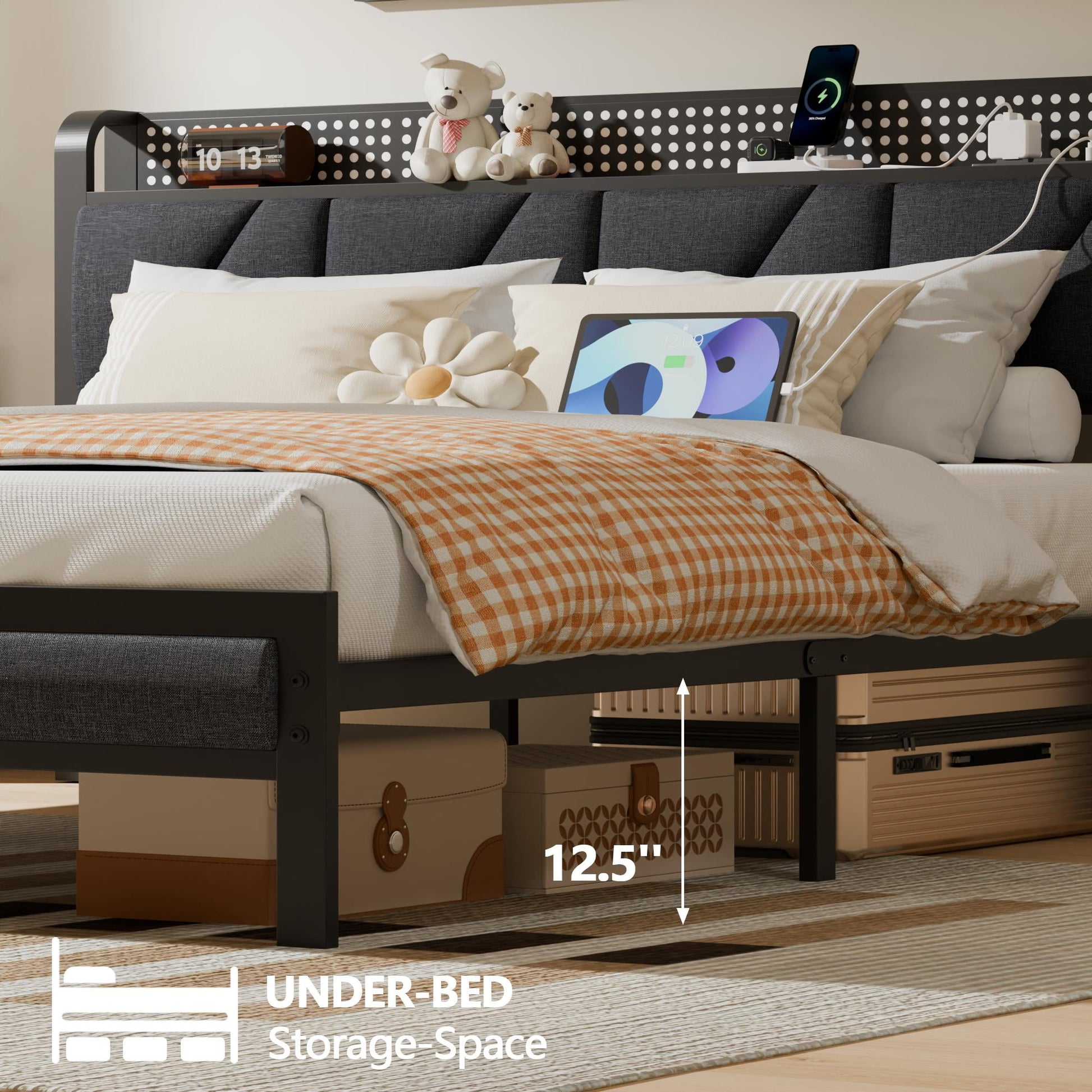 Tydimor Full Size Metal Smart Bed Frames with Upholstered Headboard, LED Lights, USB Ports and Outlets, Storage Shelves & Underbed