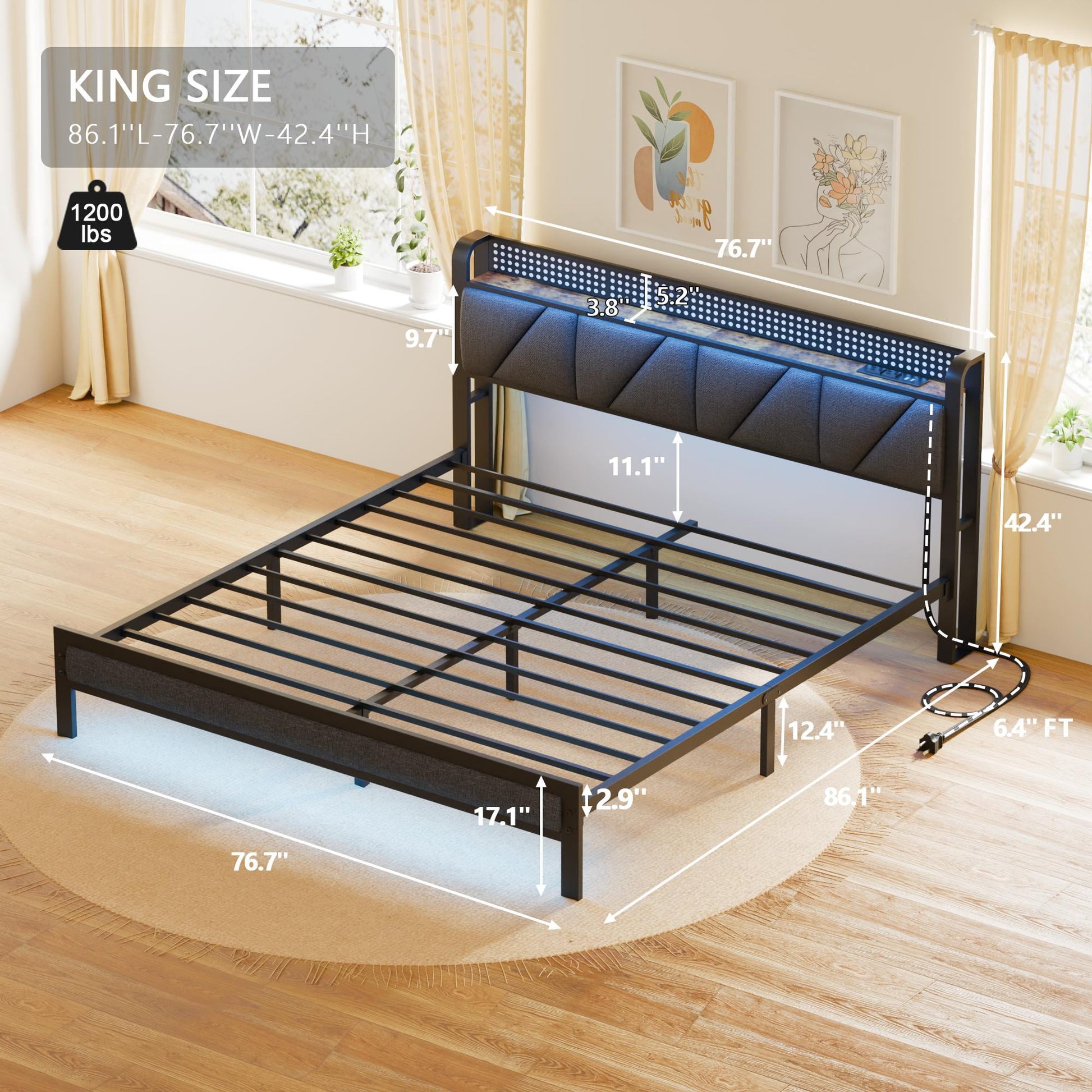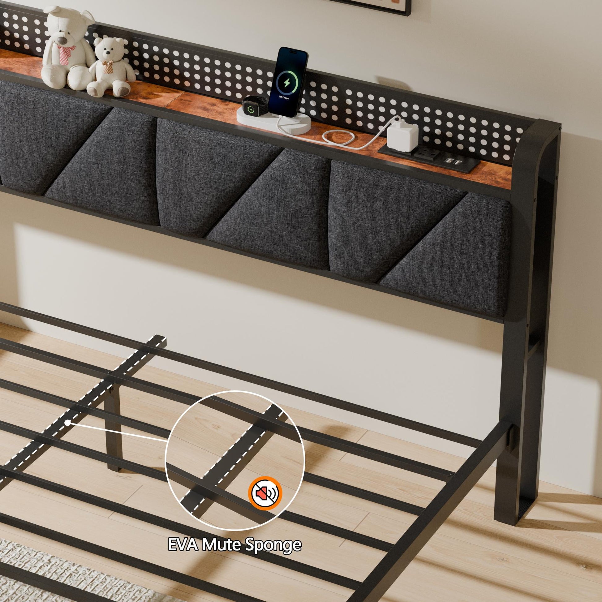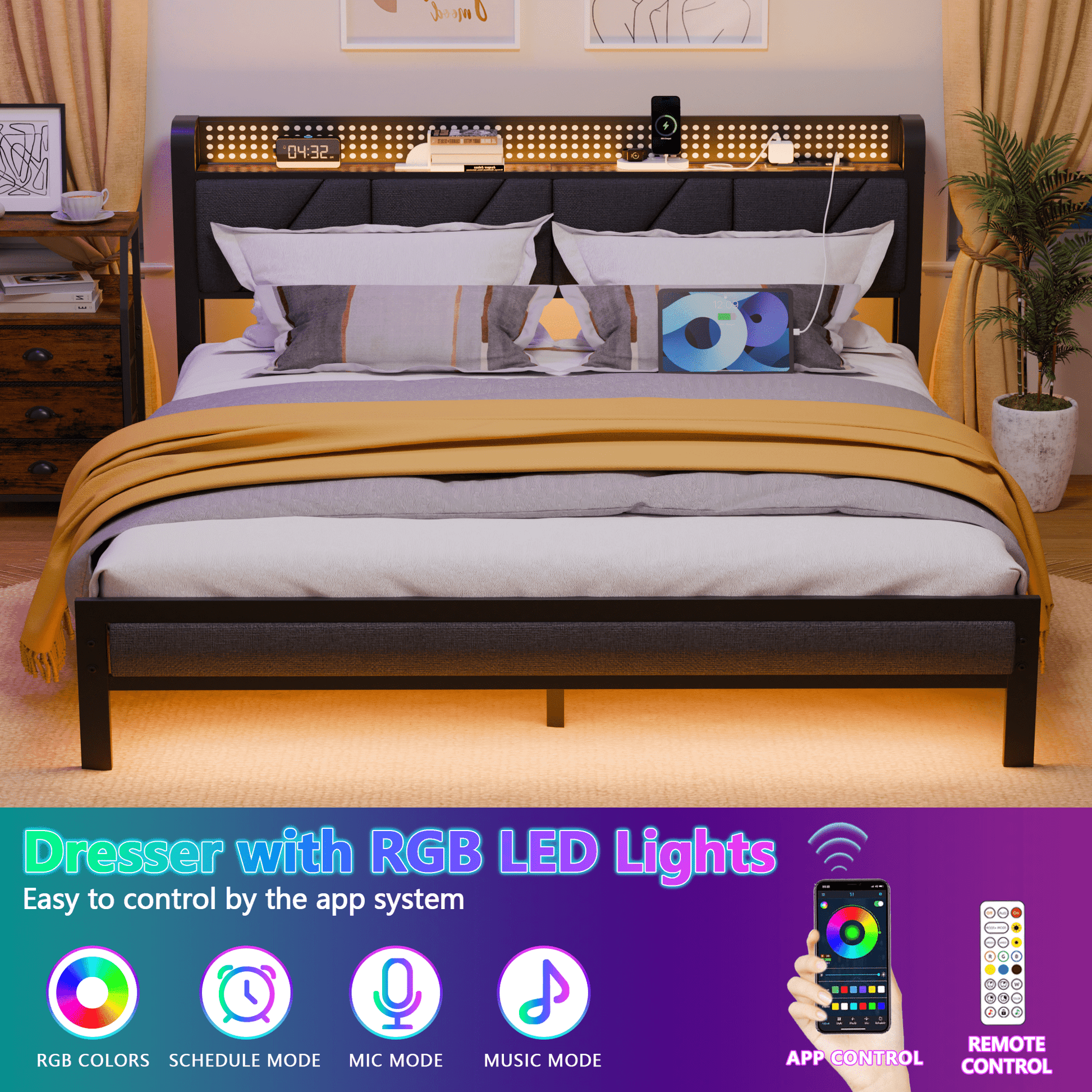 The Tydimor Full size LED bed frame with upholstered headboard is constructed from durable metal, ensuring stable support and protecting the floor from damage. It includes 2 AC outlets and 2 USB ports, allowing for convenient charging of devices such as phones, lamps, and more. The sturdy metal slats can support up to 1200 lbs and are equipped with silent sponges to reduce noise. With 20 color options for the LED lights, the bed can create any desired ambiance using a remote controller or mobile app. This rustic wood bed is a versatile and stylish addition to any bedroom, suitable for a master bedroom.