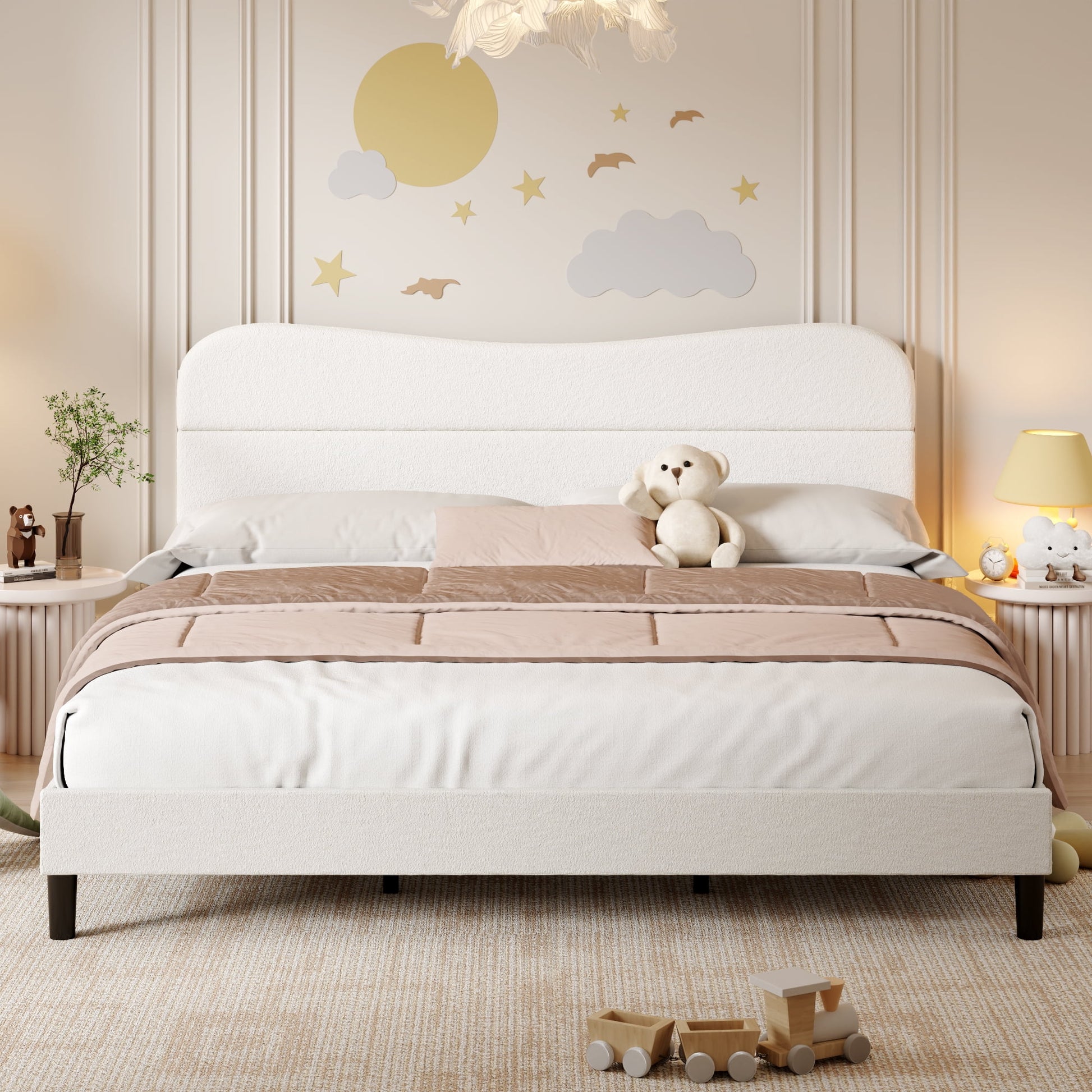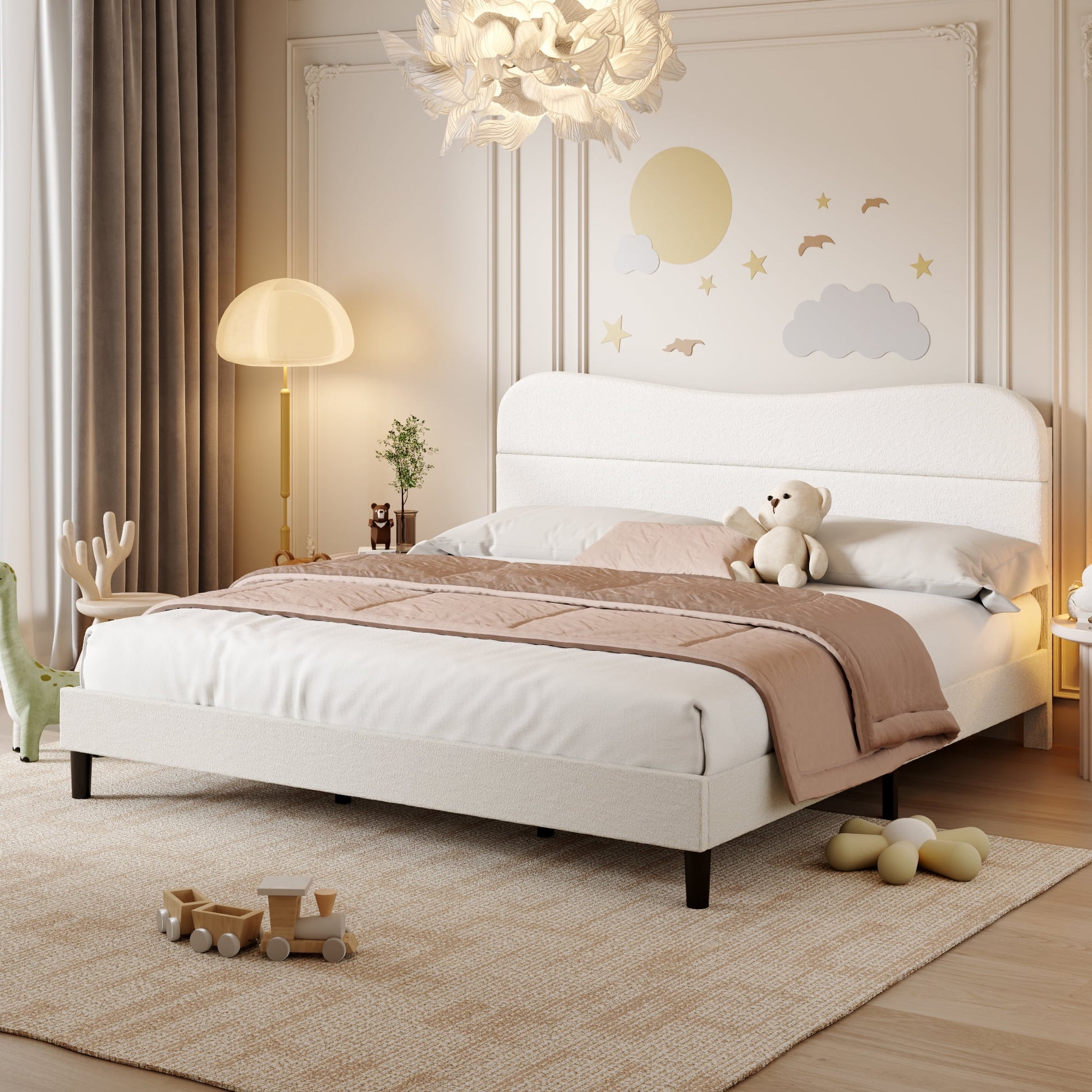 Tydimor King Bed Frame with Teddy Velvet Soft Curved Headboard, Platform Bed with Wooden Slats Support, Easy Assembly, Noise-Free, White