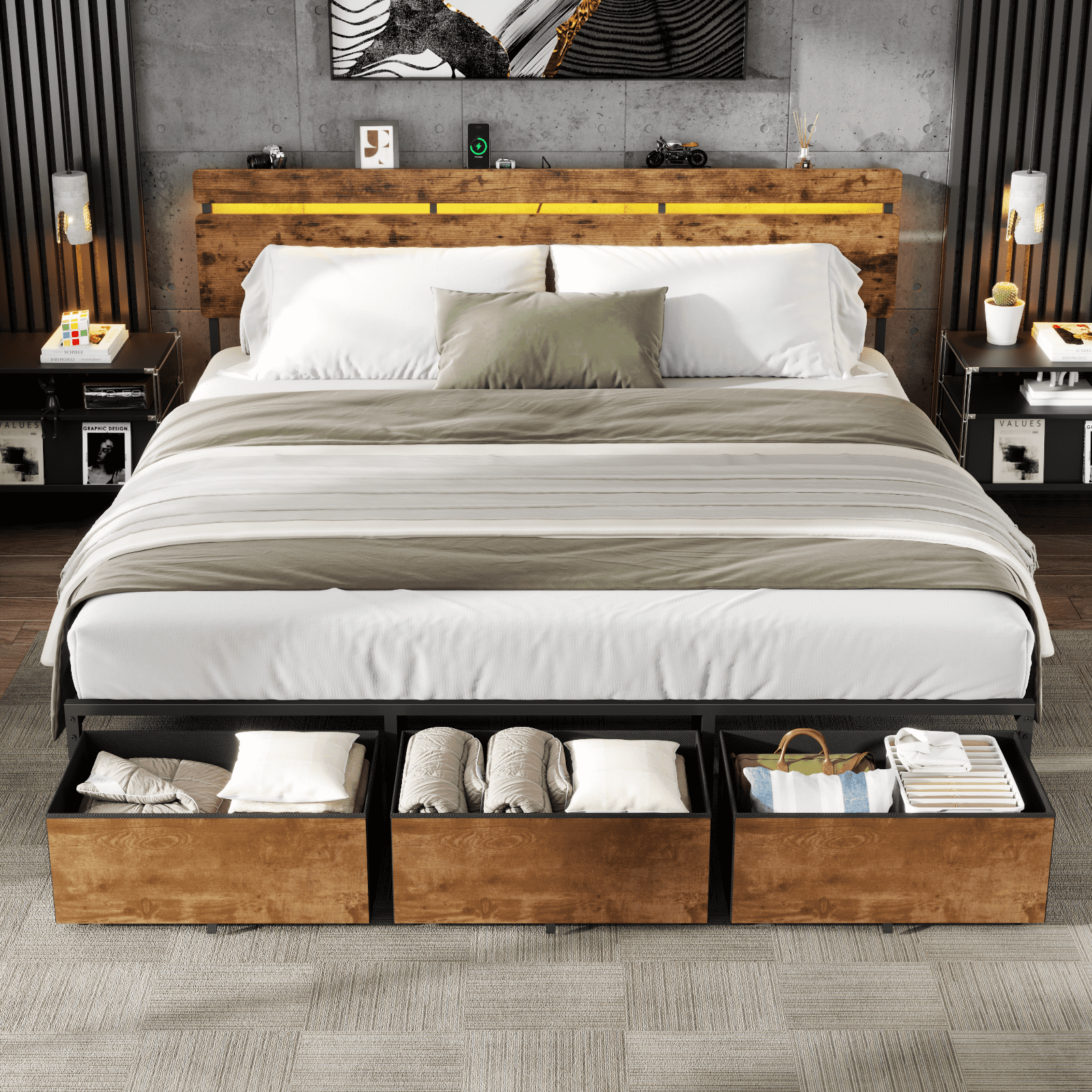 This all-metal bed frame blends functionality, convenience, and style seamlessly: it features 2 under-bed storage drawers to maximize space, a built-in charging station (2 USB + 1 Type-C) with a handy shelf, and customizable RGB LED lights to elevate your bedroom vibe. Boasting exceptional stability, noise-free use, and no box spring required, it¡¯s also designed for hassle-free assembly¡ªfinish setup in under 60 minutes with labeled parts and step-by-step instructions.