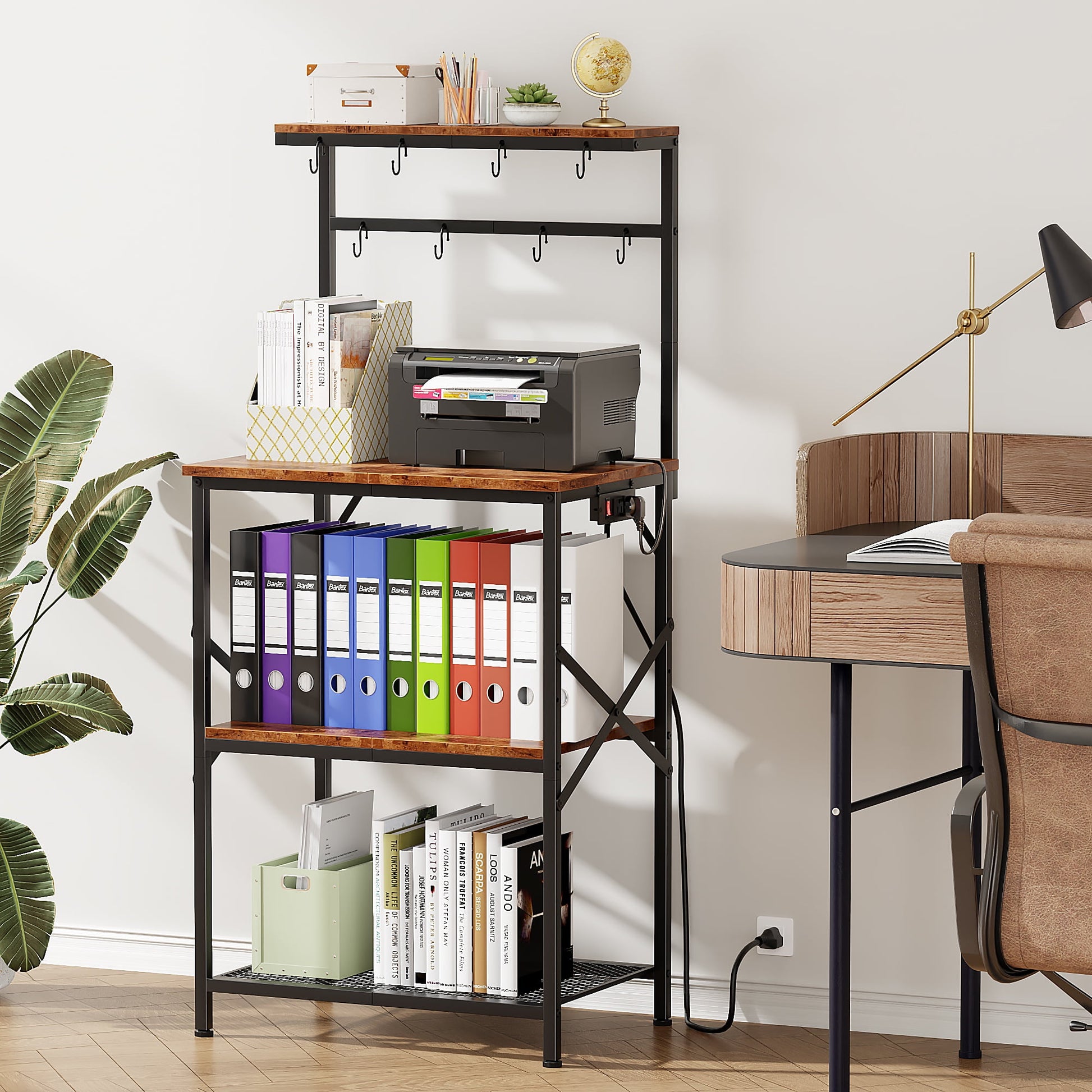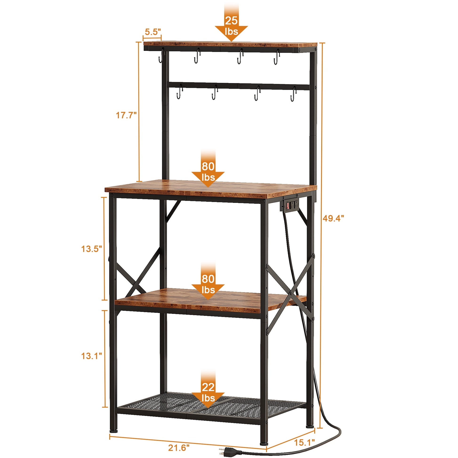 This versatile kitchen storage rack features removable power outlets and an air switch, allowing easy appliance use without clutter. It has a 4-tier design: a top shelf for spices, a middle shelf for appliances, and two lower shelves for essentials, plus six metal hooks. Made with a sturdy steel frame and P2 particleboard, each shelf supports up to 70 pounds. Ideal for various uses, it fits well in any room. Suitable for adults. Easy to assemble in 23 minutes, with 24/7 customer support.