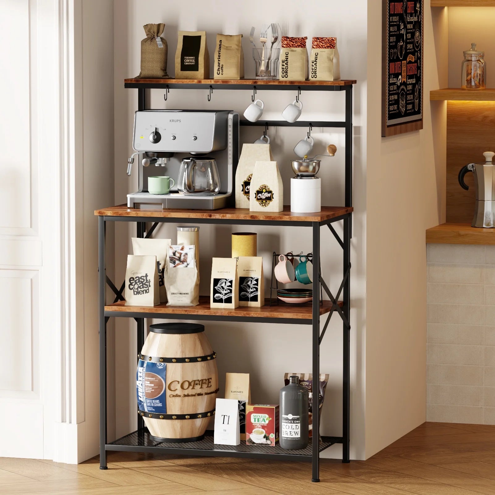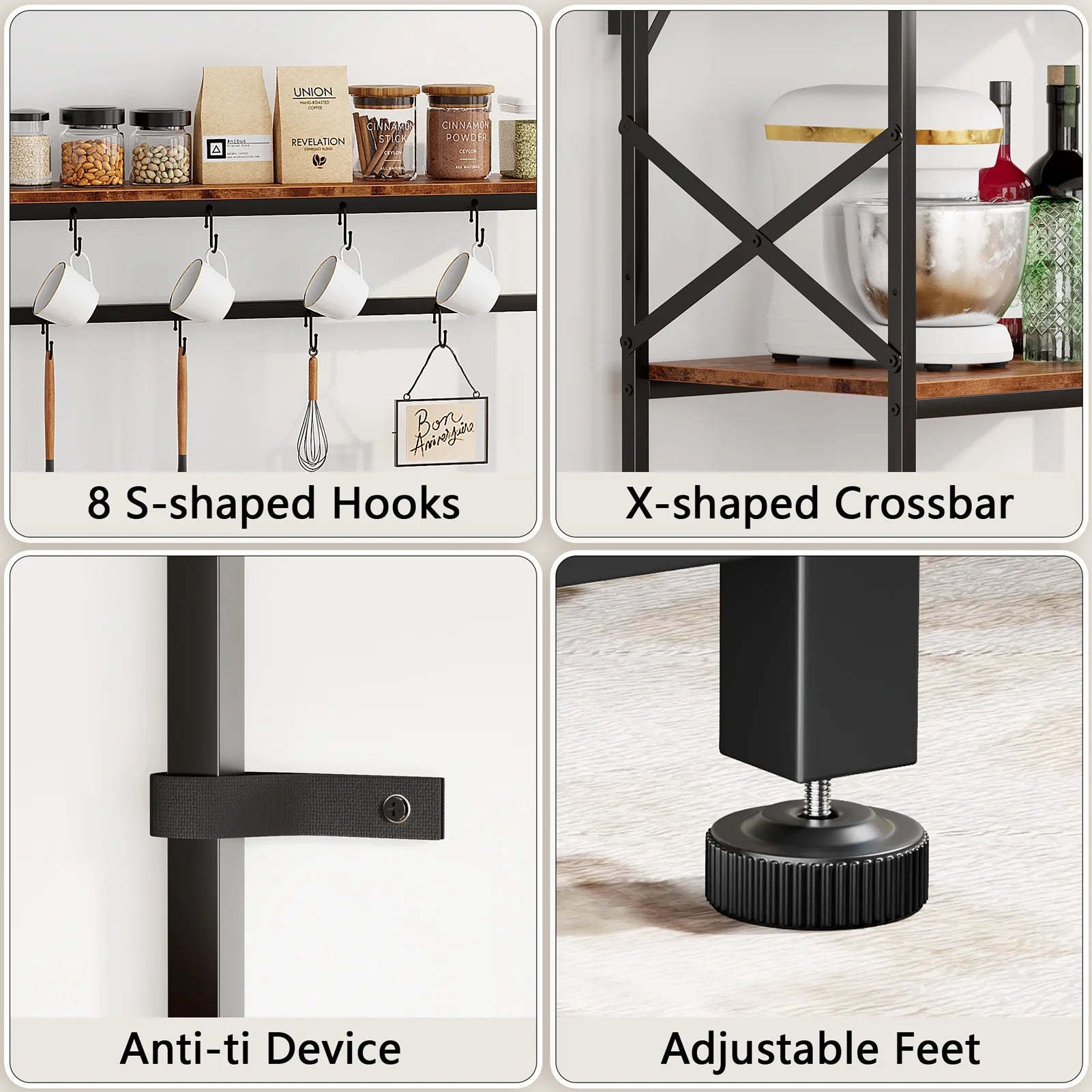 This versatile kitchen storage rack features a 4-tier design: a top shelf for spices, a middle shelf for appliances, and two lower shelves for essentials, plus six metal hooks. Made with a sturdy steel frame and P2 particleboard, each shelf supports up to 80 pounds. Ideal for various uses, it fits well in any room. Suitable for adults. Easy to assemble in 20 minutes, with 24/7 customer support.