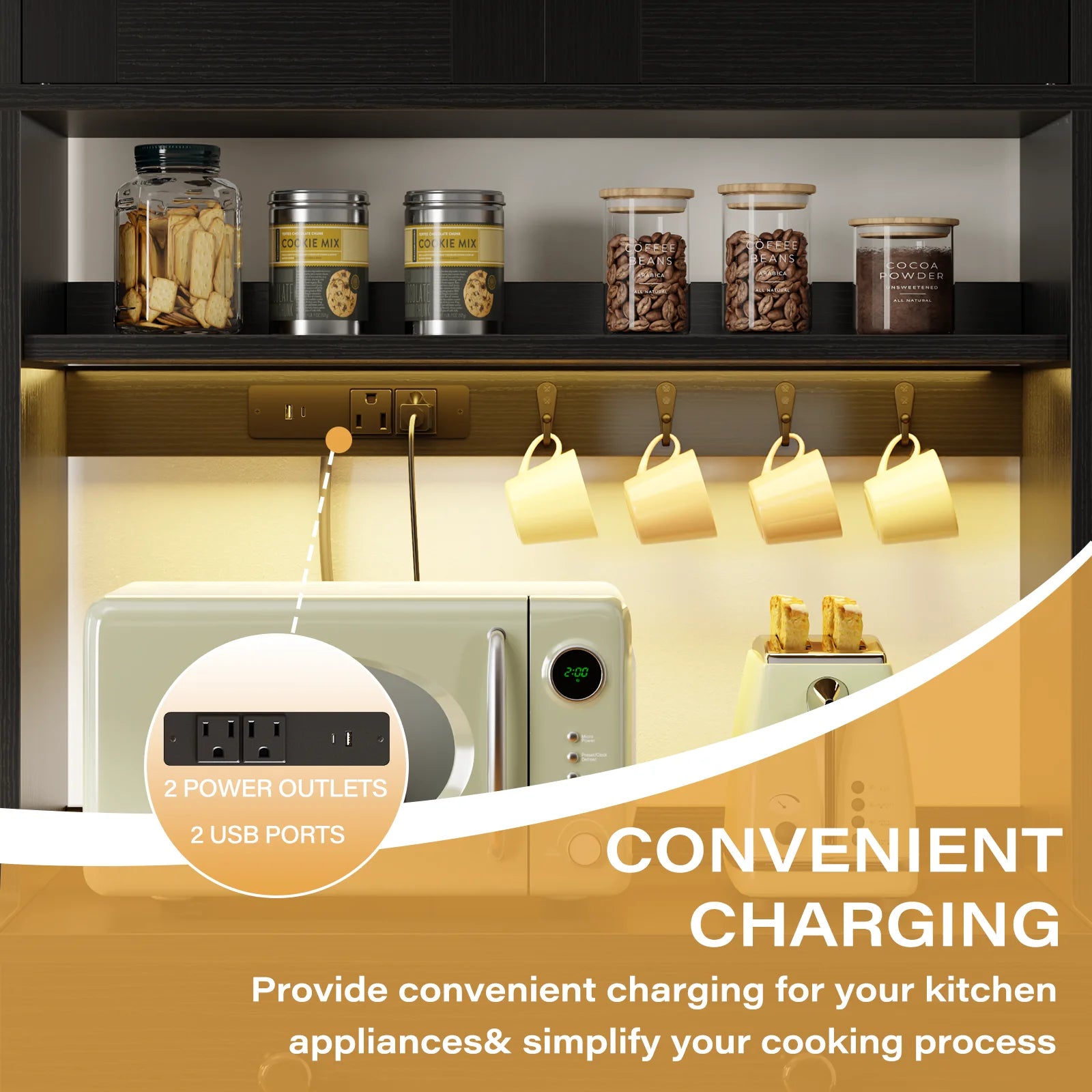 Built-in Charging Ports: Includes 2 electrical outlets, 1 USB port, and 1 Type-C port, ideal for powering small kitchen appliances like coffee makers and toasters