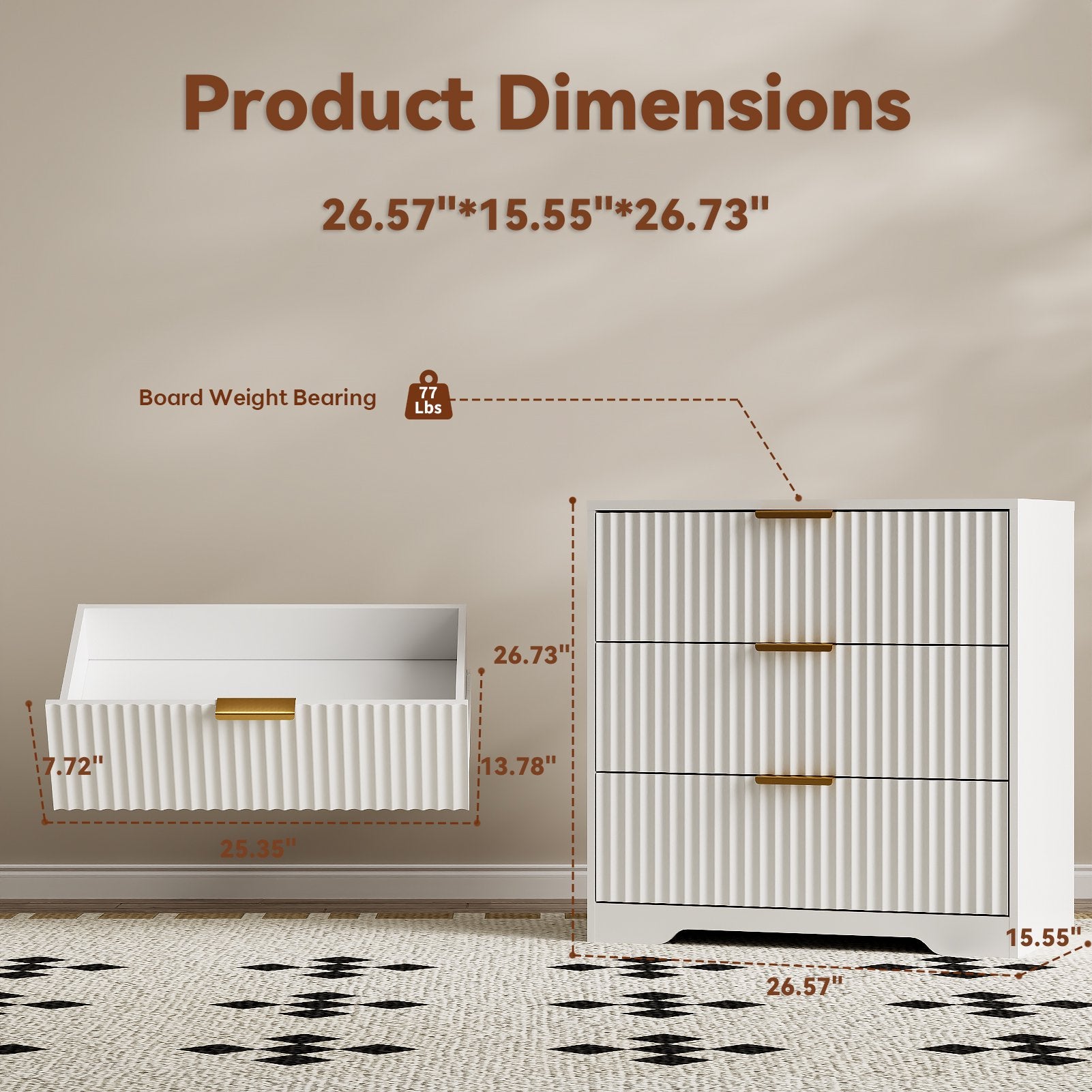 Transform your bedroom into a minimalist, upscale private sanctuary with this fluted drawer chest. Bid farewell to cluttered surfaces and cramped storage—this sleek piece not only elevates your space’s vibe with its elegant cream-and-gold palette, but also tucks away daily essentials neatly in its spacious drawers. The distinctive fluted panels exude a subtle luxury ambiance, while smooth slide rails and water-resistant, easy-to-clean high-grade MDF board merge functionality and sophistication seamlessly, helping you craft a relaxed yet polished living atmosphere. Specifications: Product Dimensions: 26.57×15.55×26.73 inches Product Weights: 43.7838 lbs Color: White Number of Drawers: 3 Drawer Dimensions: 25.35×13.78×7.72 inches Package include: 1 x Nightstand 1 x Manual