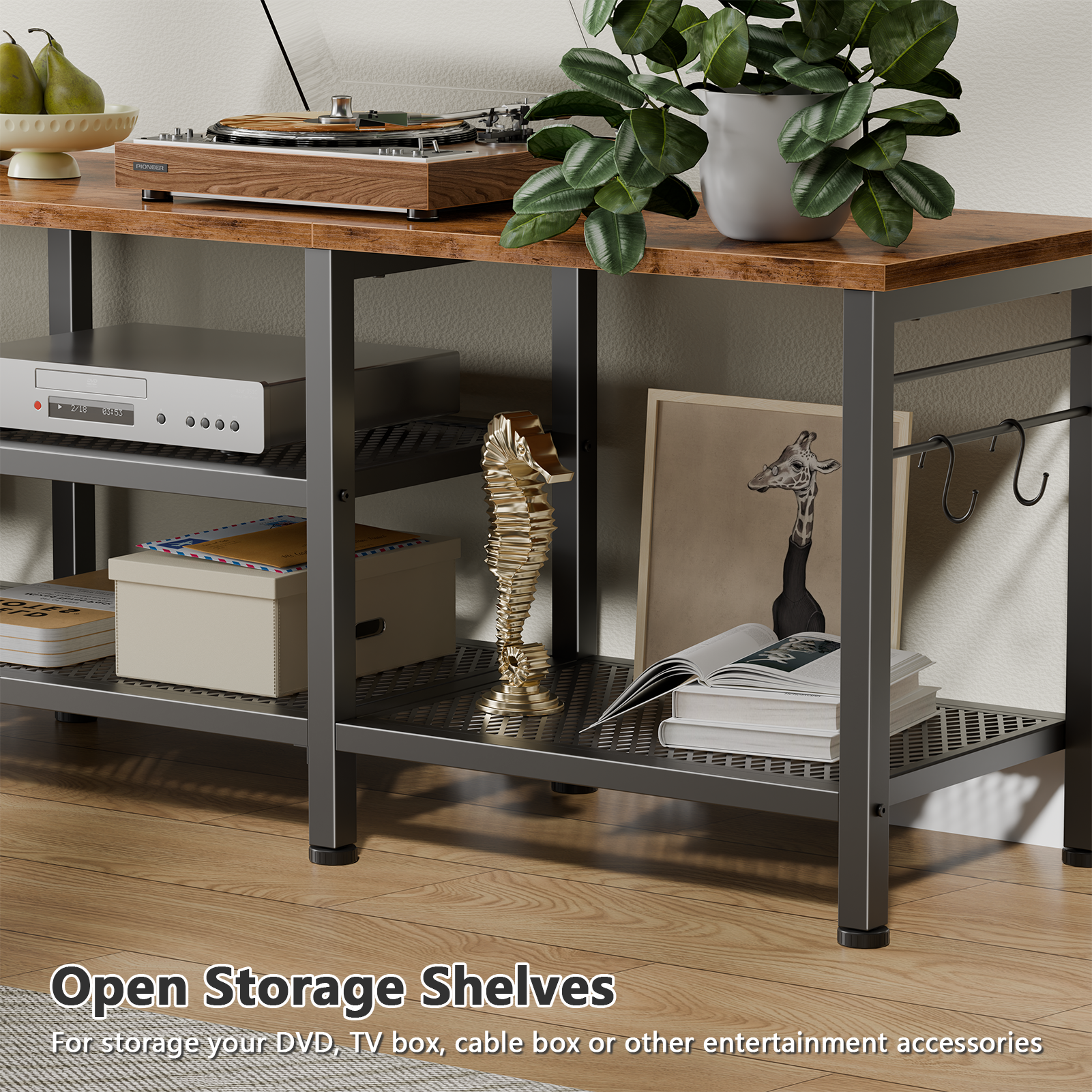 Ample Storage Space: with 2 open mesh shelves and 4 hooks, this TV stand offers generous room for organizing your media equipment, gaming consoles, and DVDs, keeping your living room tidy and clutter-free