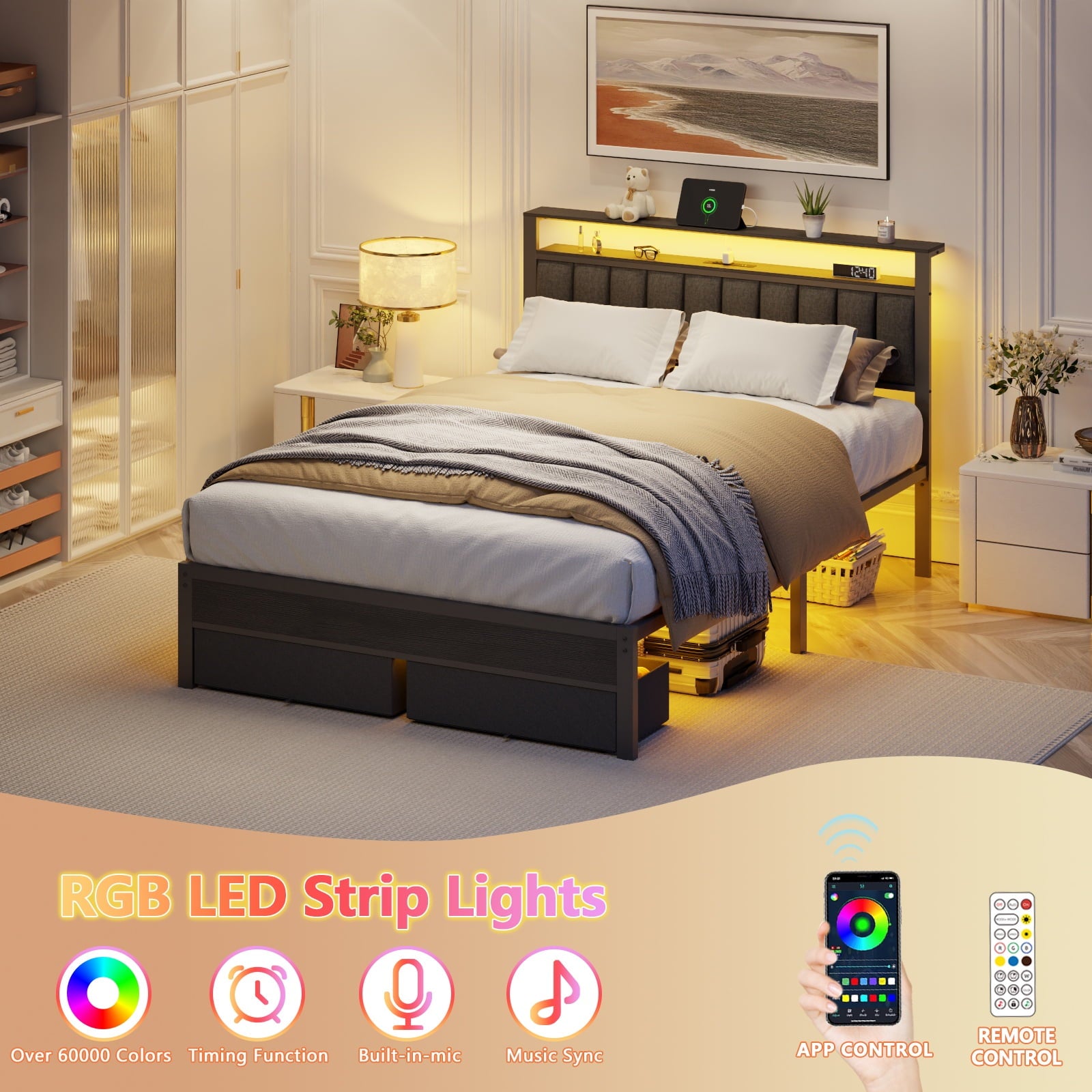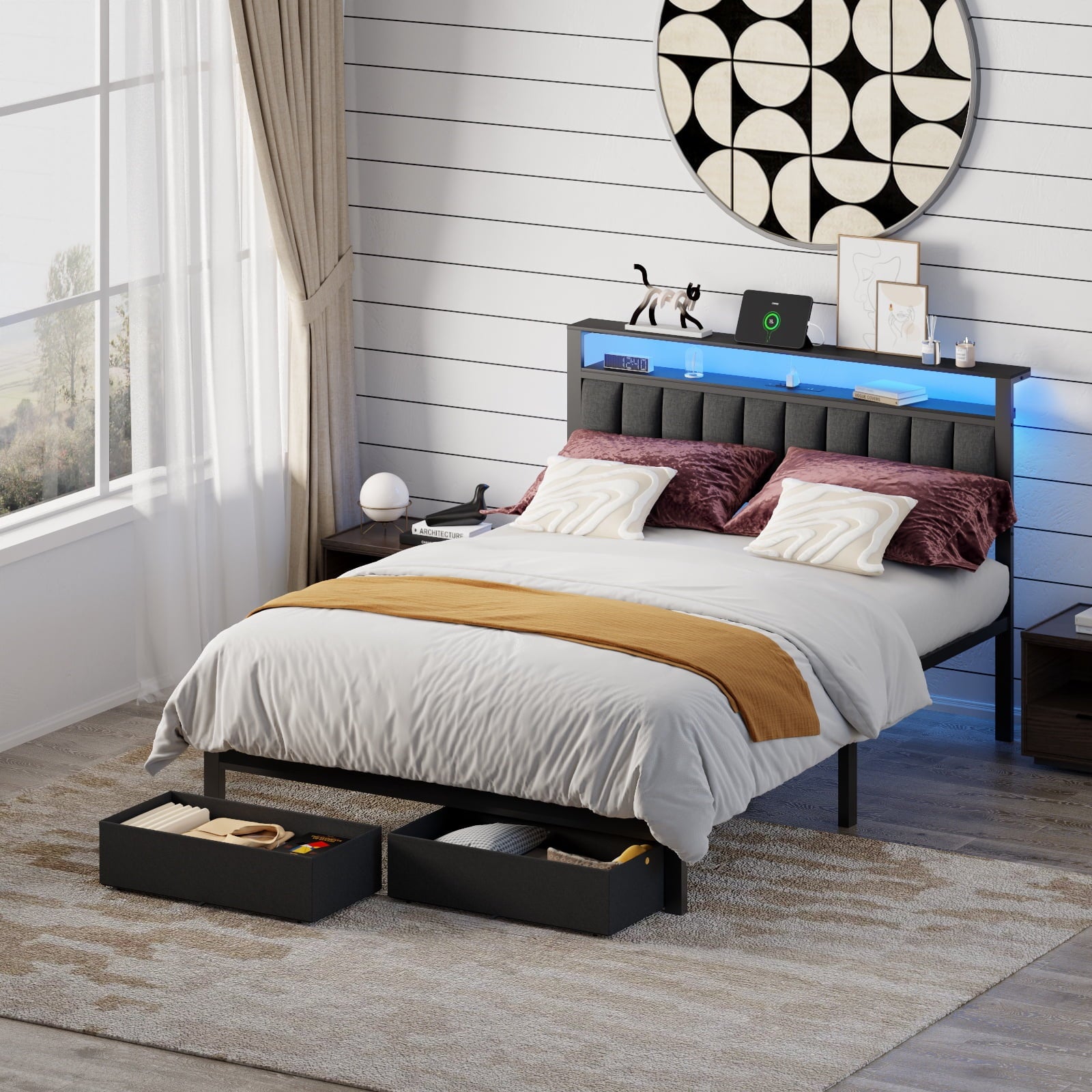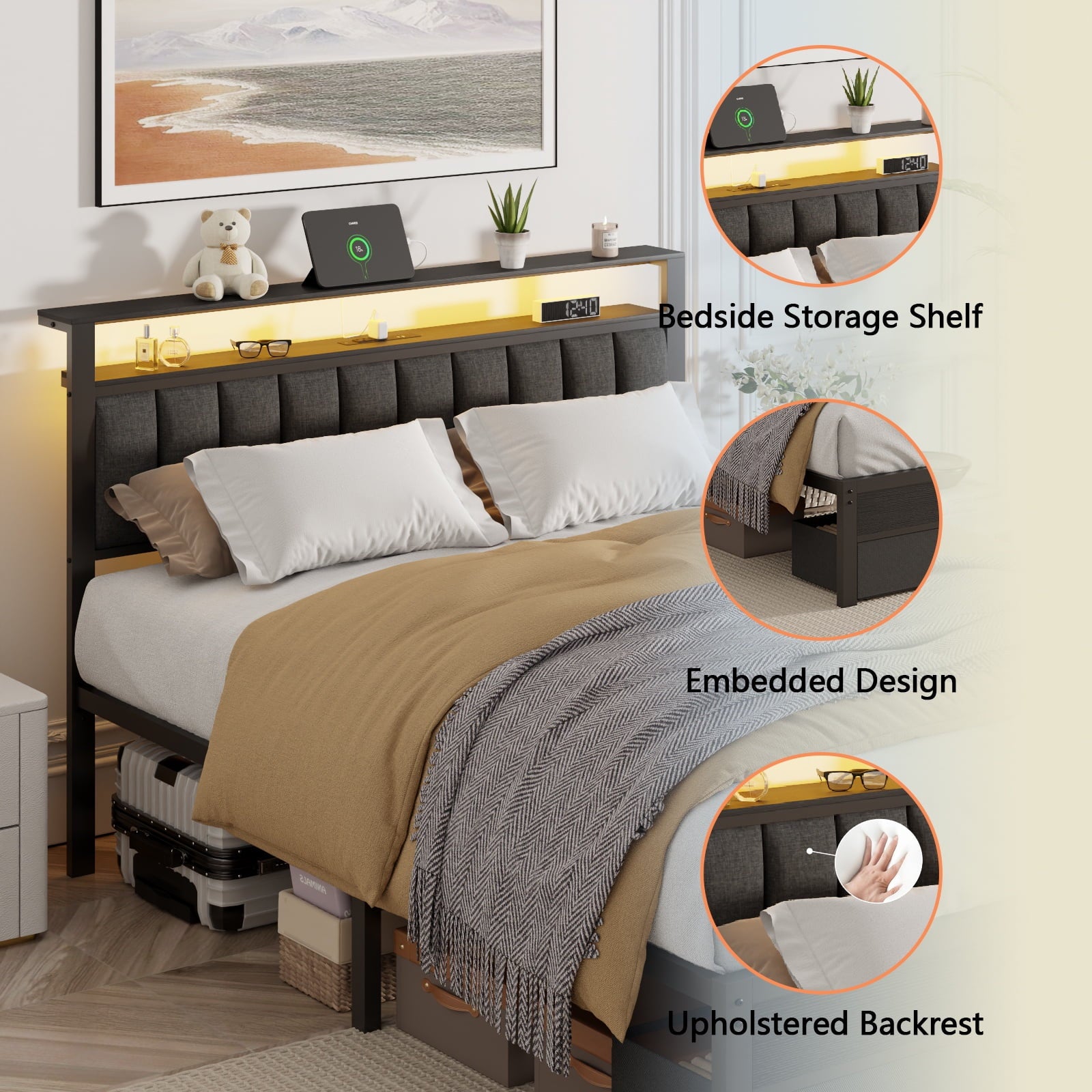Tydimor Queen Bed Frame with 2 Drawers & Storage Headboard, Platform Metal Bed with 2 USB Ports and Outlets, No Box Spring Needed