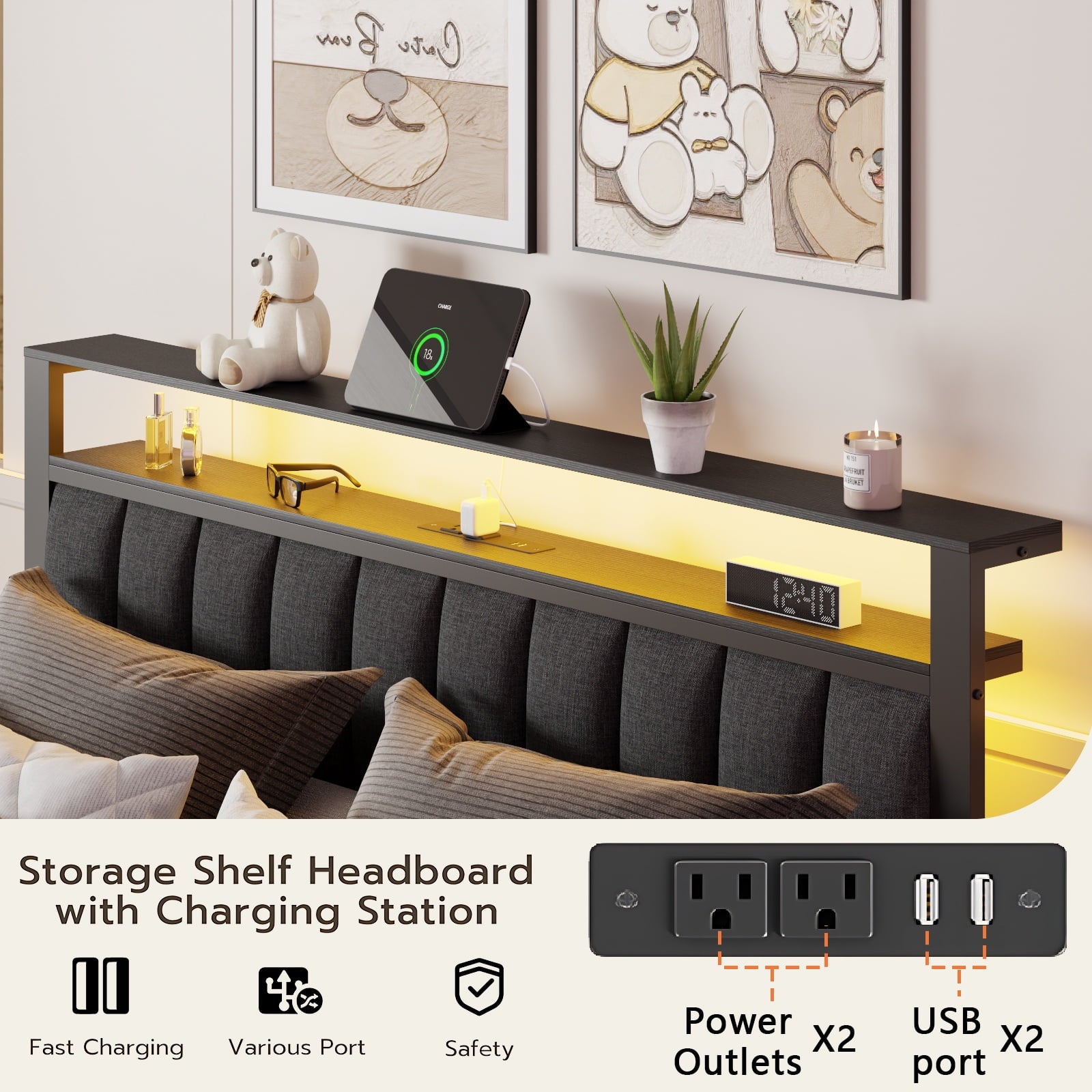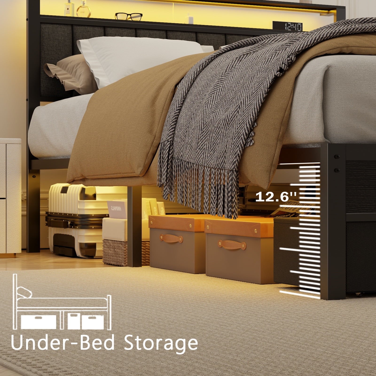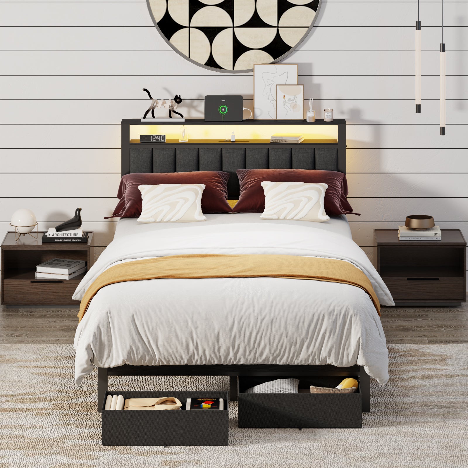 Tydimor Queen Bed Frame with 2 Drawers & Storage Headboard, Platform Metal Bed with 2 USB Ports and Outlets, No Box Spring Needed