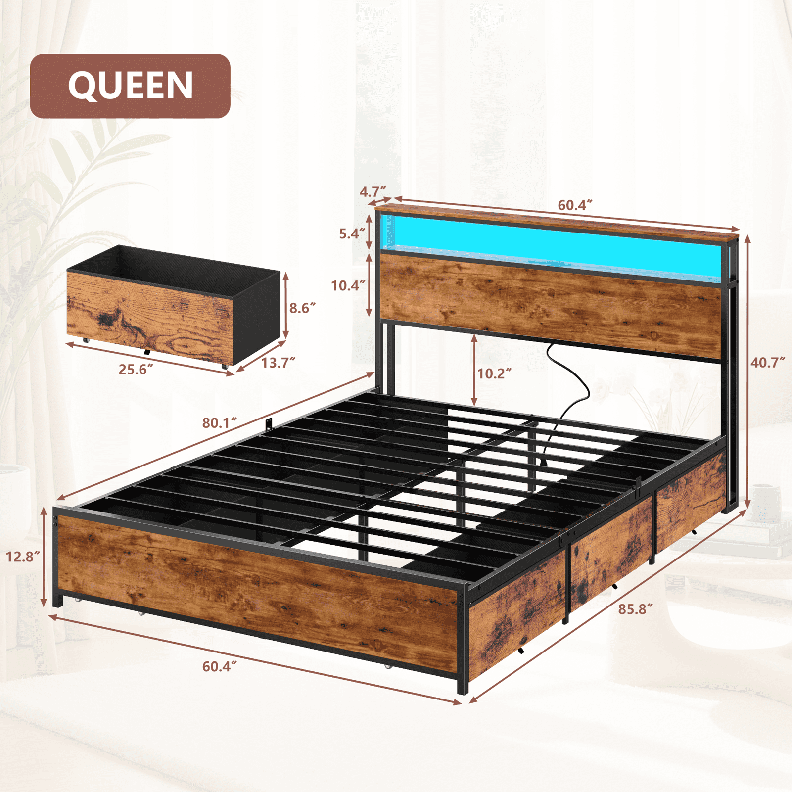 Tydimor Queen Bed Frame with 6 Storage Drawers, Metal Platform Bed Frame with 2-Tier Storage Headboard & LED, Built in Charging Station, Noise-Free, No Box Spring Needed, Rustic Brown