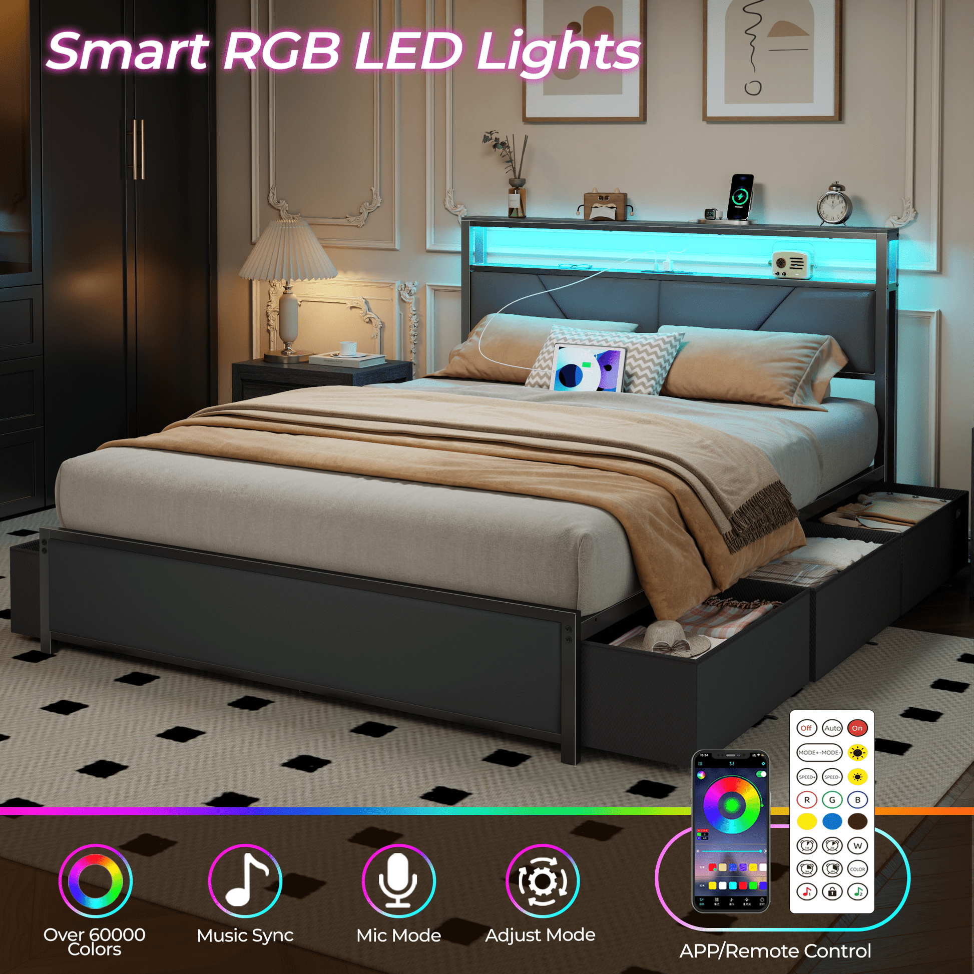 Tydimor Queen Bed Frame with 6 Storage Drawers, Metal Platform Bed Frame with 2-Tier Storage Upholstered Headboard & LED, Built in Charging Station, Noise-Free, No Box Spring Needed, Black