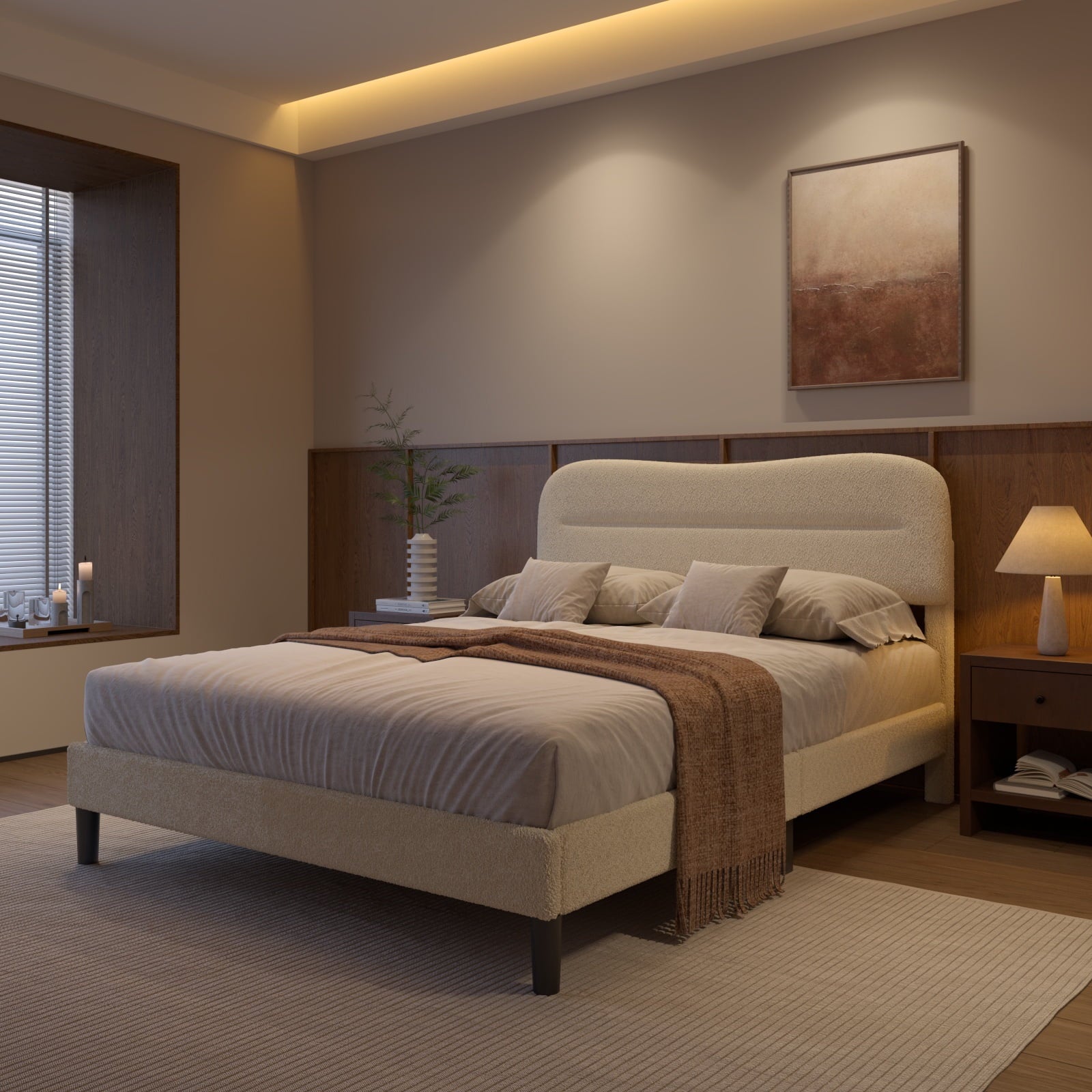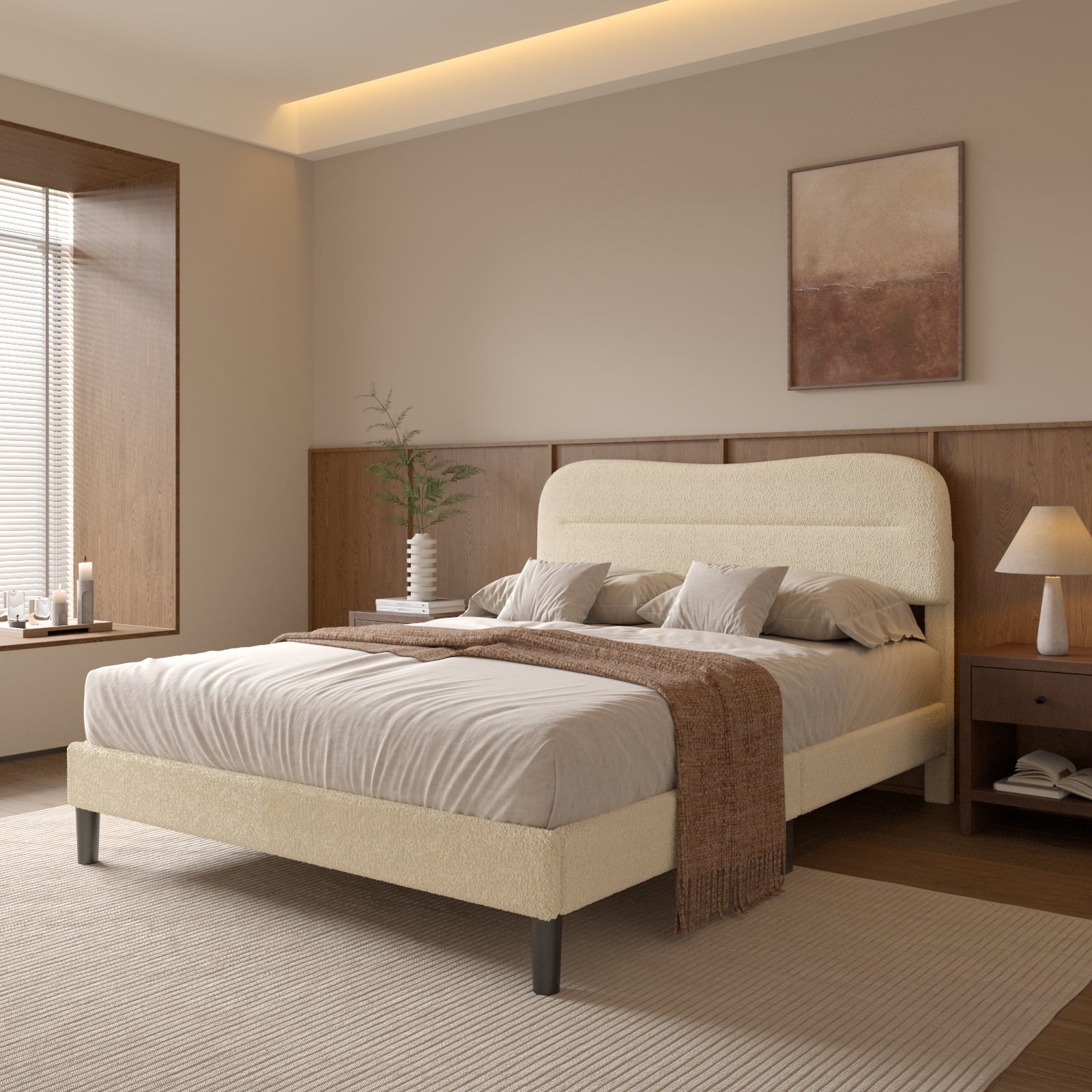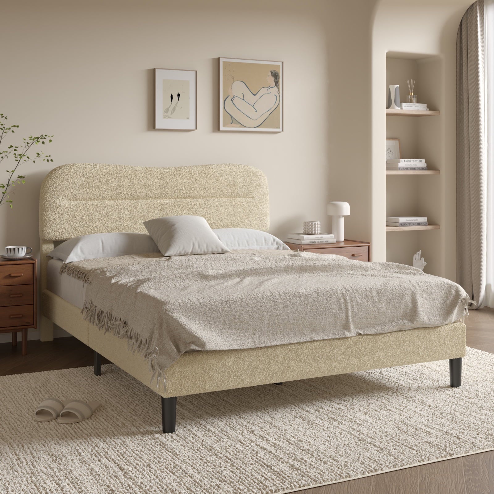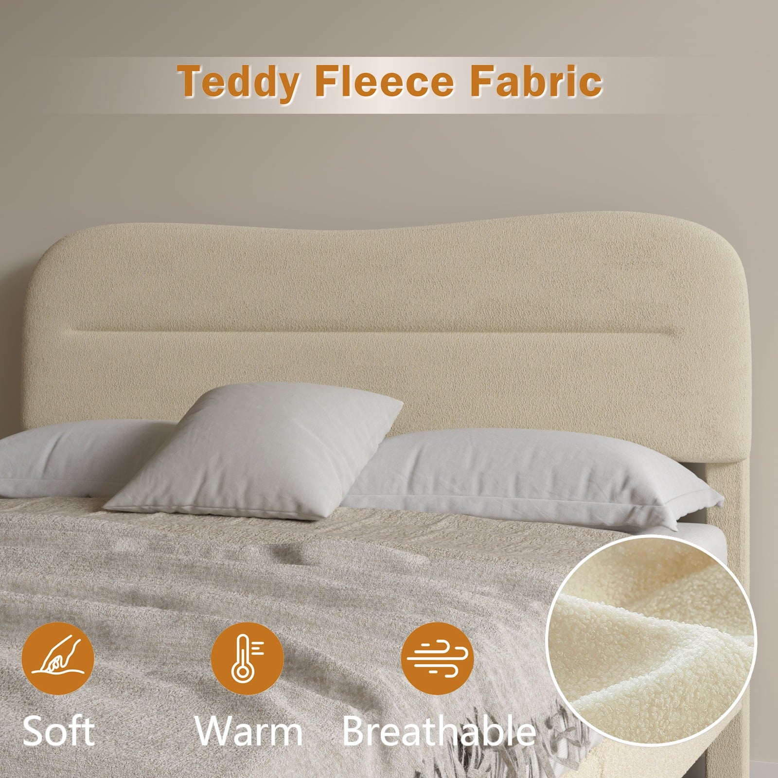 Tydimor Queen Bed Frame with Teddy Velvet Soft Curved Headboard, Platform Bed with Wooden Slats Support, Easy Assembly, Noise-Free, Beige