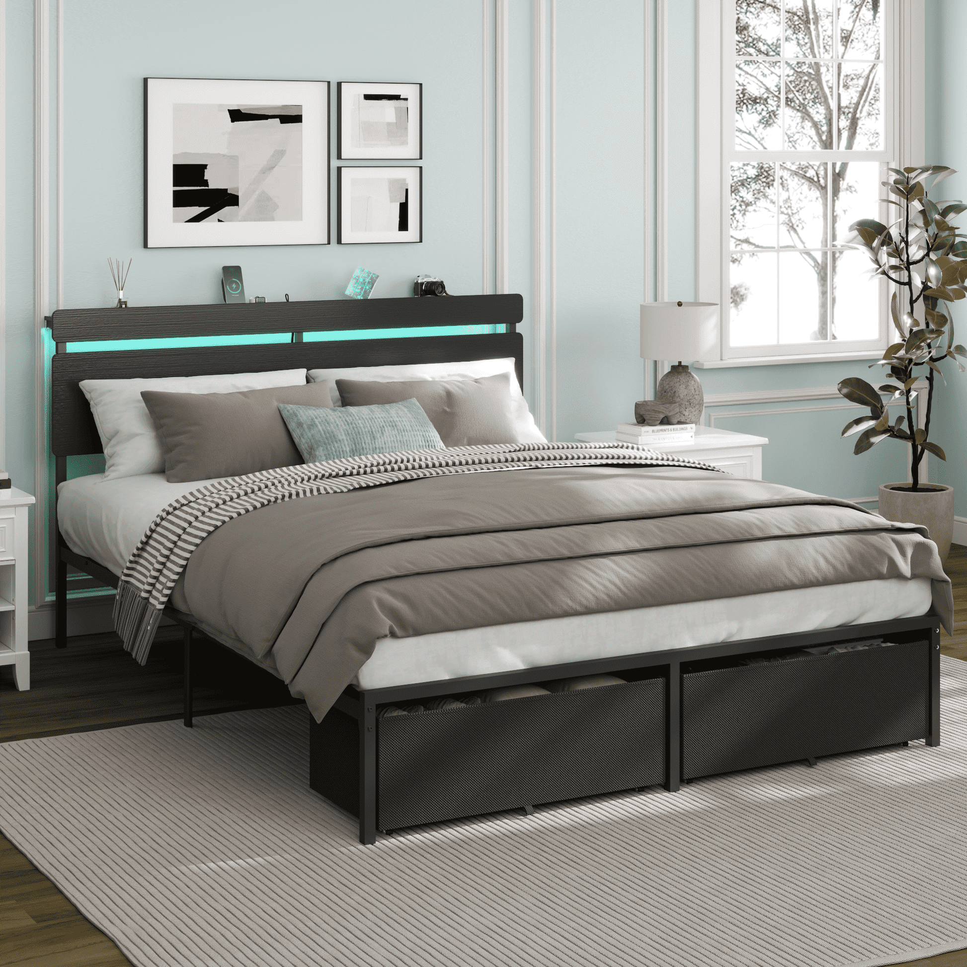 Tydimor Queen Size Bed Frame with 2 Drawers & LED Lights & Charging Station, Beds with Headboard & 10.10" Under Bed Storage, No Box Spring Needed, Easy Assembly, Black
