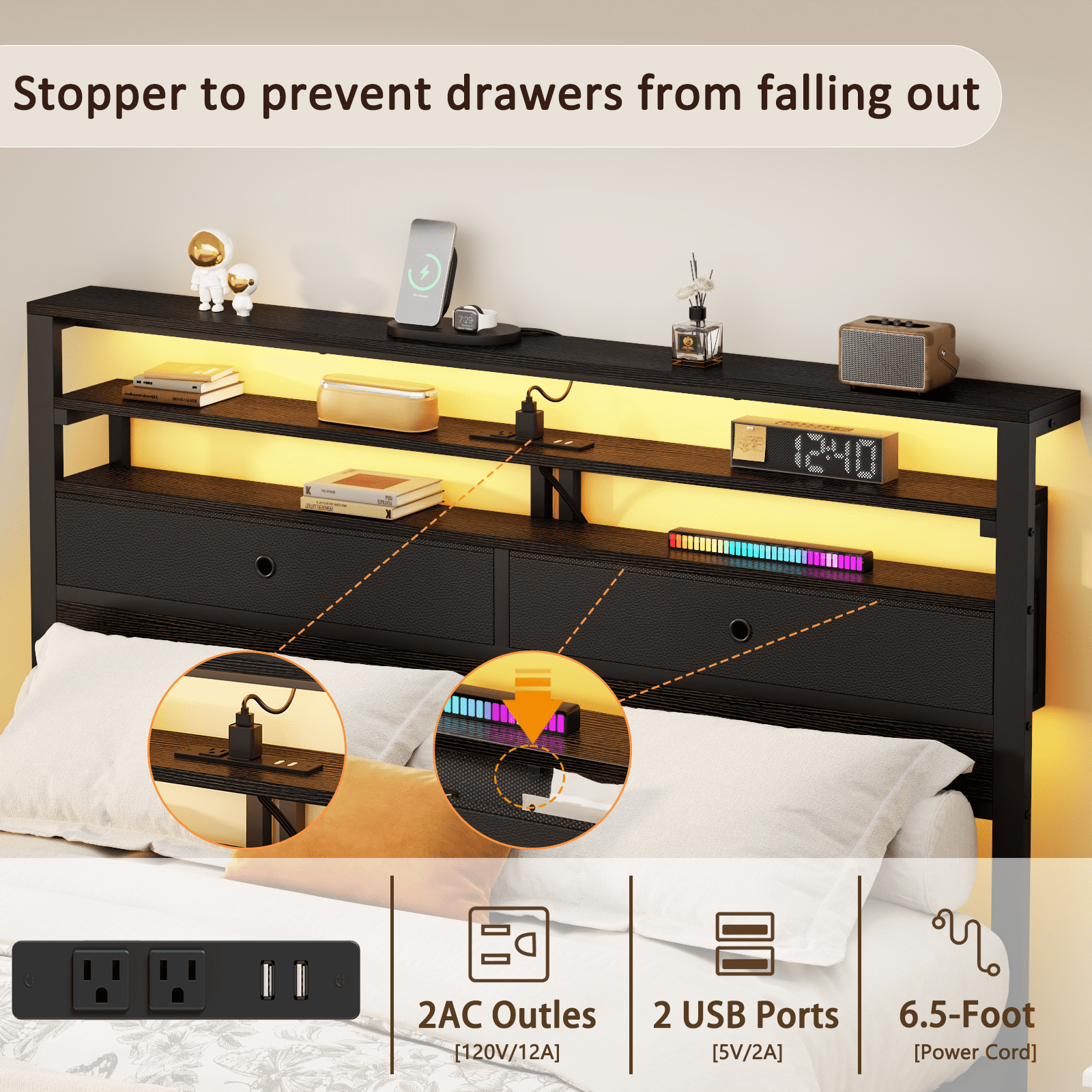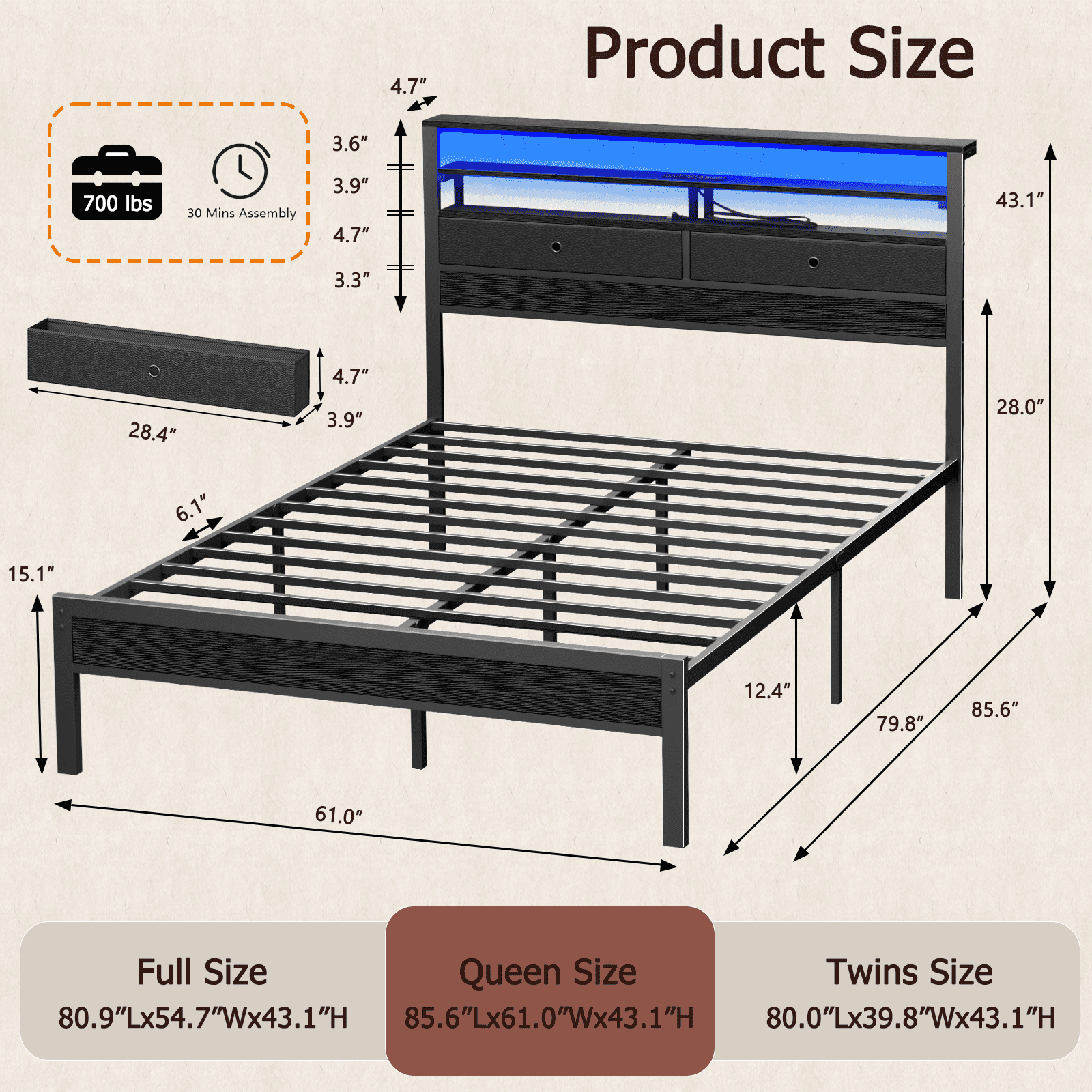 Tydimor Queen Size Bed Frame with 2 Storage Drawers Headboard, LED & Charging Station, Black oack