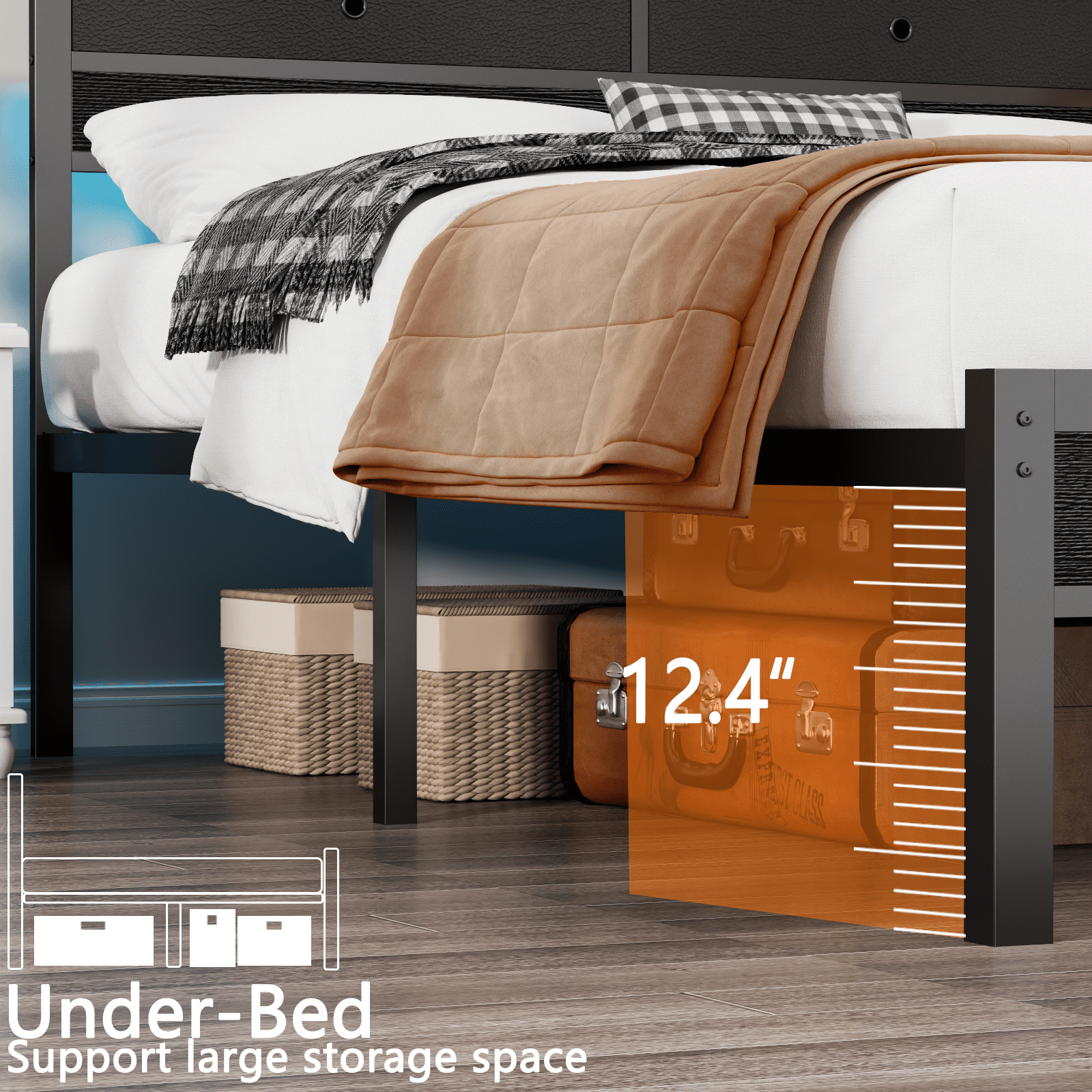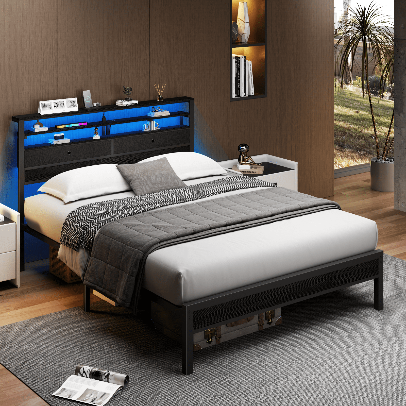 The bed frame with storage drawers can upgrade your bedroom into a modern and multifunctional storage space.This stylish and innovative bed frame is equipped with intelligent RGB LED lighting,versatile storage space,and a built-in charging station,which effectively solves the problems of tangled wires and a cluttered nightstand.Its design is able to meet the storage needs of your bedroom,perfectly integrating fashion and functionality,and creating a chic and practical space for relaxation and daily convenience.