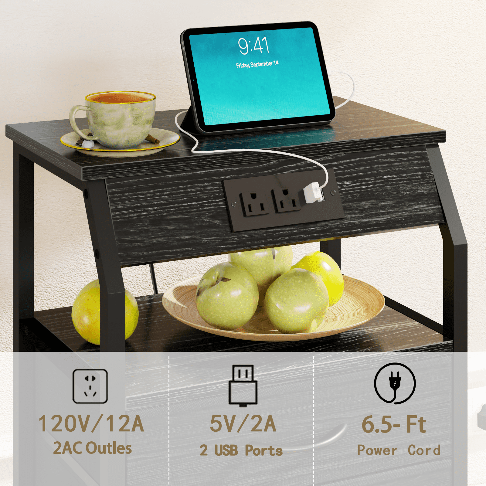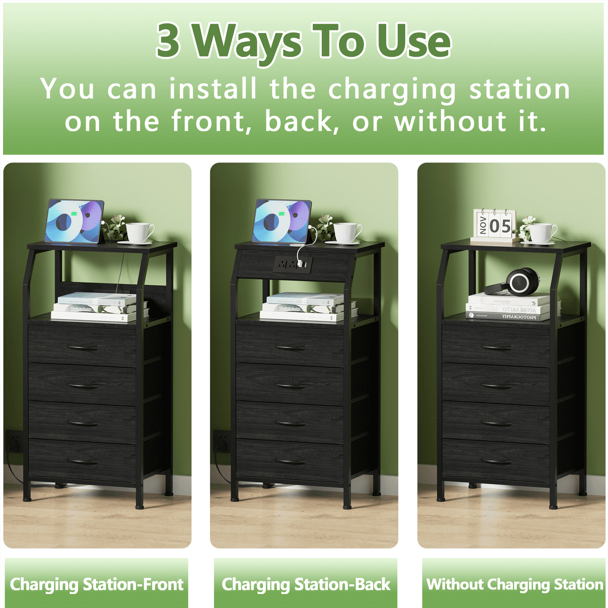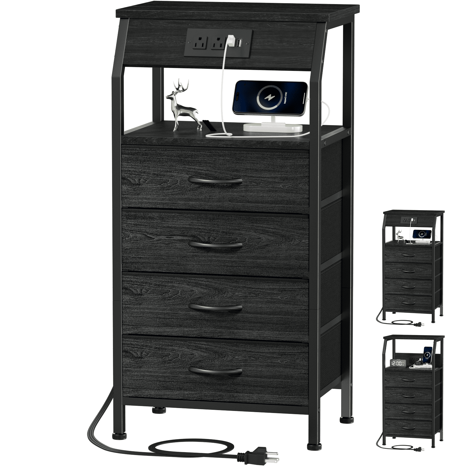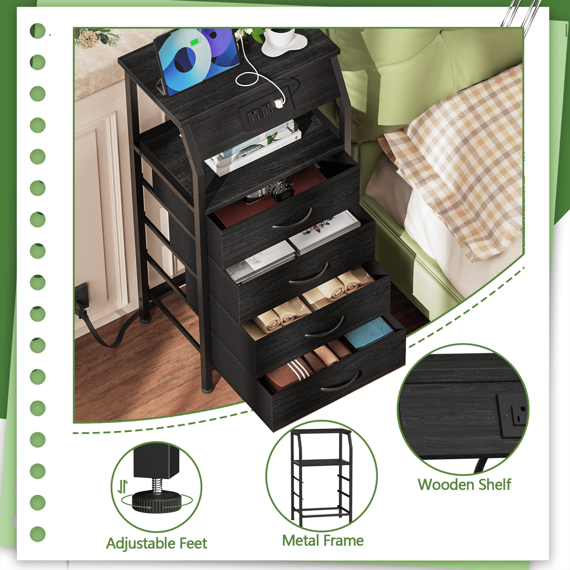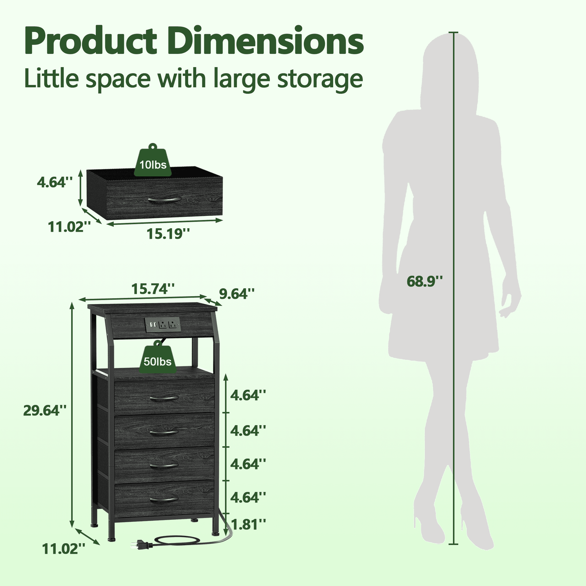TYDIMOR Small Dresser for Bedroom with Charging Station, a stylish and functional addition to your bedroom. This nightstand features two AC outlets and a 5 ft power supply cord for easy charging of smartphones, tablets, and lamps. With four spacious fabric drawers and a two-layer wooden shelf, it offers ample storage for personal items and decor. The sturdy steel frame and wood board ensure stability, supporting up to 50 lbs on the tabletop. Its compact size fits snugly into tight spaces, making it ideal for bedrooms, living rooms, or dorms. Ideal for adults, and seniors, Easy to install in just 18 minutes, the sleek black finish complements any decor. Enjoy peace of mind with 24/7 customer service. The TYDIMOR Nightstand combines style and convenience seamlessly.