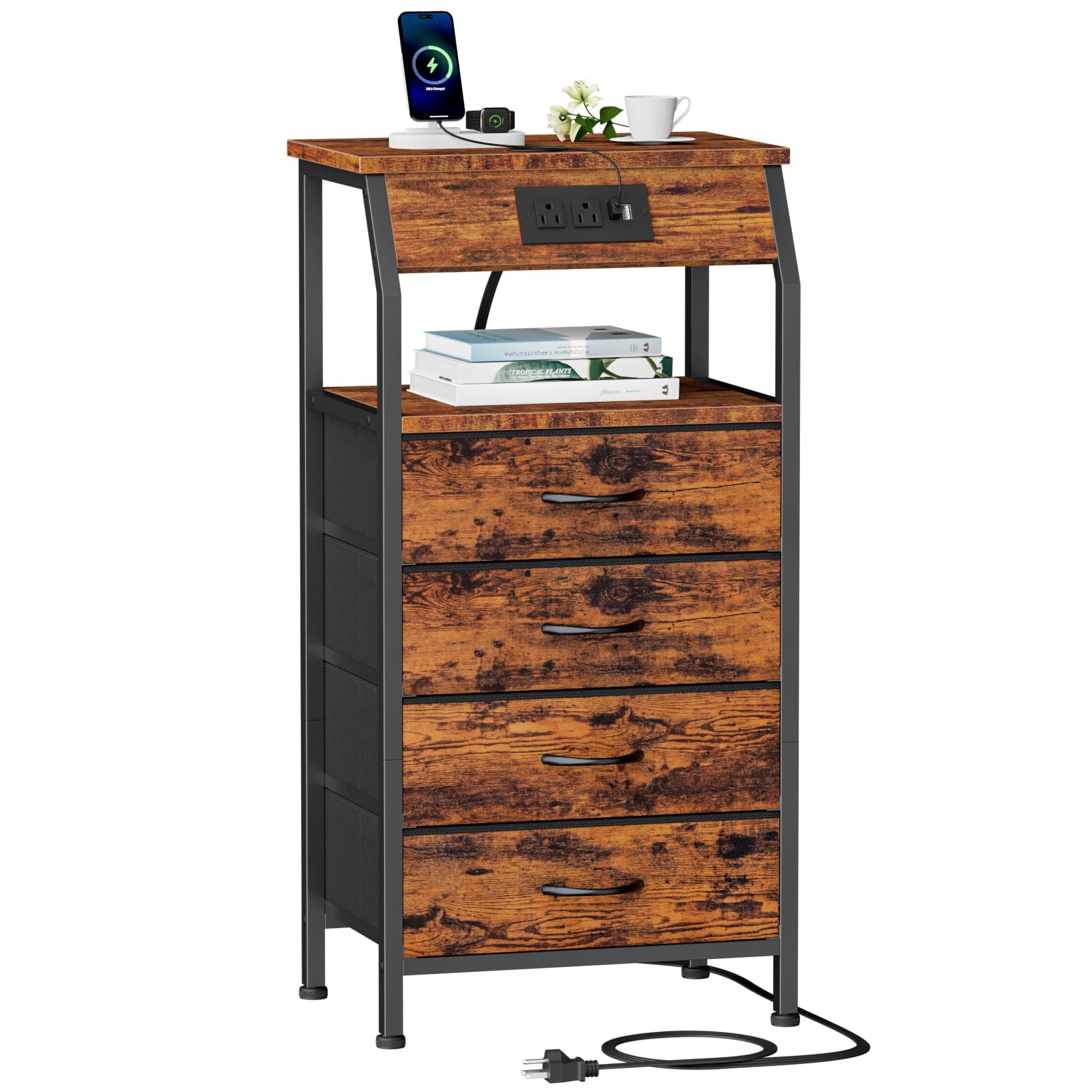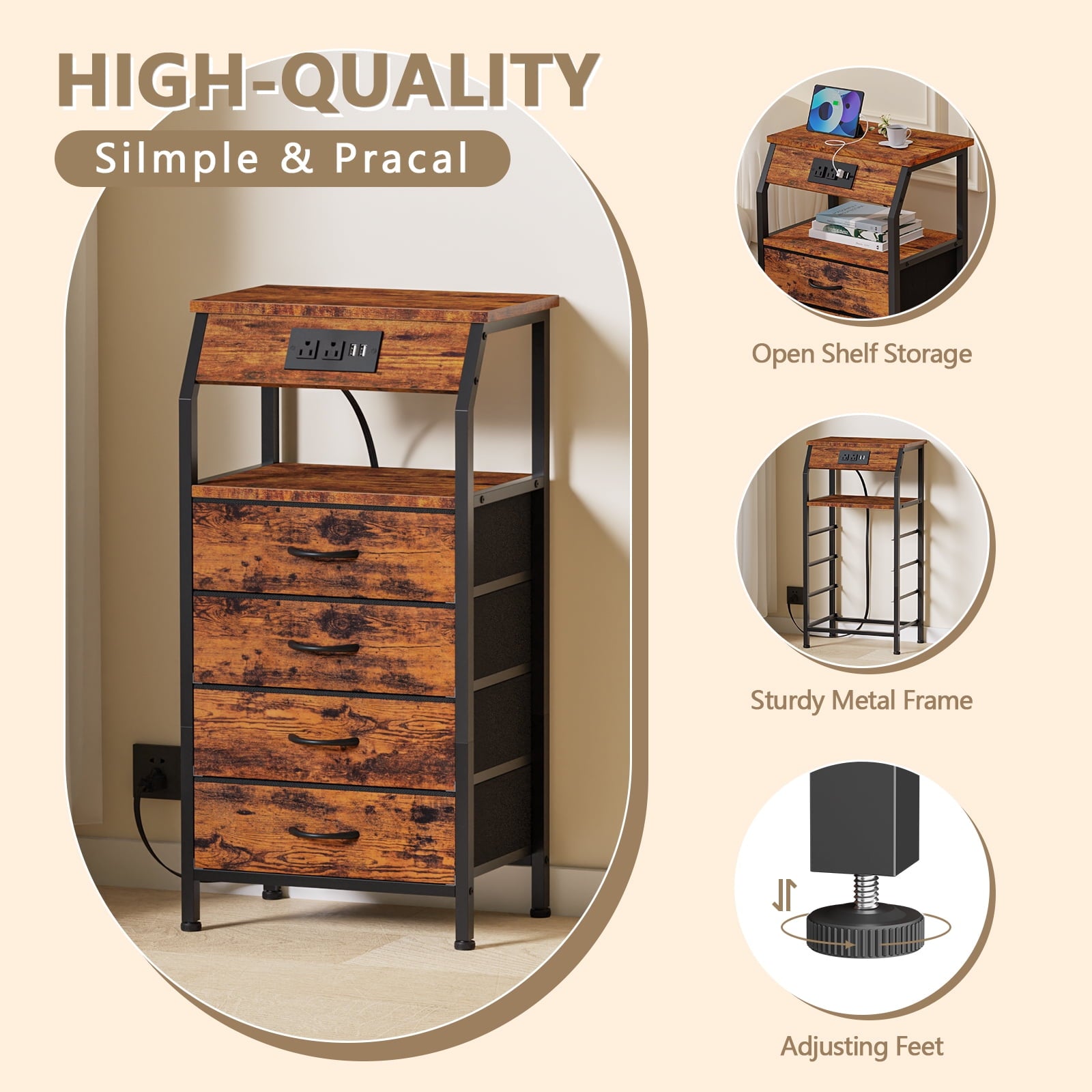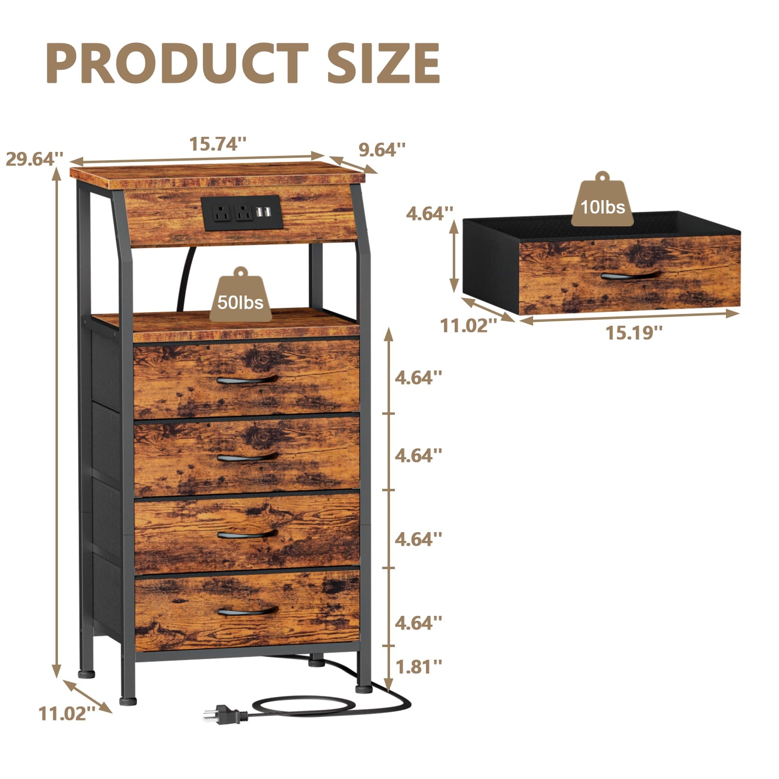 TYDIMOR Small Dresser for Bedroom with Charging Station, a stylish and functional addition to your bedroom. This nightstand features two AC outlets and a 5 ft power supply cord for easy charging of smartphones, tablets, and lamps. With four spacious fabric drawers and a two-layer wooden shelf, it offers ample storage for personal items and decor. The sturdy steel frame and wood board ensure stability, supporting up to 50 lbs on the tabletop. Its compact size fits snugly into tight spaces, making it ideal for bedrooms, living rooms, or dorms. Ideal for adults, and seniors, Easy to install in just 18 minutes, the sleek brown finish complements any decor. Enjoy peace of mind with 24/7 customer service. The TYDIMOR Nightstand combines style and convenience seamlessly.