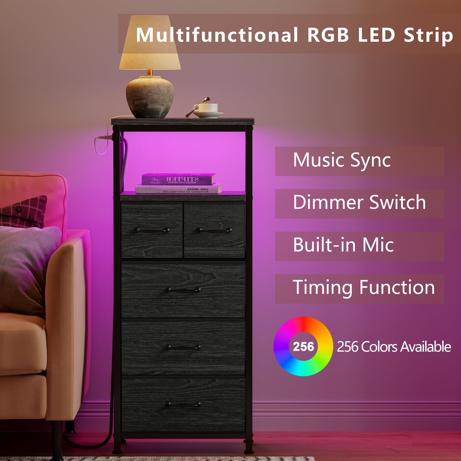This versatile dresser features a smart RGB LED with adjustable brightness and modes like Style, Music, Microphone, and Timer, perfect for setting the bedroom mood. It includes a charging station with 2 AC outlets and a 5 ft power cord to keep your devices charged. The dresser offers ample storage with 5 fabric drawers and a top wooden shelf for personal items and decor. Made with a sturdy frame and adjustable feet, it ensures stability and safety, even on uneven floors. Its compact design fits seamlessly in any room, ideal for adults. Easy to install with clear instructions and 24/7 customer service available.