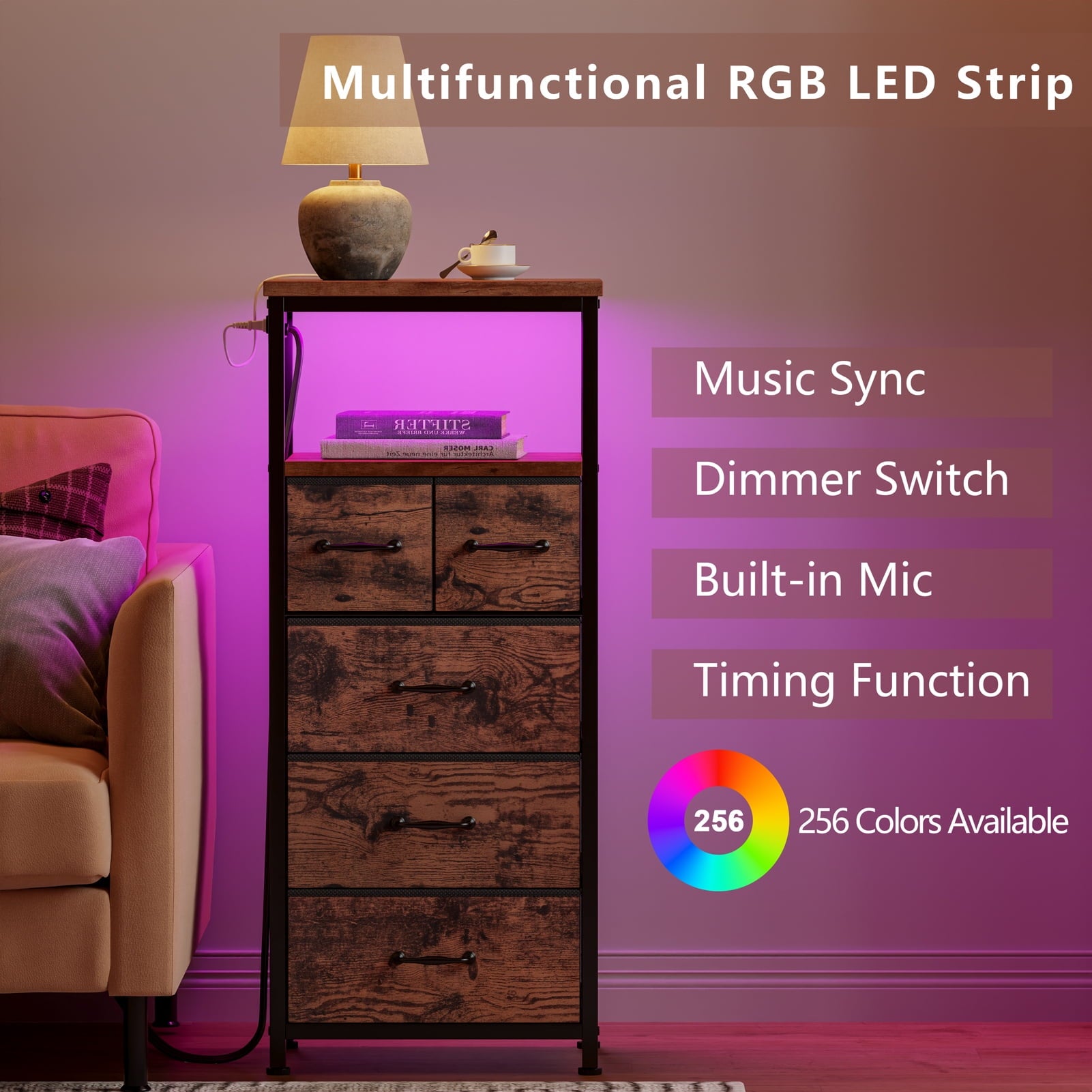 This versatile dresser features a smart RGB LED with adjustable brightness and modes like Style, Music, Microphone, and Timer, perfect for setting the bedroom mood. It includes a charging station with 2 AC outlets and a 5 ft power cord to keep your devices charged. The dresser offers ample storage with 5 fabric drawers and a top wooden shelf for personal items and decor. Made with a sturdy frame and adjustable feet, it ensures stability and safety, even on uneven floors. Its compact design fits seamlessly in any room, ideal for