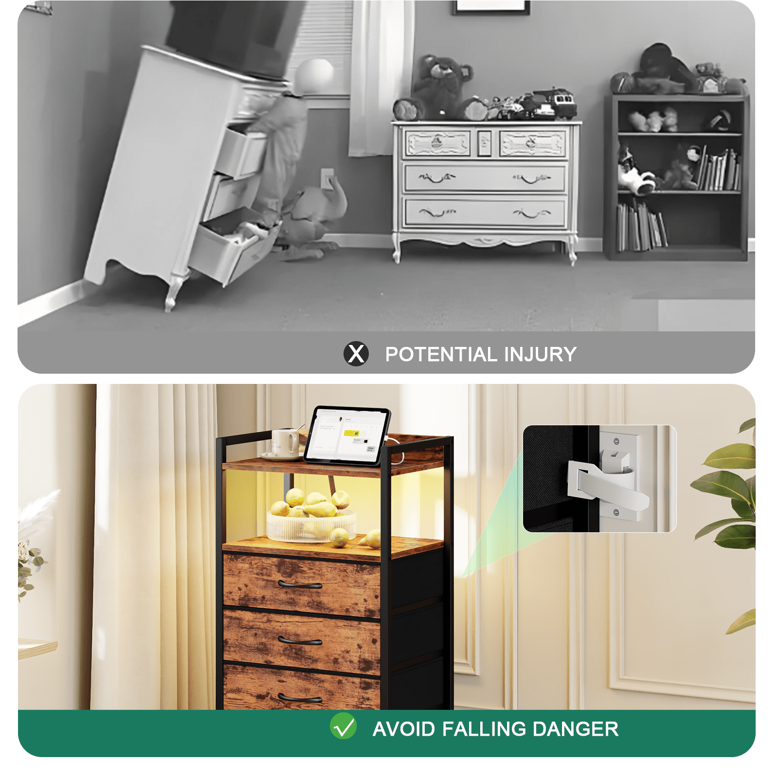 This stylish dresser features 2 AC outlets and 2 USB ports for easy device charging, along with RGB LED lights that sync with your music for a dynamic touch. Ideal for adults, it includes 5 spacious fabric drawers for organizing items like remote controls, keys, and small clothing, with a top wooden shelf for lamps and decorations. Made with a sturdy frame, wood board, and non-woven fabric, the drawers can hold up to 10 lbs, and the top can support 50 lbs. Adjustable feet enhance stability, and an anti-toppling device ensures safety.