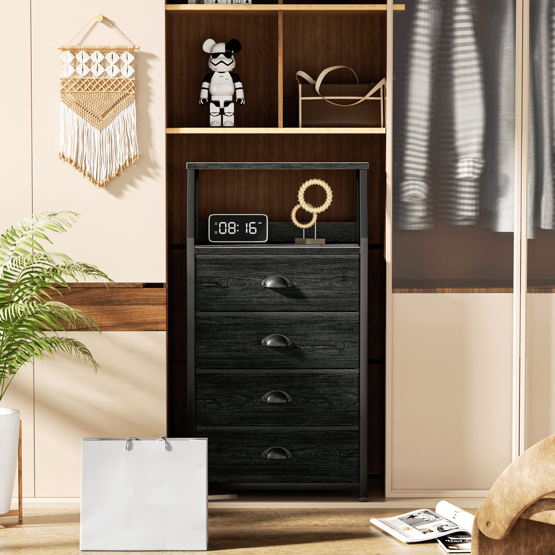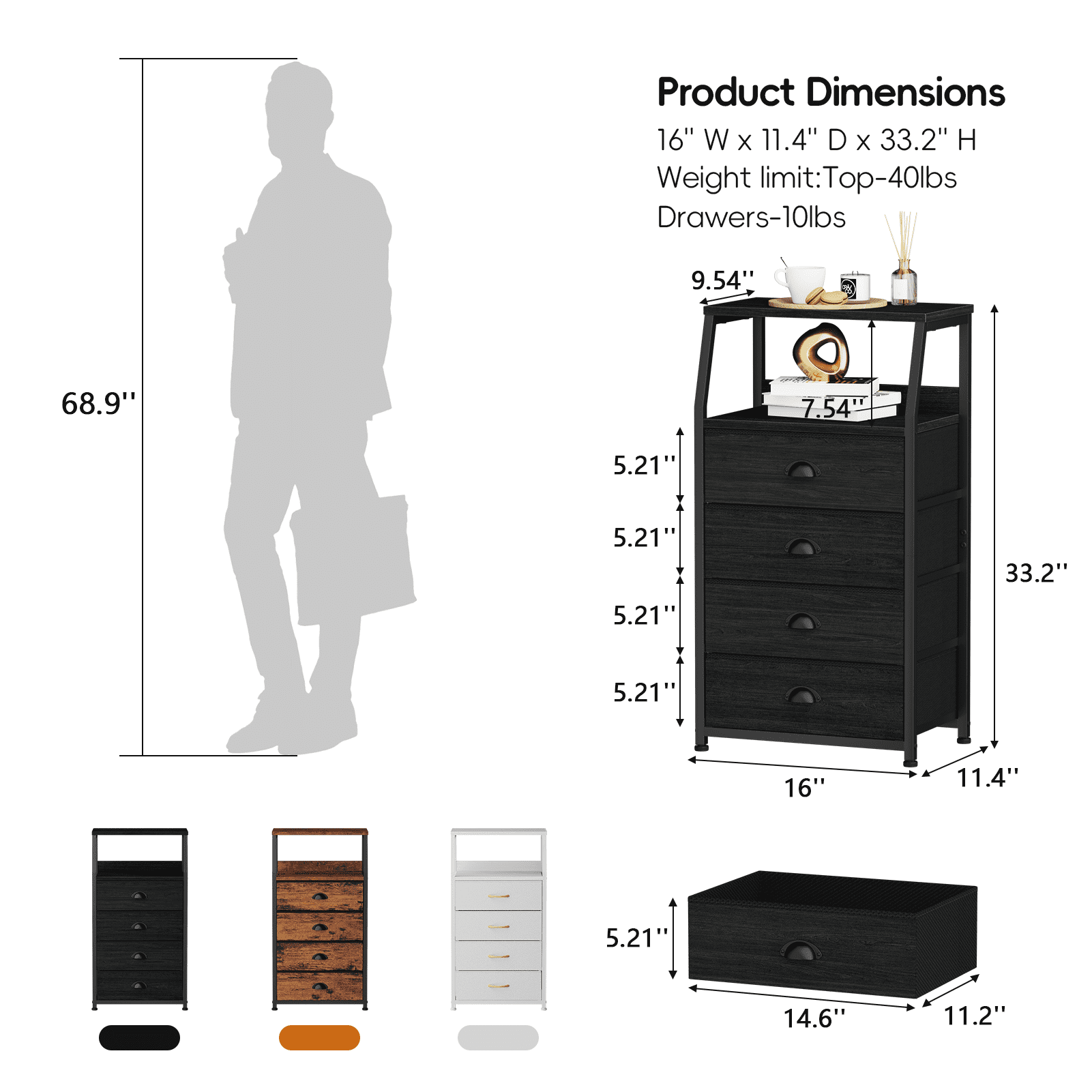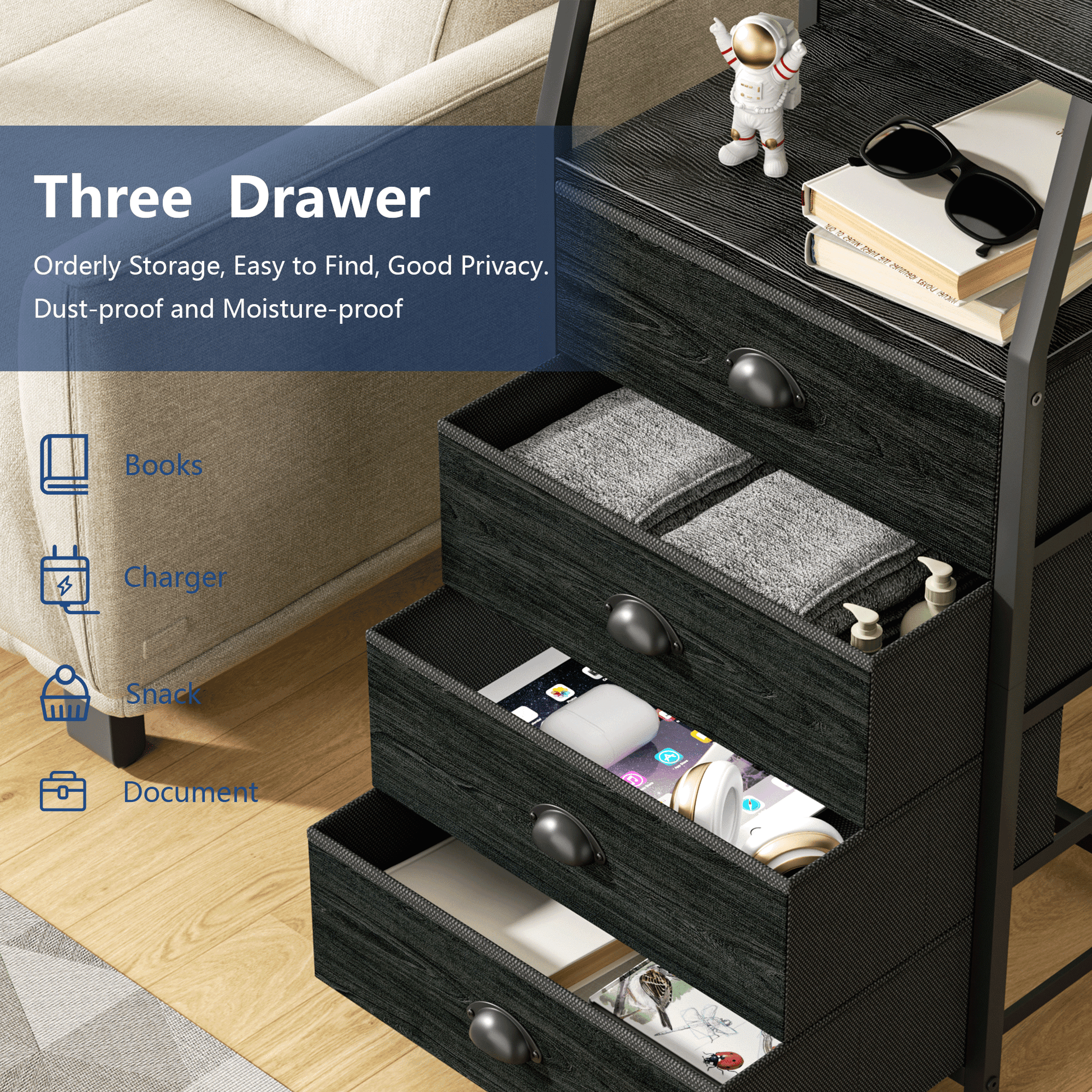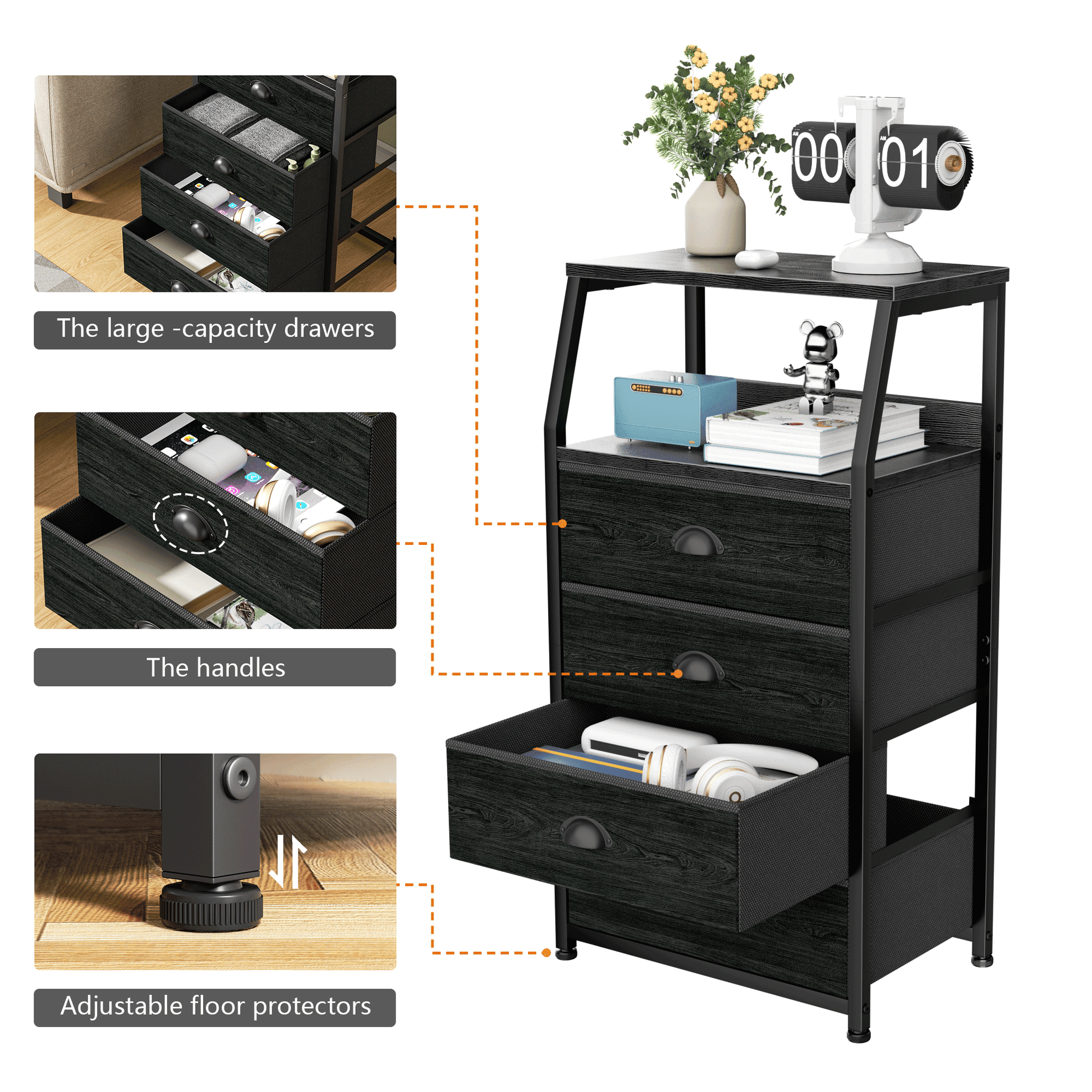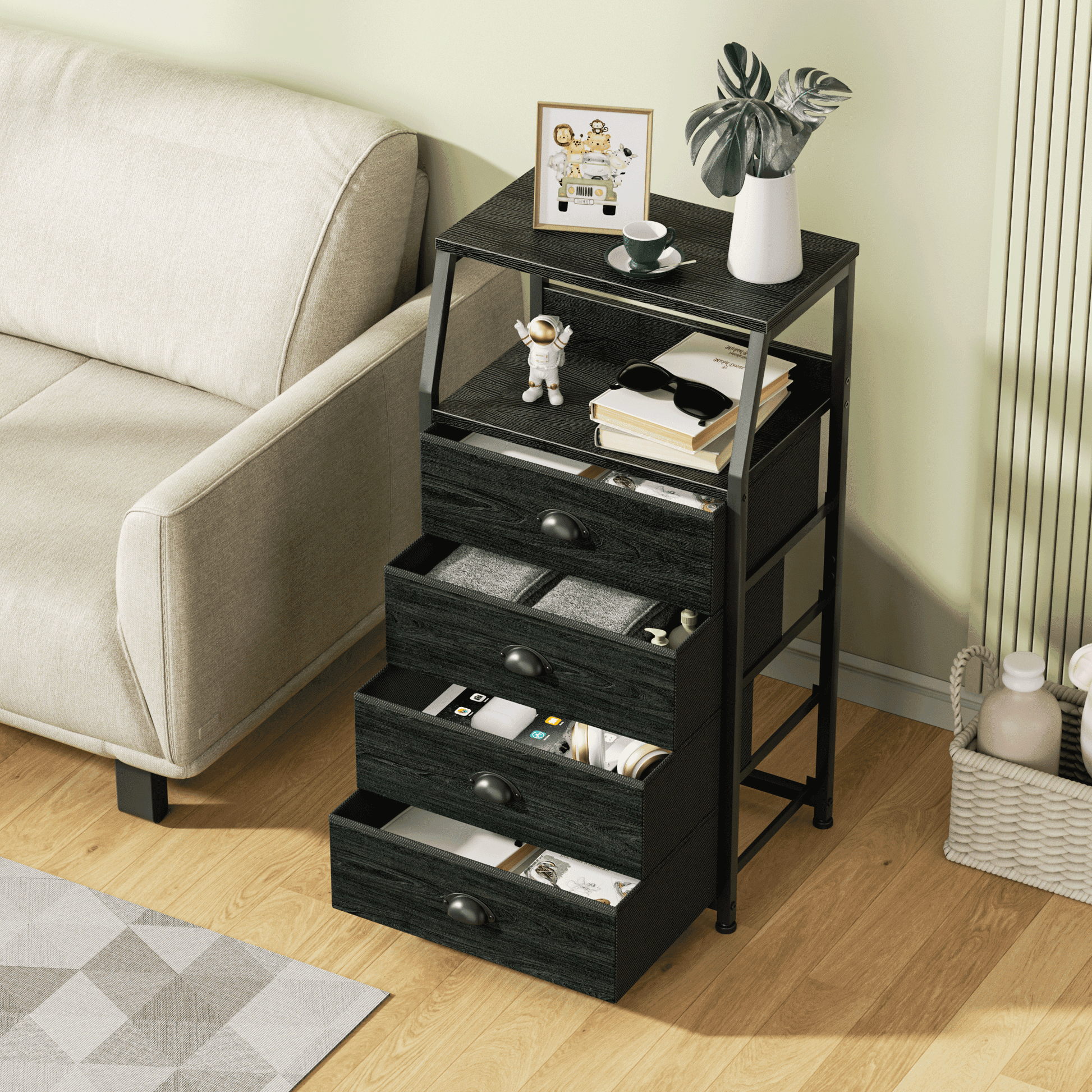 This lightweight nightstand is versatile for use in bedrooms,dorms,living rooms,and offices. Suitable for all ages,It features four spacious fabric drawers for storage and a sturdy,water-resistant wooden top for essentials. The steel frame ensures durability,with adjustable feet to protect floors and an anti-toppling device for safety. Each fabric drawer supports up to 10 lbs,and the tabletop can hold 50 lbs. Assembly takes just 10 minutes,with 24/7 customer support available. Ideal for adults.