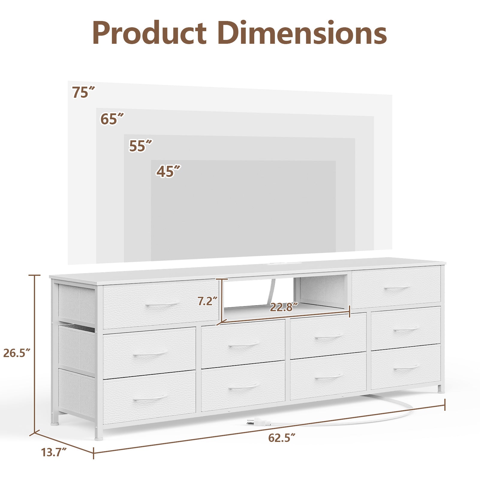 Tydimor TV Cabinet Stands for TVs up to 75", Entertainment Center with Outlet & LED, Media Console Table with 10 Drawers for Living Room, White
